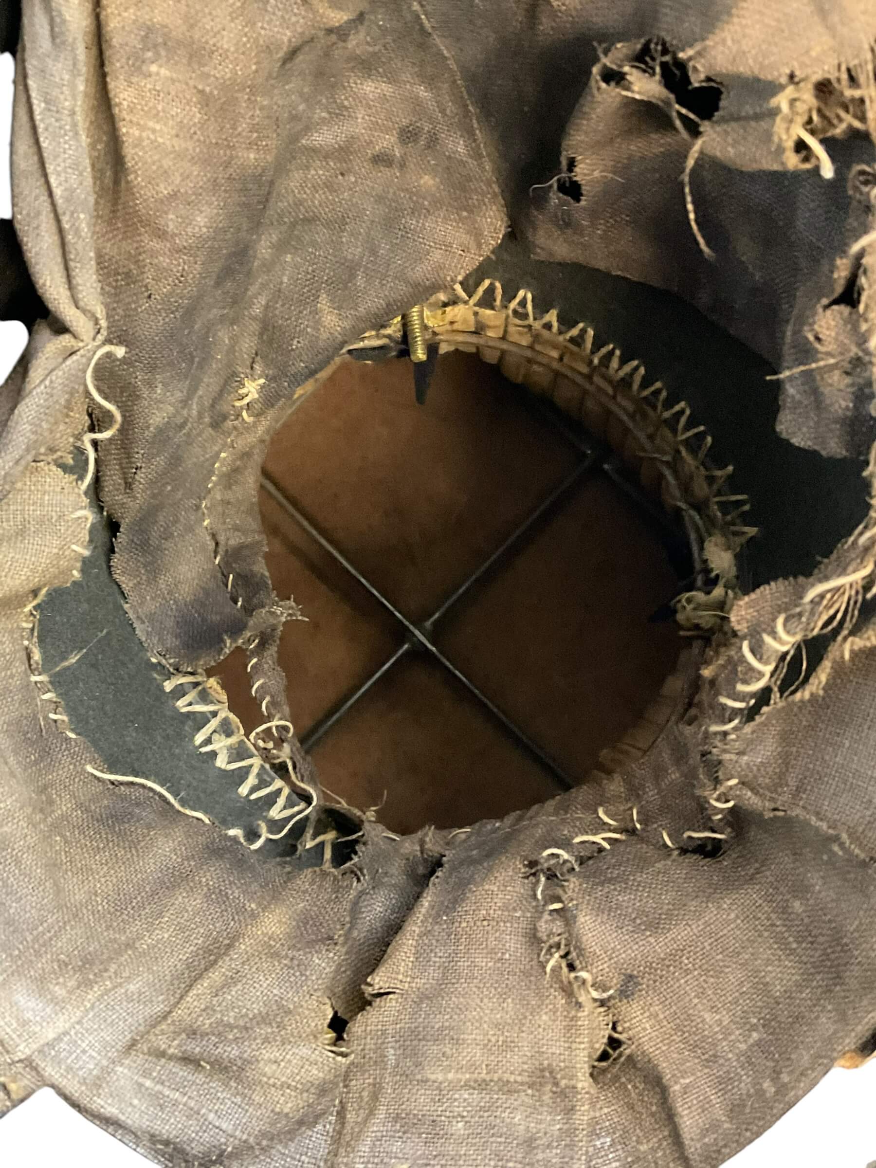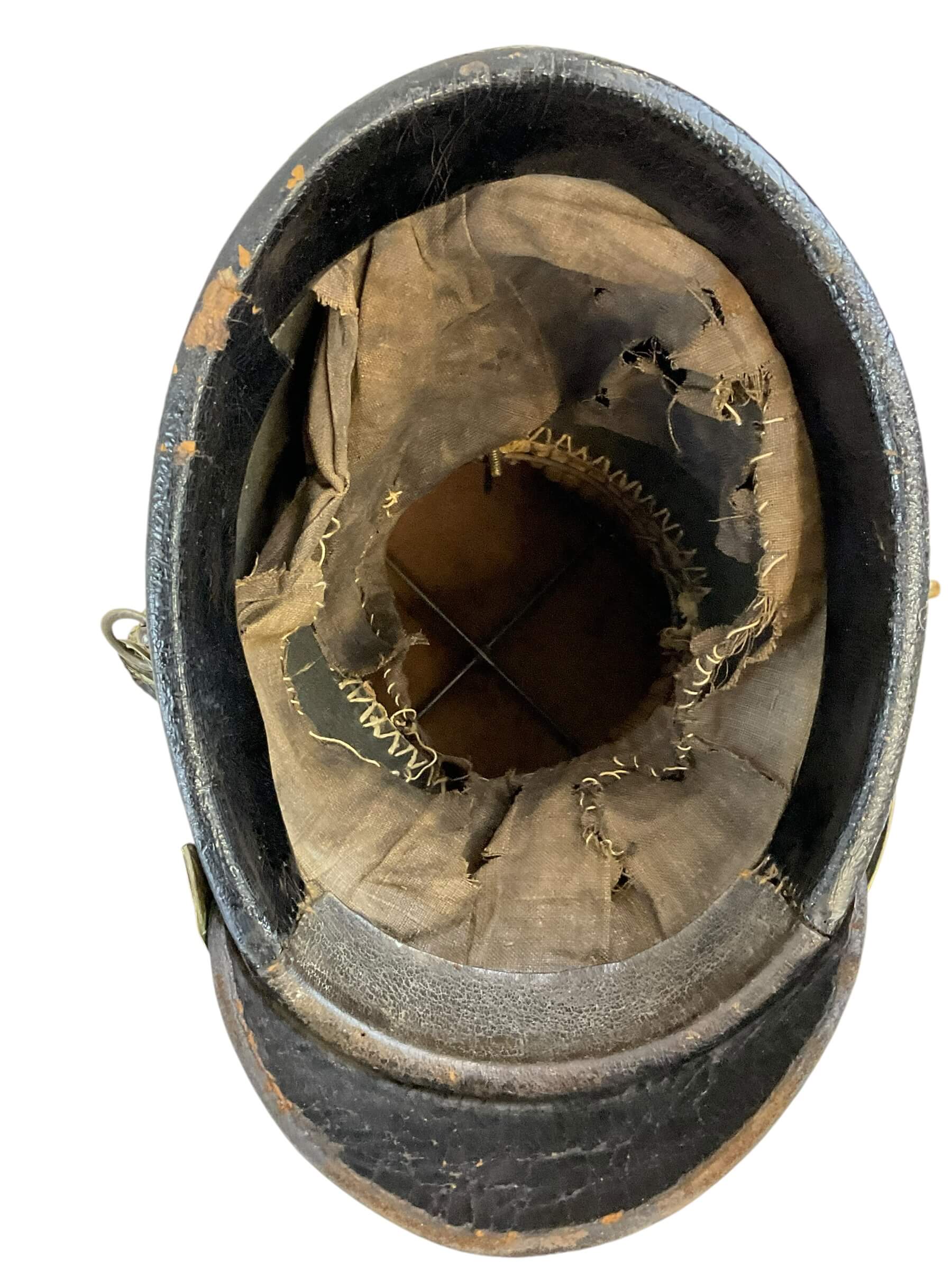 British Victorian 9th Royal Lancers Other Ranks Helmet Tschapka The leather body has typical crazing for the period of the helmet. The two tone plume is complete and shows well. The chin strap is missing the leather on it as you would expect for something of this era. The helmet plate is specific to the 9th Royal Lancers. It has a regimental button below the plume. The inside has a faint war department stamp on the very top of the crown. The cotton liner has some use and abuse to it along with some period repairs. Underneather the cotton liner and not pictured is the following information: 2869 9L 93. I assume the 93 is 1893 and the 2869 is probably the regimental number for the person who wore this helmet. 9L is obviously 9th Lancers. Great helmet in hard to get condition.