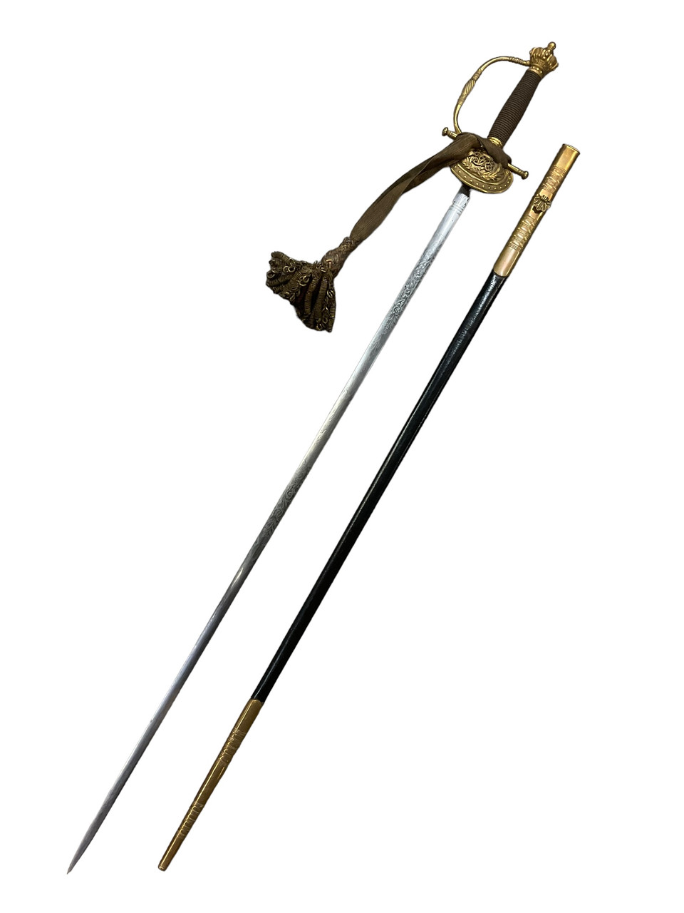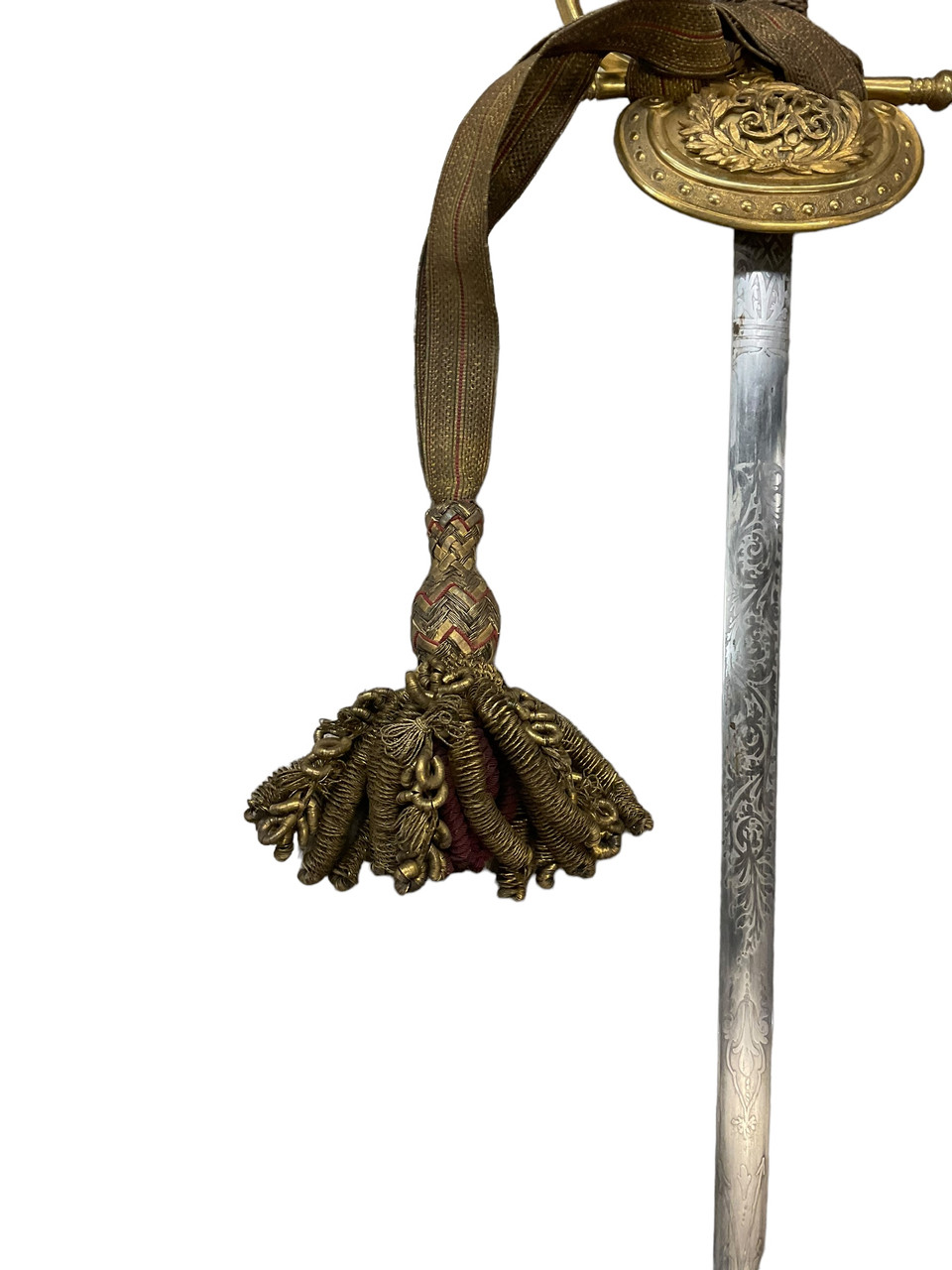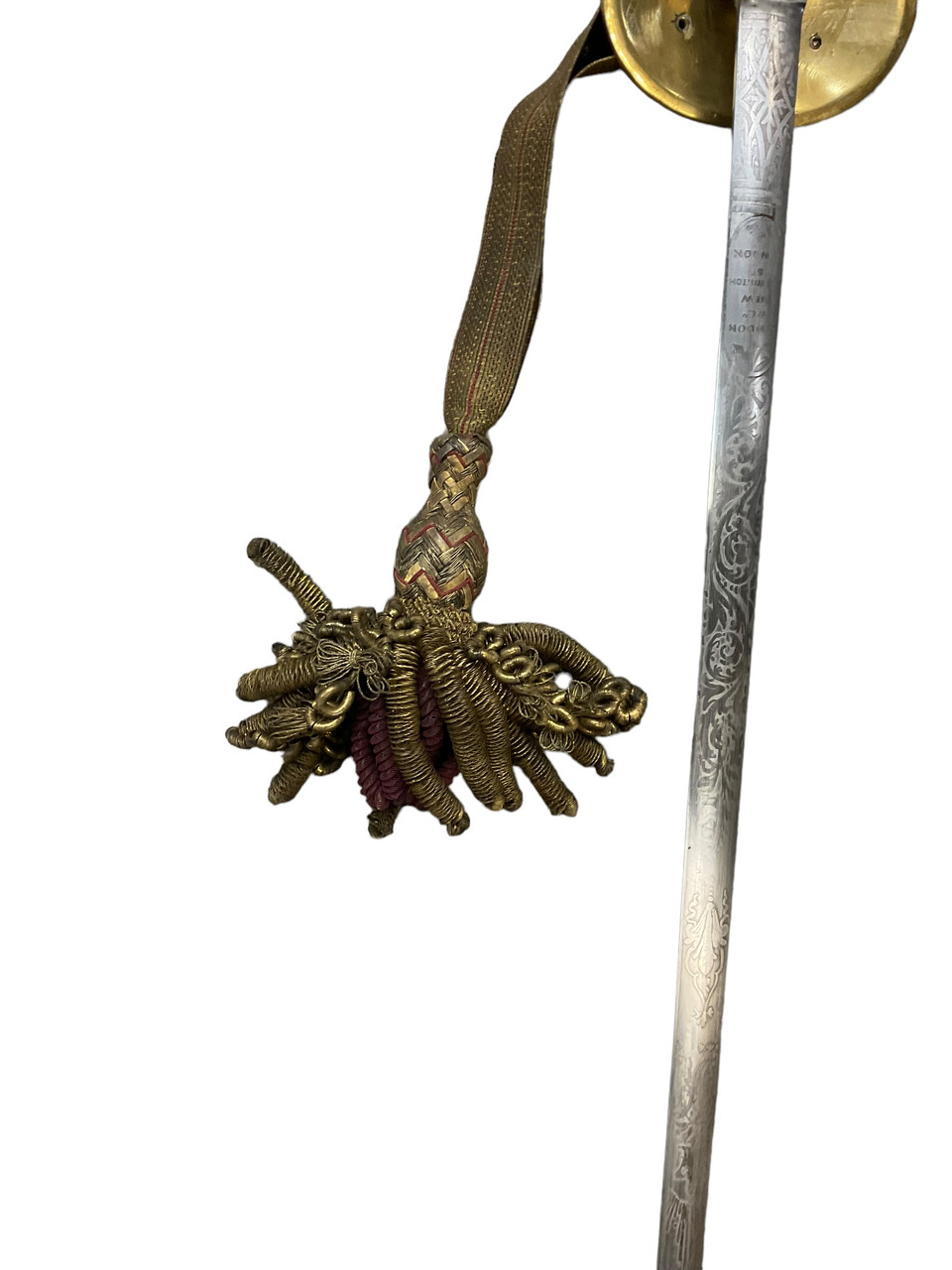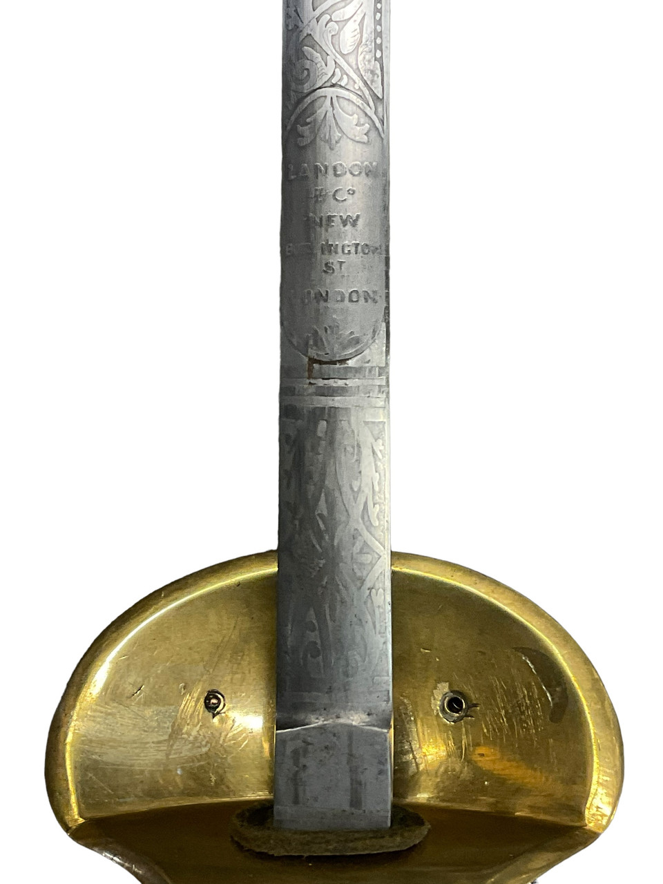 The British Victorian Court Sword with Sword Knot by Landon and Co is a distinguished piece reflective of the elegance and formality characteristic of 19th-century Britain. This ceremonial weapon, likely used by court officials or military officers, exemplifies superior craftsmanship with its sleek, finely detailed blade and intricate hilt design. The sword features a beautifully crafted, ornate handle that is both functional and aesthetically pleasing. Complementing the sword is an exquisitely woven sword knot, adding a touch of sophistication and historical authenticity. The name Landon and Co signifies a reputable maker, ensuring the quality and historical significance of the piece. Whether for collection or display, this court sword offers a glimpse into the regal customs of the Victorian era and stands as a testament to the period’s commitment to artistry and ceremonial precision.
