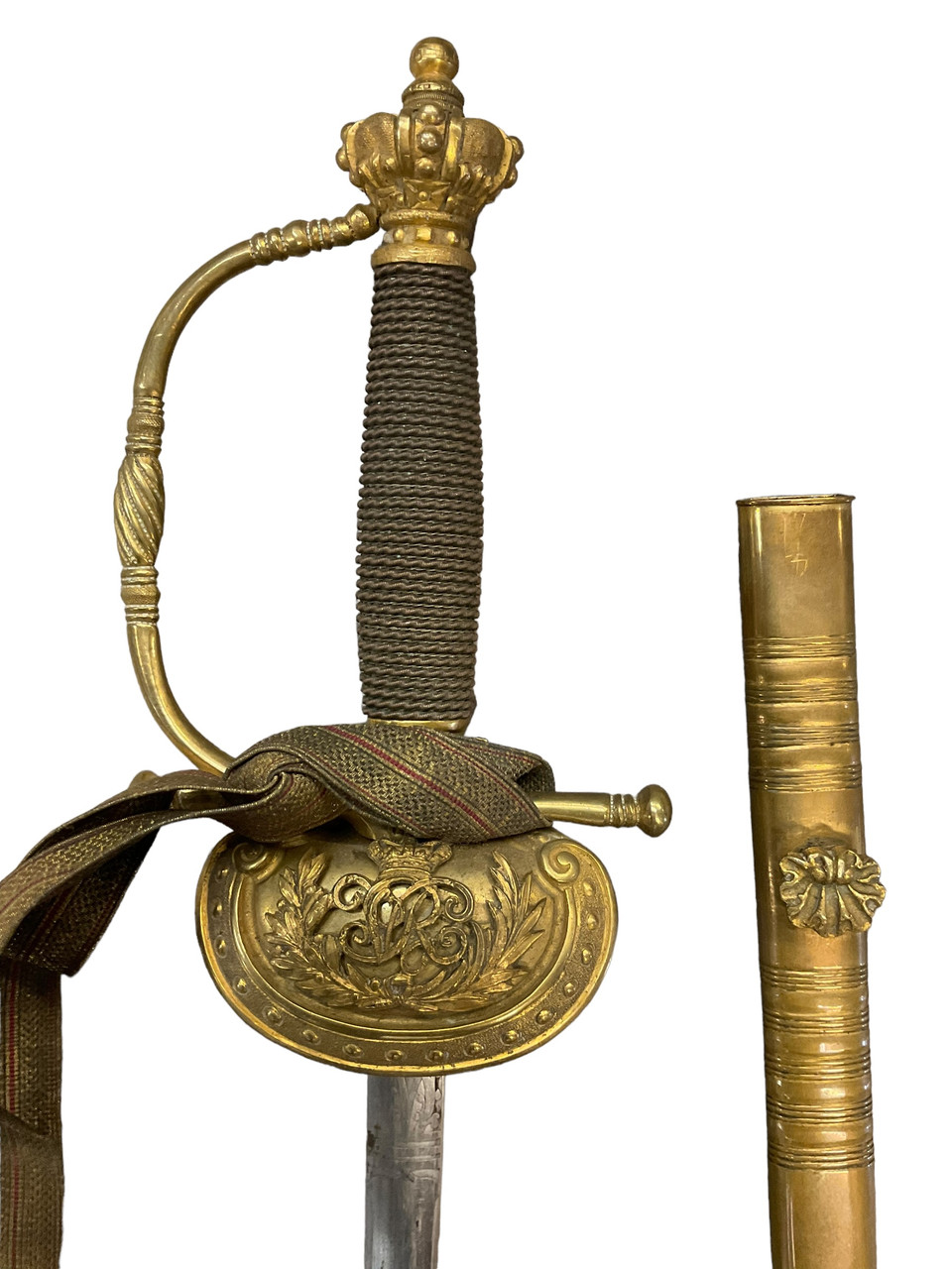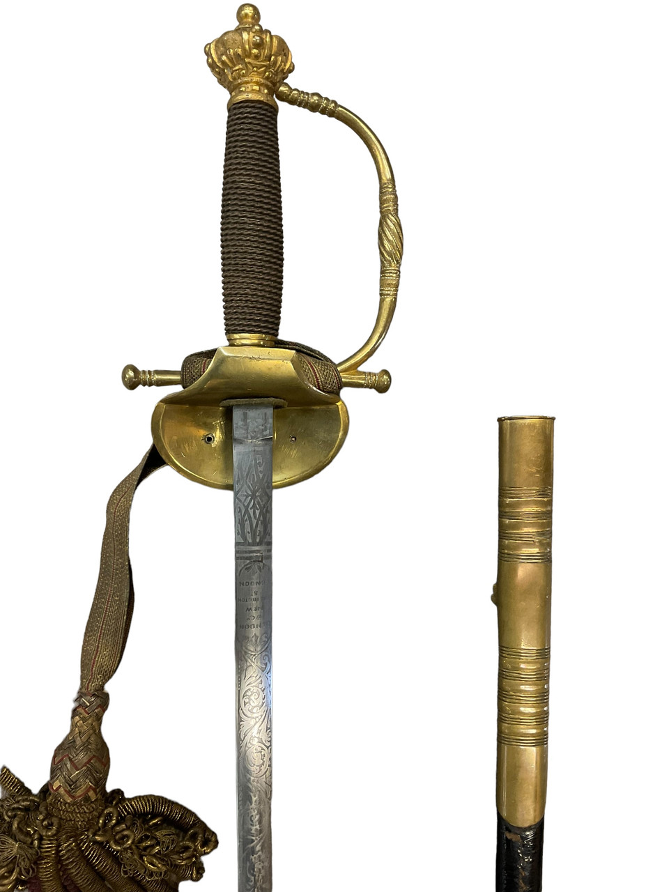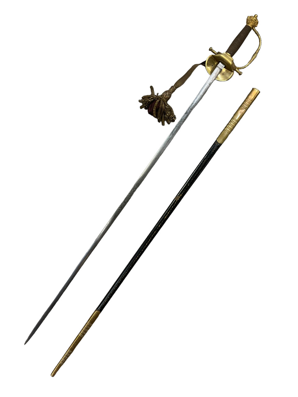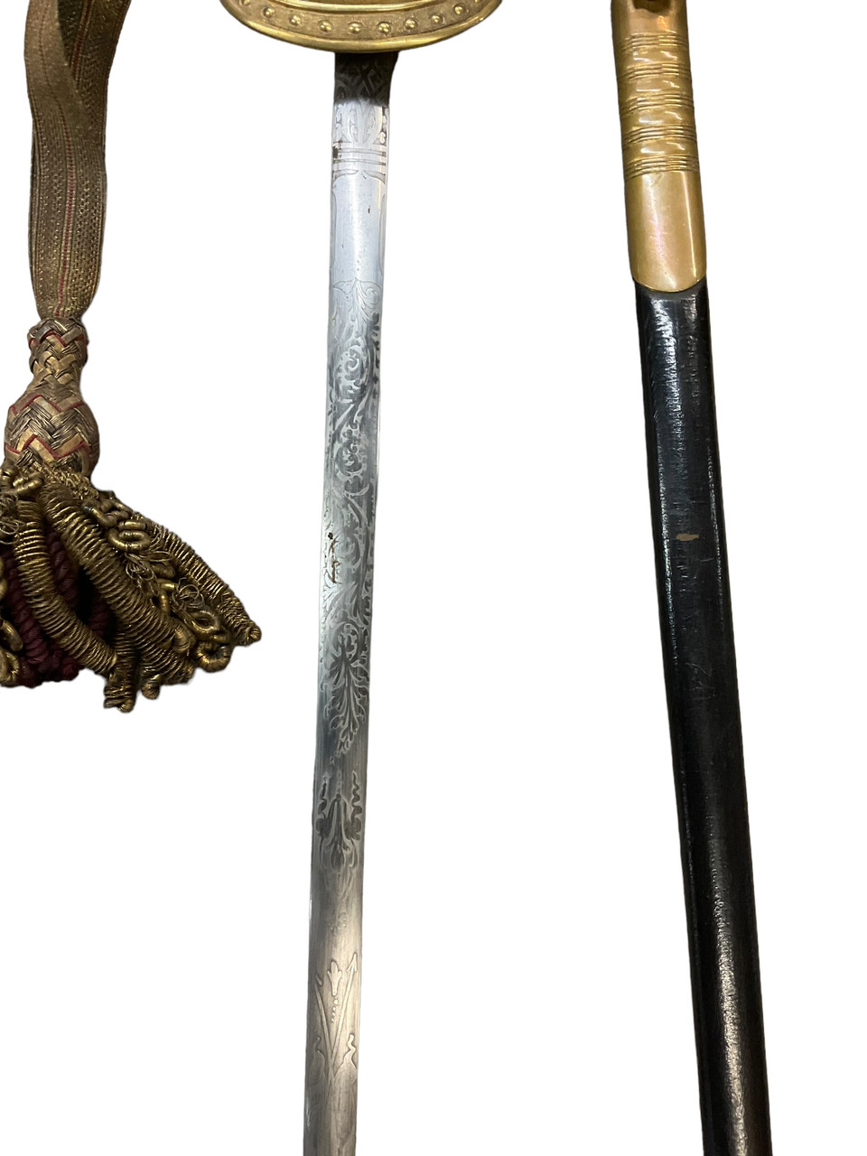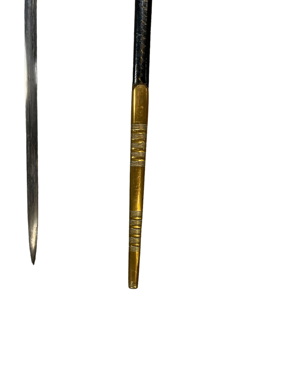 The British Victorian Court Sword with Sword Knot by Landon and Co is a distinguished piece reflective of the elegance and formality characteristic of 19th-century Britain. This ceremonial weapon, likely used by court officials or military officers, exemplifies superior craftsmanship with its sleek, finely detailed blade and intricate hilt design. The sword features a beautifully crafted, ornate handle that is both functional and aesthetically pleasing. Complementing the sword is an exquisitely woven sword knot, adding a touch of sophistication and historical authenticity. The name Landon and Co signifies a reputable maker, ensuring the quality and historical significance of the piece. Whether for collection or display, this court sword offers a glimpse into the regal customs of the Victorian era and stands as a testament to the period’s commitment to artistry and ceremonial precision.