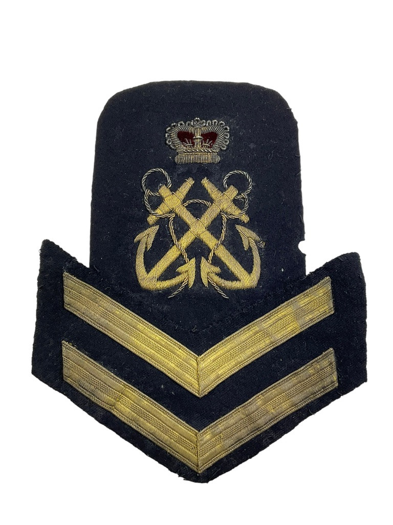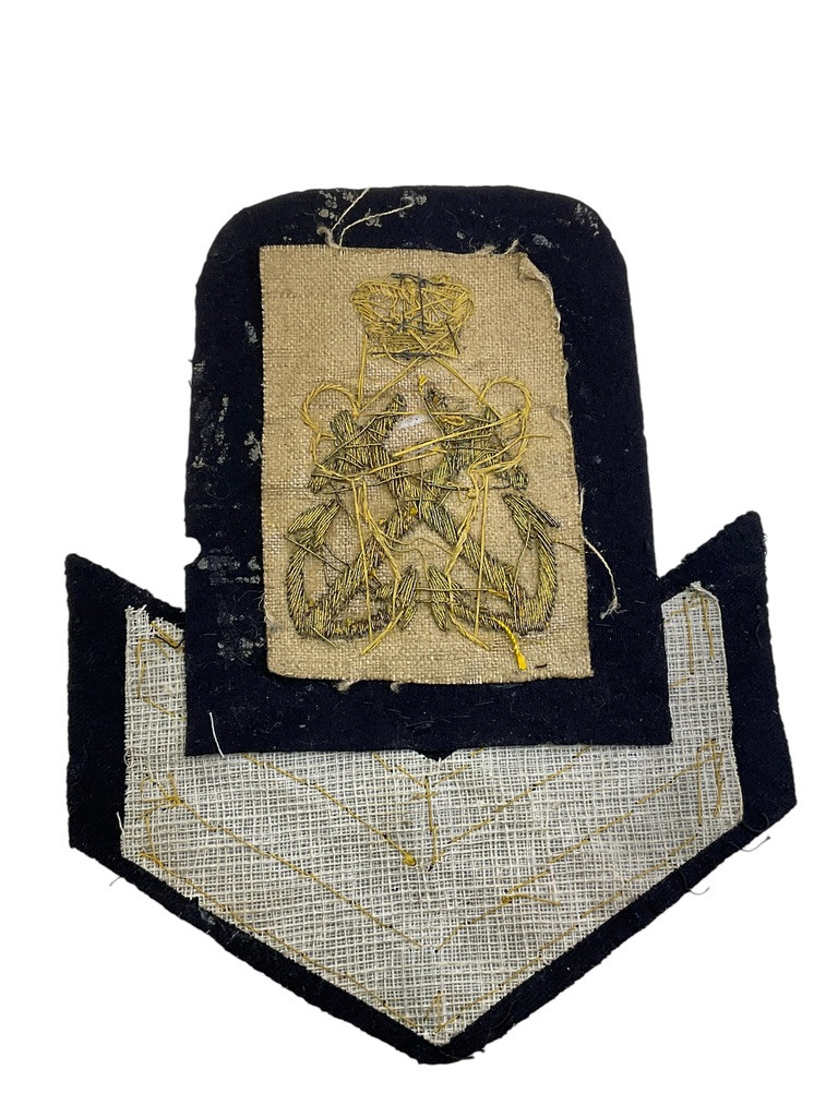 The “British Victorian Royal Navy Petty Officer Rank Insignia” refers to the distinctive symbols used to denote the ranks of petty officers in the Royal Navy during the Victorian era (1837-1901). These insignias were intricately designed and embroidered onto uniforms, serving as a visual representation of authority and expertise within the naval hierarchy. Typically crafted from gold or silver thread, they included various emblems such as anchors, crowns, and crossed branches, each element conveying specific information about the rank and role of the officer. These insignias were not merely decorative; they played a crucial role in maintaining order and discipline aboard ships by clearly indicating leadership and experience. Collectors and historians of military memorabilia highly value these pieces for their craftsmanship and historical significance, providing insights into the naval traditions and values of the Victorian period.