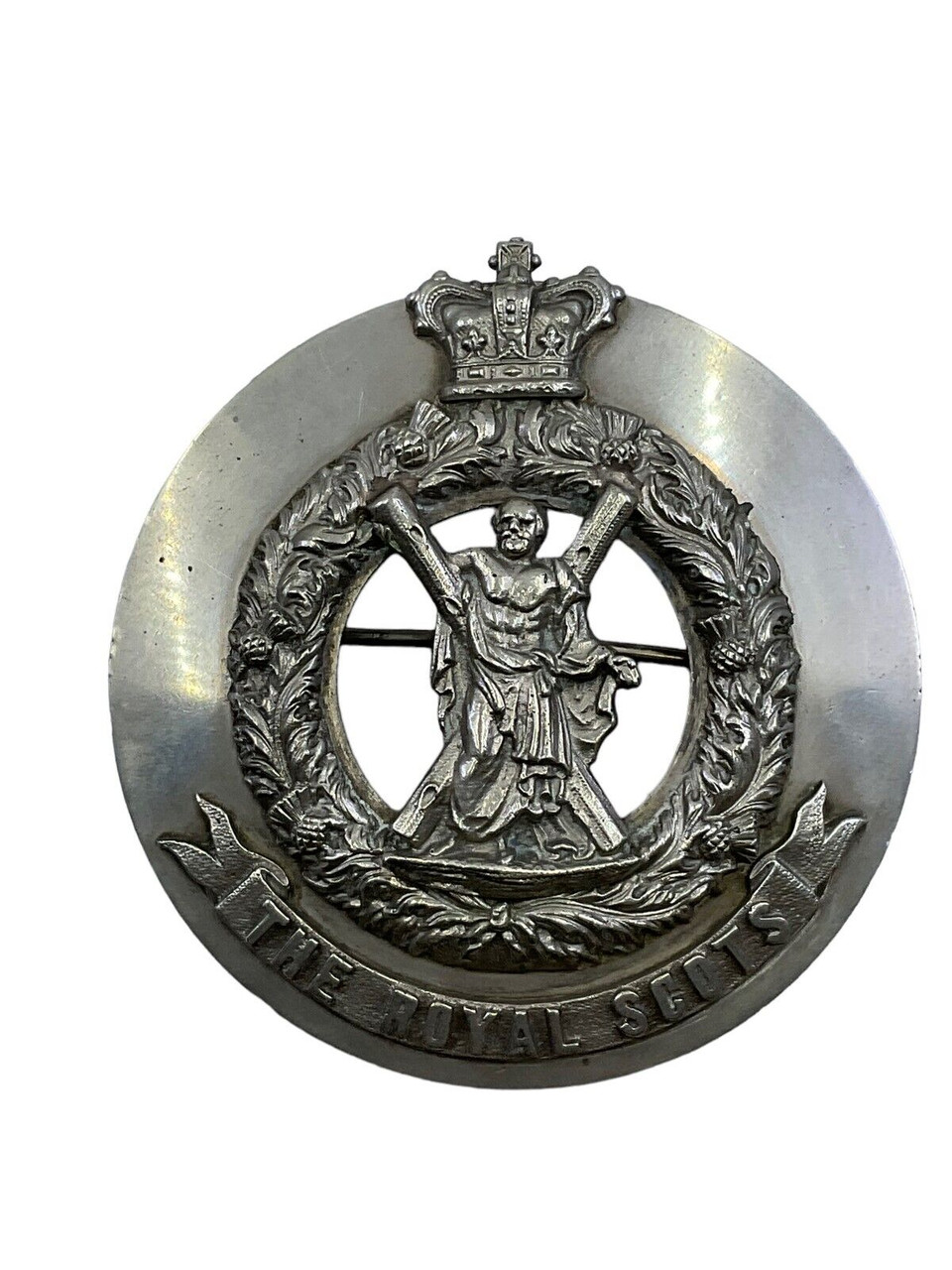This exquisite British Victorian Royal Scots Plaid Brooch is a stunning vintage piece that measures an impressive 4 1/4 inches. Steeped in history, this brooch embodies the elegance and craftsmanship of the Victorian era, making it a must-have for collectors and history enthusiasts alike. The intricate design showcases the rich heritage of the Royal Scots, with meticulous attention to detail that highlights its timeless beauty. Whether adorning your plaid or serving as a statement accessory, this brooch is both a tribute to Scottish pride and a testament to Victorian artistry. Its vintage charm adds a touch of antiquity, making it a perfect piece to enhance any collection or to wear on special occasions.