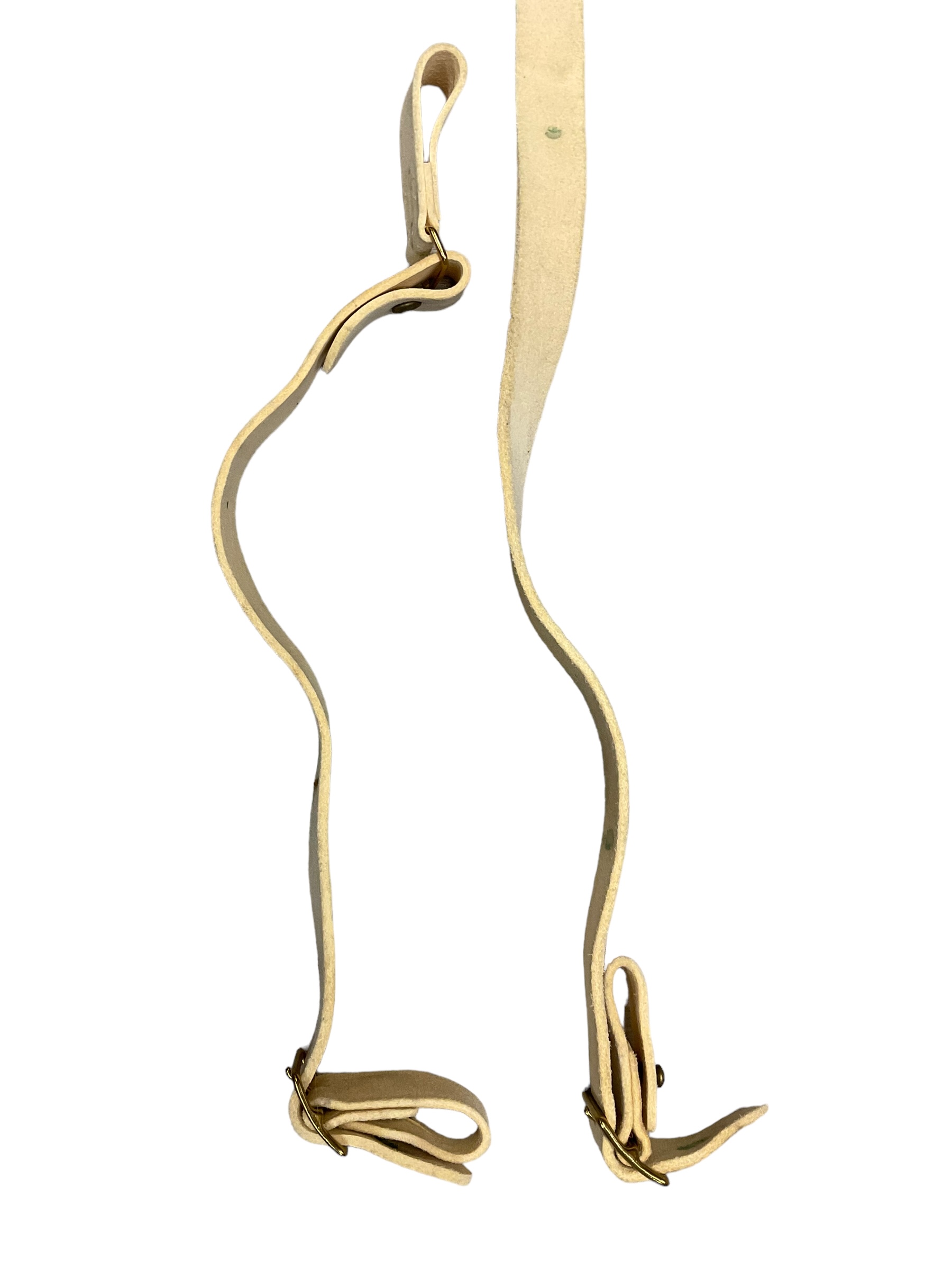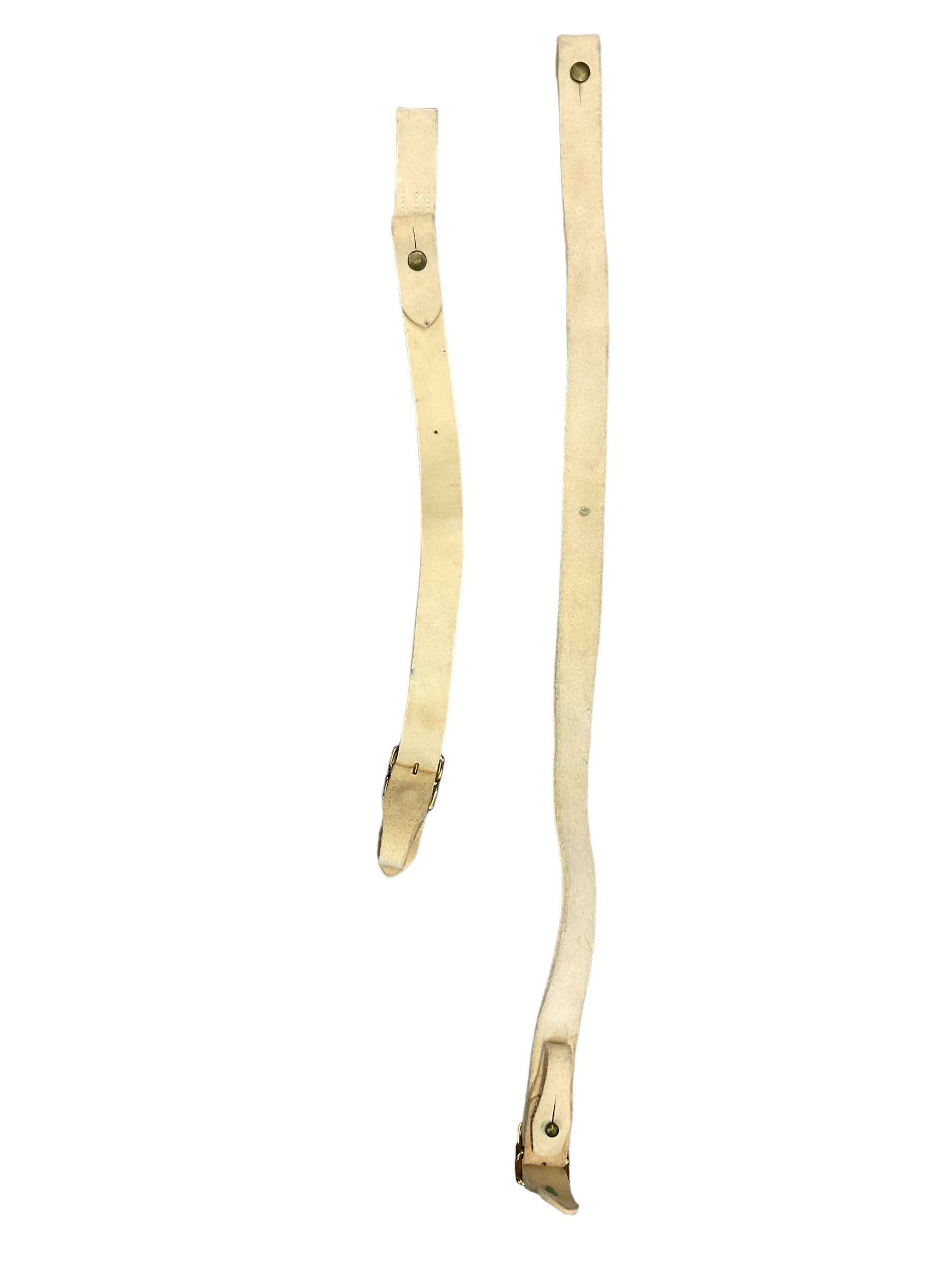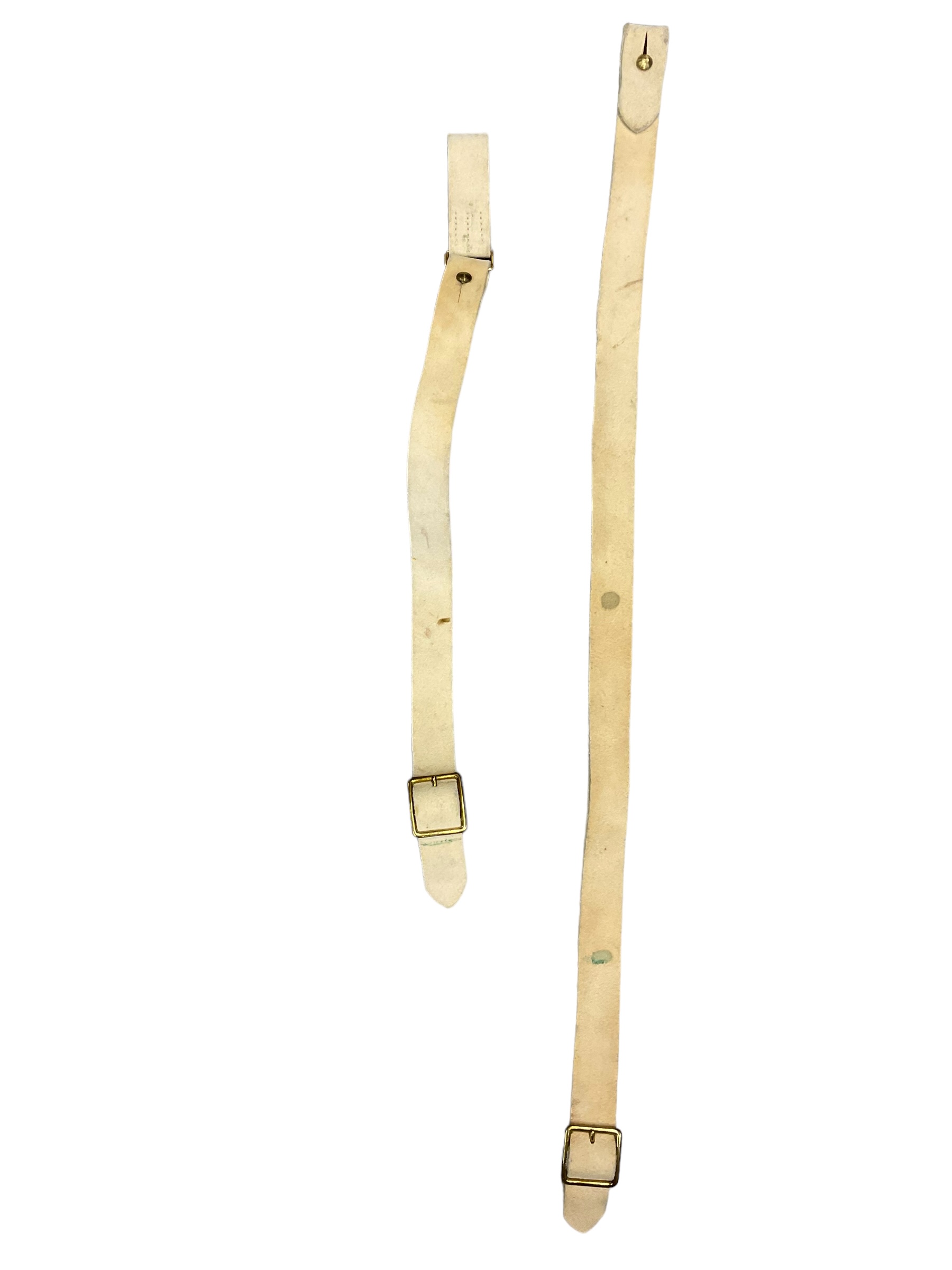 The British Victorian White Buff Leather Sword Slings Pair is an exquisite set of historical accessories from the Victorian era, meticulously crafted to meet the high standards of military elegance and functionality. These slings are made from durable white buff leather, which not only provides strength and flexibility but also adds a touch of classic sophistication. Each sling in the pair is designed to securely hold a sword, ensuring it is both accessible and safely stowed. The leather is tanned and treated to achieve a pristine appearance that complements the formal uniforms of the time. These sword slings are ideal for collectors of military memorabilia, historians, or enthusiasts of Victorian-era craftsmanship. They offer a tangible connection to the past, reflecting the meticulous attention to detail and high-quality materials that were characteristic of British military gear during the 19th century.