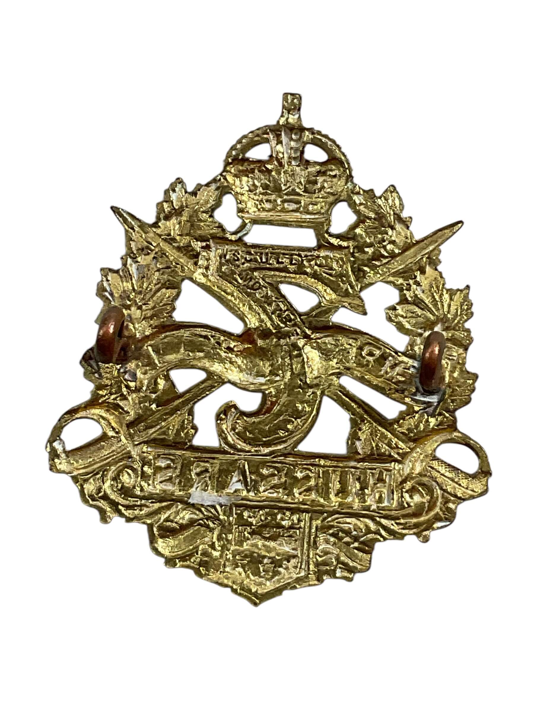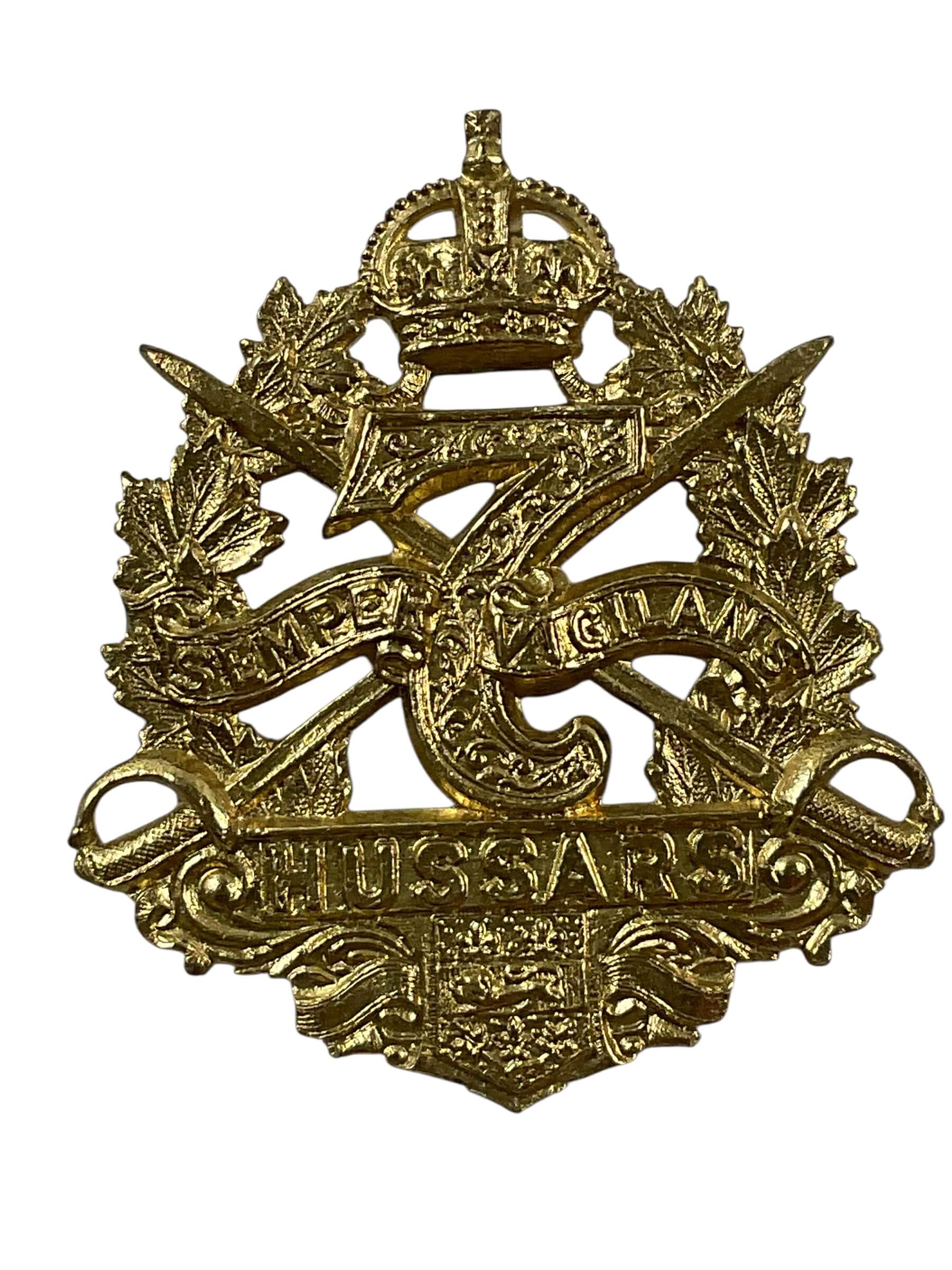 The Canadian 7th Hussars Cap Badge is a metal insignia associated with the 7th Hussars, a regiment of the Canadian Militia. This badge typically features a gilt or brass construction, with a central motif often displaying the regimental number “7” encircled by a laurel or wreath design. Above the central element, a crown is usually depicted, indicating allegiance to the British Crown during the period of service. The scroll at the base bears the regiment’s title, “7th Hussars,” and sometimes includes the word “Canada.” The cap badge was worn on headdress as part of the regimental uniform, serving as a symbol of unit identity and pride. The 7th Hussars trace their origins to the 19th century and were primarily a cavalry unit before later amalgamations. This cap badge represents a tangible link to Canadian military history, specifically the traditions of colonial and early Canadian cavalry regiments.