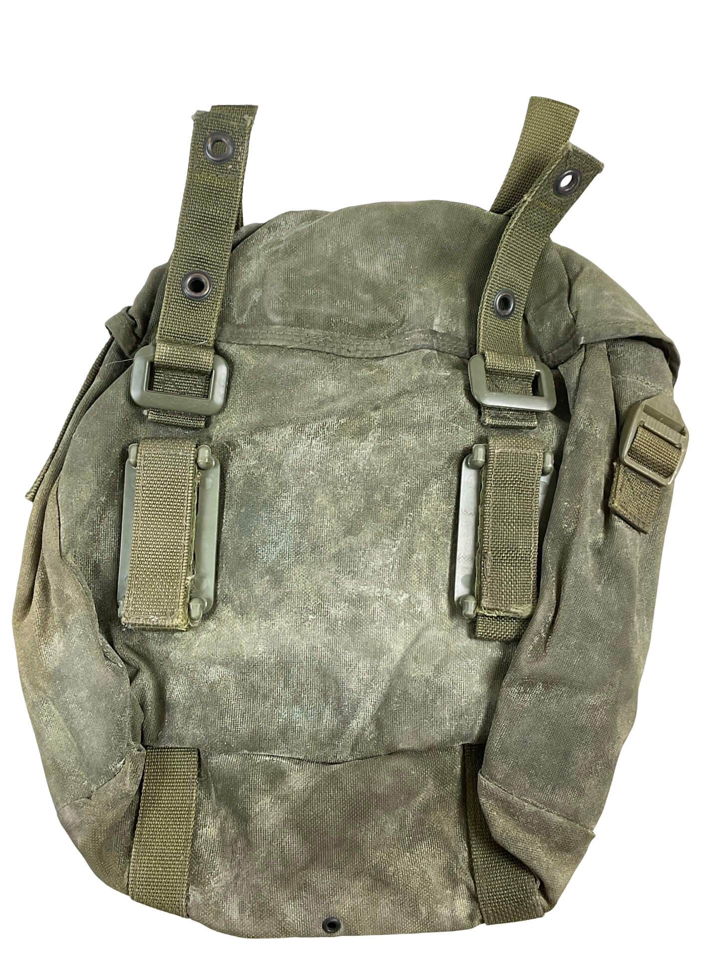The Canadian 82 Pattern Small Field Pack, also known as the “Butt Pack,” is a utility pouch originally issued as part of the Canadian Forces 1982 Pattern webbing equipment. This pack was designed to be worn at the base of the back on the web belt, serving as a compact storage solution for essential field items. Constructed from rugged green nylon, it features a main compartment with a fold-over storm flap secured by adjustable straps and quick-release buckles. Additional side attachment points allow for integration with other gear. The pack’s compact size makes it suitable for carrying rations, basic tools, and personal items. Each example is typically marked with the user’s name or service number for identification. This item reflects Canadian military equipment standards from the late 20th century and is of interest to collectors or researchers of Canadian Forces field gear from this era.