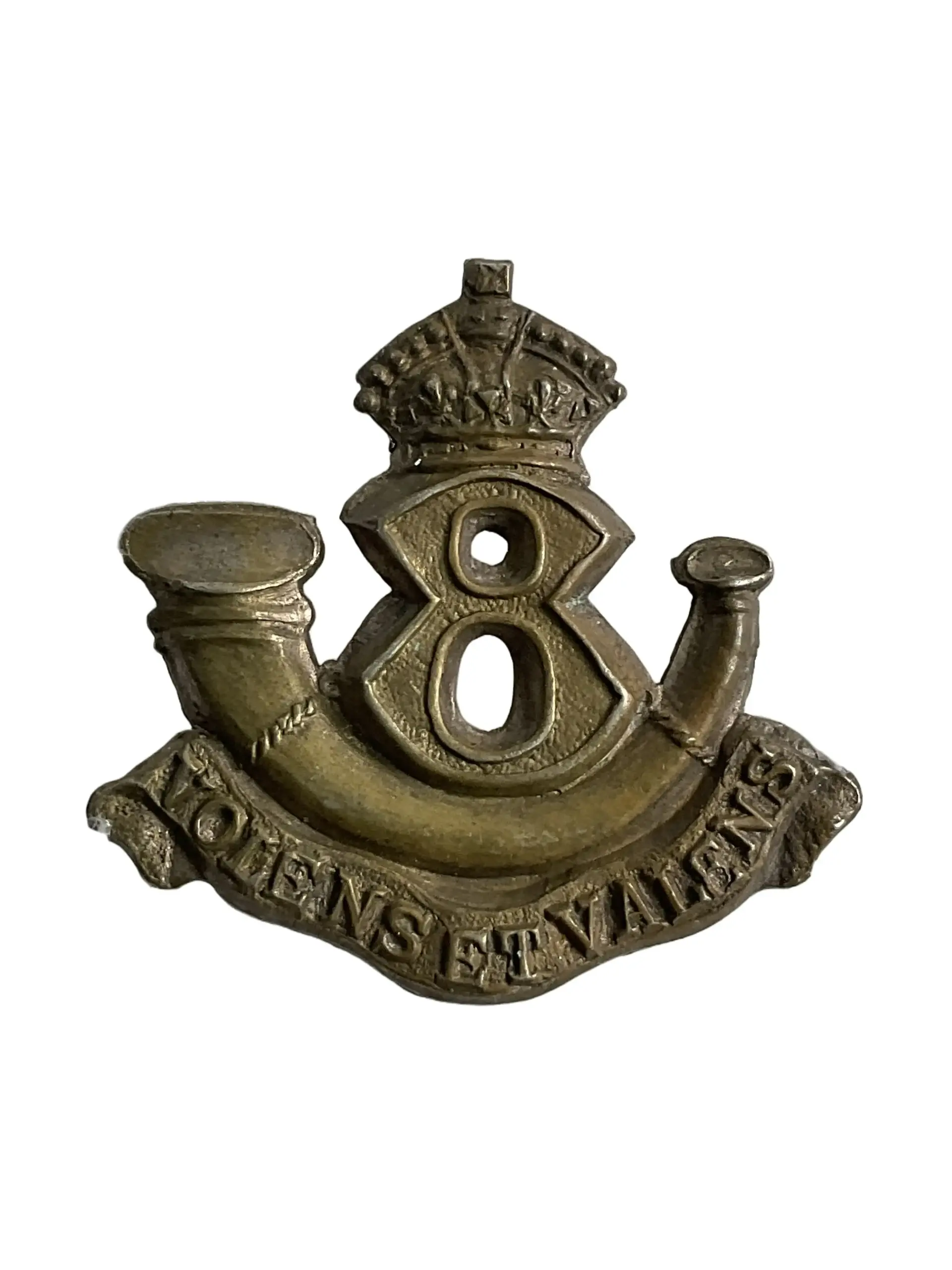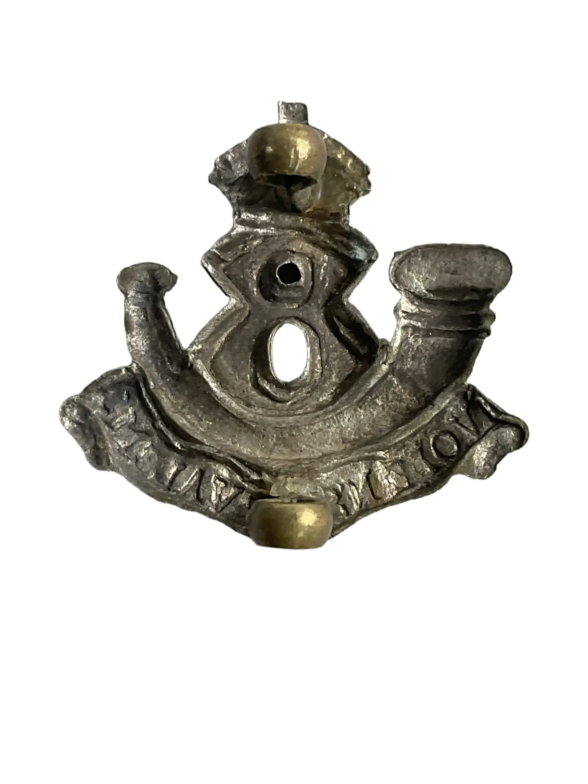This listing features a single collar insignia from the 8th Quebec Rifles, a Canadian military unit. The insignia is made of metal and was worn on the uniform collar to designate unit affiliation. Typical to its era, it displays the regimental number and relevant symbols associated with the Quebec Rifles. Such insignia were standard issue for members of the regiment and served both as identifiers and as elements of uniform regulation. The 8th Quebec Rifles, originally formed as a part-time militia regiment, played a role in the local defense structure of Quebec. Collectors and historians value these items for their direct connection to Canadian military history and for the insight they provide into regimental traditions and insignia design. The piece demonstrates period-appropriate construction and detailing, aligning with other Canadian insignia from the late 19th and early 20th centuries. This single collar badge represents a tangible artifact from Canada’s military past.