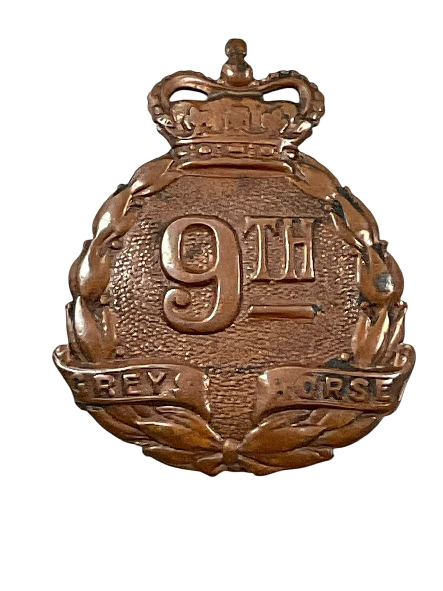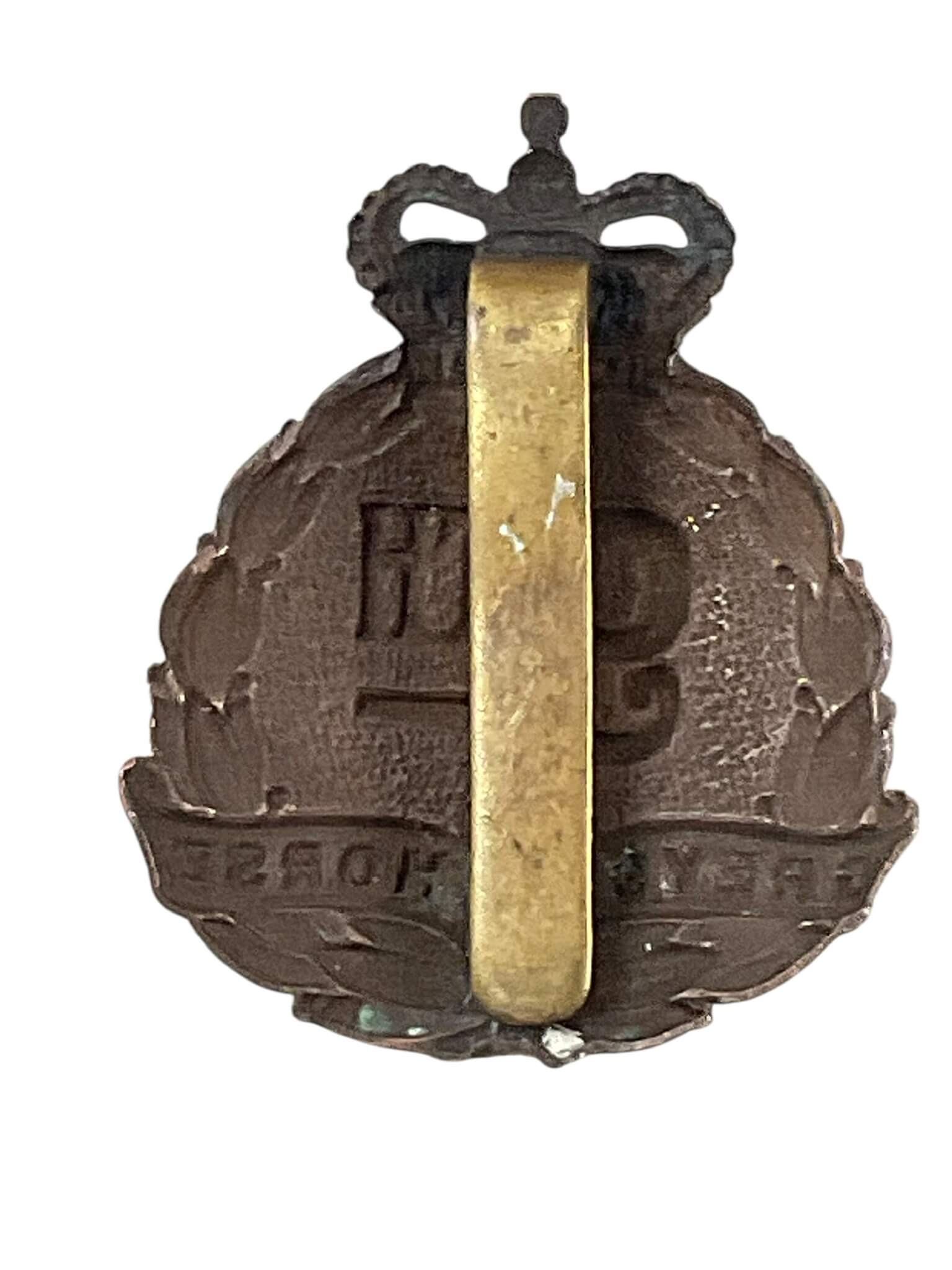The Canadian 9th Greys Horse Regiment Cap Badge is a historical military insignia representing the Canadian cavalry unit known as the 9th Grey’s Horse. This regiment, formed in the early 20th century, played a part in Canadian Militia history, with ties to both local defense and overseas service. The cap badge typically features a central motif relevant to the regiment, such as an image of a horse or regimental number, often surrounded by a wreath and topped by the King’s crown indicative of the era. Constructed from brass or similar metals, these badges were worn on the front of military headgear as part of the uniform, identifying the soldier’s unit. The reverse often includes a lug or slider attachment for securing it to the cap. Items like this are sought for their historical association with Canadian cavalry units and are valued by collectors of military memorabilia and Canadian regimental history.