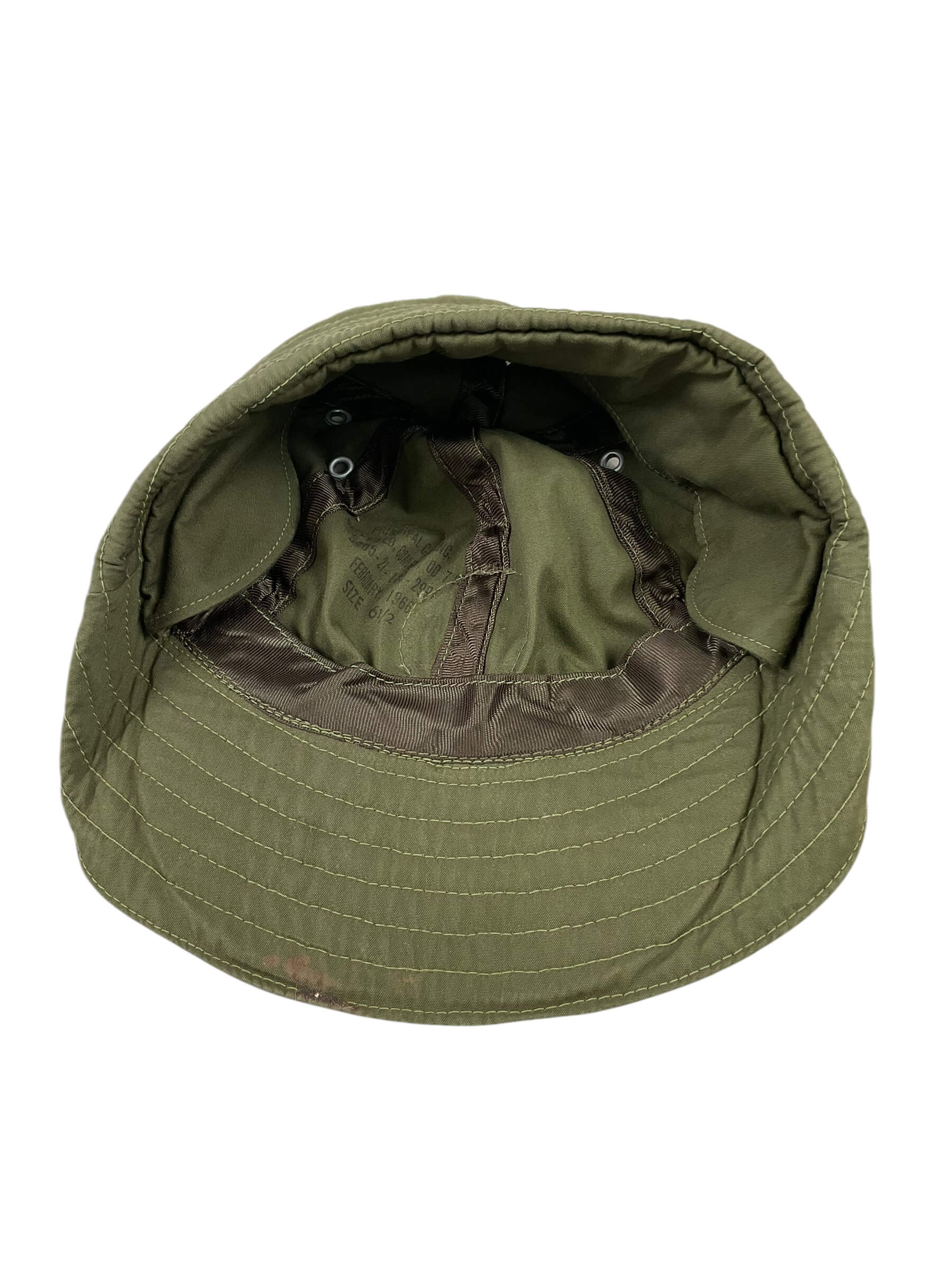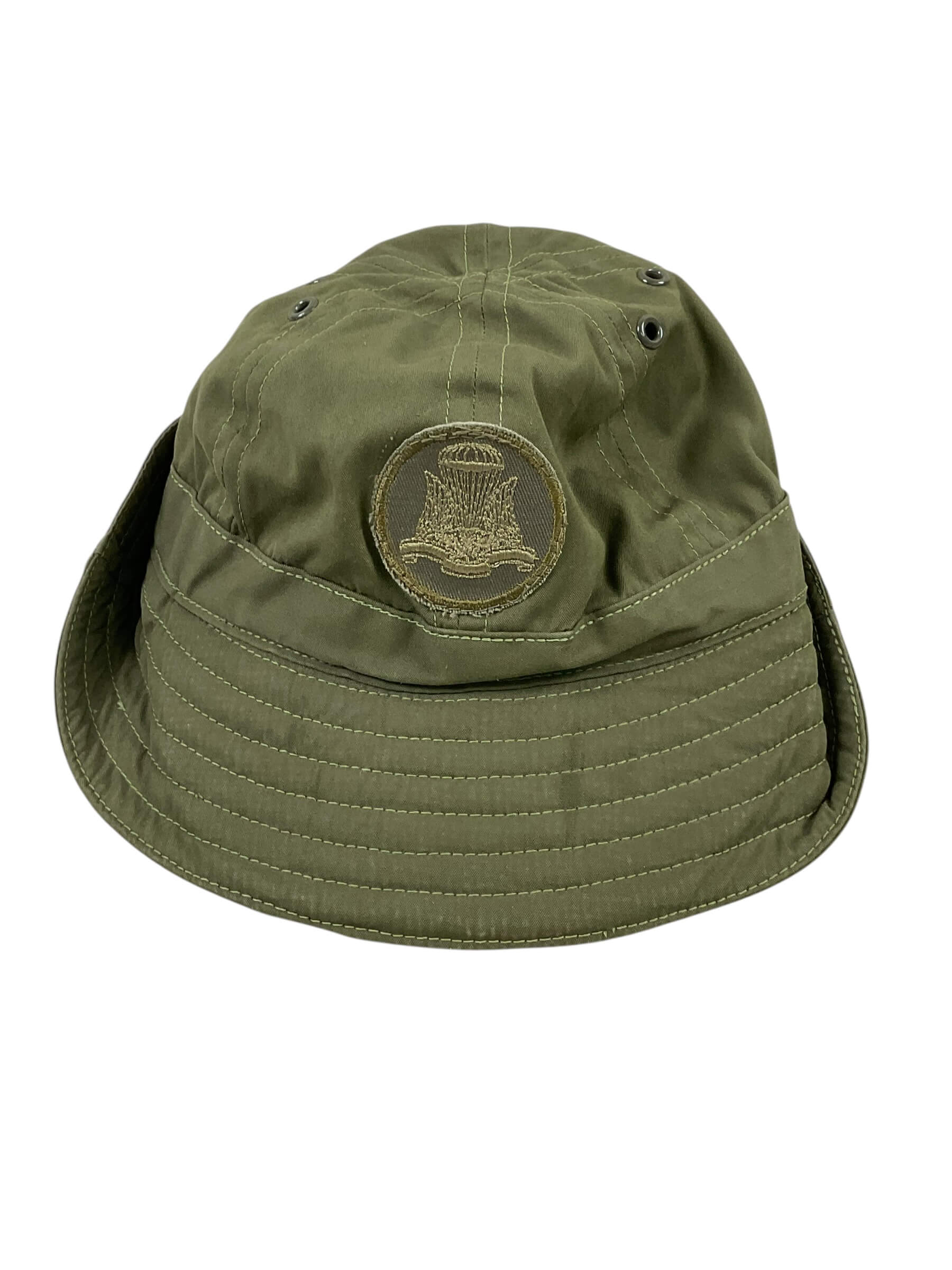 The Canadian Airborne Regiment Robin Hood Cap, dated 1966, is a distinctive item of military headgear used by the Canadian Armed Forces. This cap is characterized by its unique pointed, slashed design, earning it the nickname “Robin Hood” cap among collectors and military personnel. It is made of green wool, consistent with issue materials of the period, and features a size marking of 6 1/2. The 1966 date stamp situates the cap within the early years of the Canadian Airborne Regiment, formed in 1968 but preceded by the development of specialized equipment and uniforms during the 1960s. The Robin Hood cap was part of the regiment’s initial uniform ensemble, intended for both practical and ceremonial use. This example represents cold war-era Canadian military design, and its markings provide reference for collectors or researchers interested in airborne or paratrooper history in Canada.