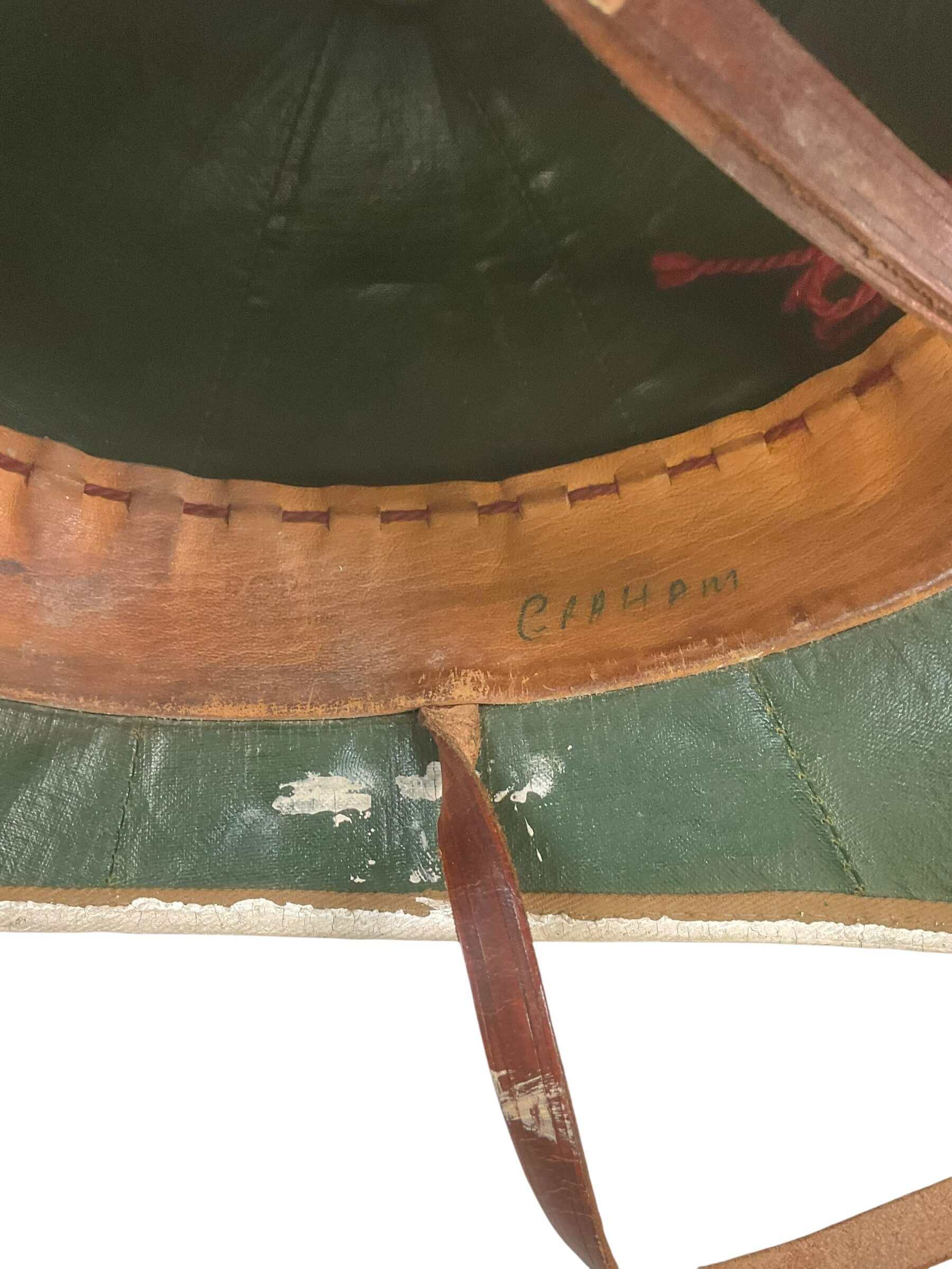 The Canadian Army 67 Centennial Pith Helmet, size 7, is a military headgear item issued to commemorate the Canadian Centennial in 1967. This helmet features a light khaki-colored shell constructed from pressed cork covered in cotton twill fabric, a design influenced by traditional colonial-era pith helmets. The helmet is fitted with a leather sweatband inside and a chinstrap for secure wear. On the left side, it bears the distinct badge marking the 1967 Centennial, symbolizing 100 years of Canadian Confederation. Worn primarily by ceremonial units, this pith helmet was not intended for combat use but rather for parade and dress occasions, reflecting Canada’s historical ties to Commonwealth military traditions. The size 7 marking indicates the measurement suited to a 22-inch head circumference. The Canadian Army 67 Centennial Pith Helmet is characteristic of mid-20th century ceremonial military attire in Canada and holds relevance to collectors specializing in Canadian Forces memorabilia.