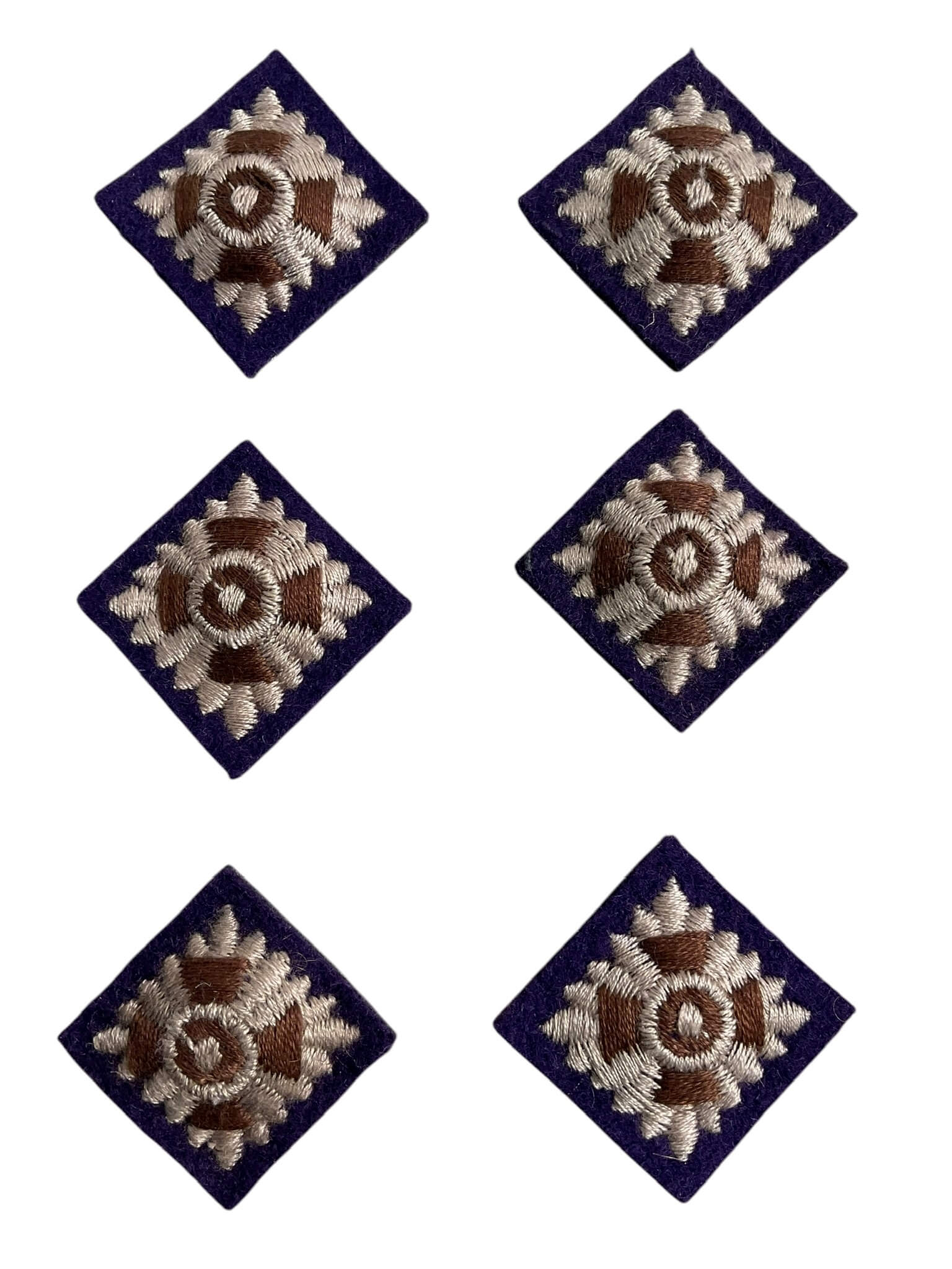 The Canadian Army Captain’s Rank Purple Pips Chaplain Set of 6 comprises a collection of six rank insignia pips used to denote the rank of Captain within the Canadian Army Chaplaincy. Each pip is designed with a distinctive purple coloring, which is associated with the Chaplain Branch and differentiates these pips from those used by other branches of the Canadian Army. Typically worn on the shoulder boards or epaulettes of service uniforms, these pips are arranged in two rows of three to indicate the Captain rank. The use of colored insignia for chaplains reflects longstanding traditions in military uniform distinctions. This set provides a representative example of Canadian Army insignia from the Chaplaincy, offering insight into the uniform conventions followed by clergy serving in military roles. Such insignia are of interest for collections focused on branch-specific and rank-specific military antiques, especially those relating to religious services in the armed forces.