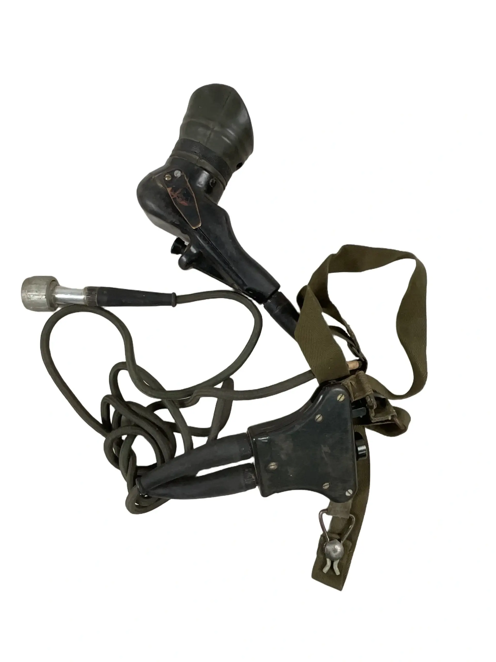 The Canadian Army Centurion Tank Radio Handset Microphone is an original communication device used in conjunction with armored vehicle radios, specifically those found in Centurion tanks operated by Canadian forces during the mid to late 20th century. This handset features a robust design suitable for military environments, with a durable casing, press-to-talk switch, and integrated microphone and earpiece for clear audio transmission and reception. The item is housed in its original box, which typically includes labeling and part numbers relevant to military inventory systems. Such handsets were critical components of tank crew communications, allowing for coordinated operations and internal command during training and active deployment. The equipment reflects standard-issue military technology of the era and provides insight into vehicle-based communication systems prior to the widespread adoption of newer digital devices. This specimen is intended for collectors and researchers interested in military communications equipment and Canadian armored vehicle history.