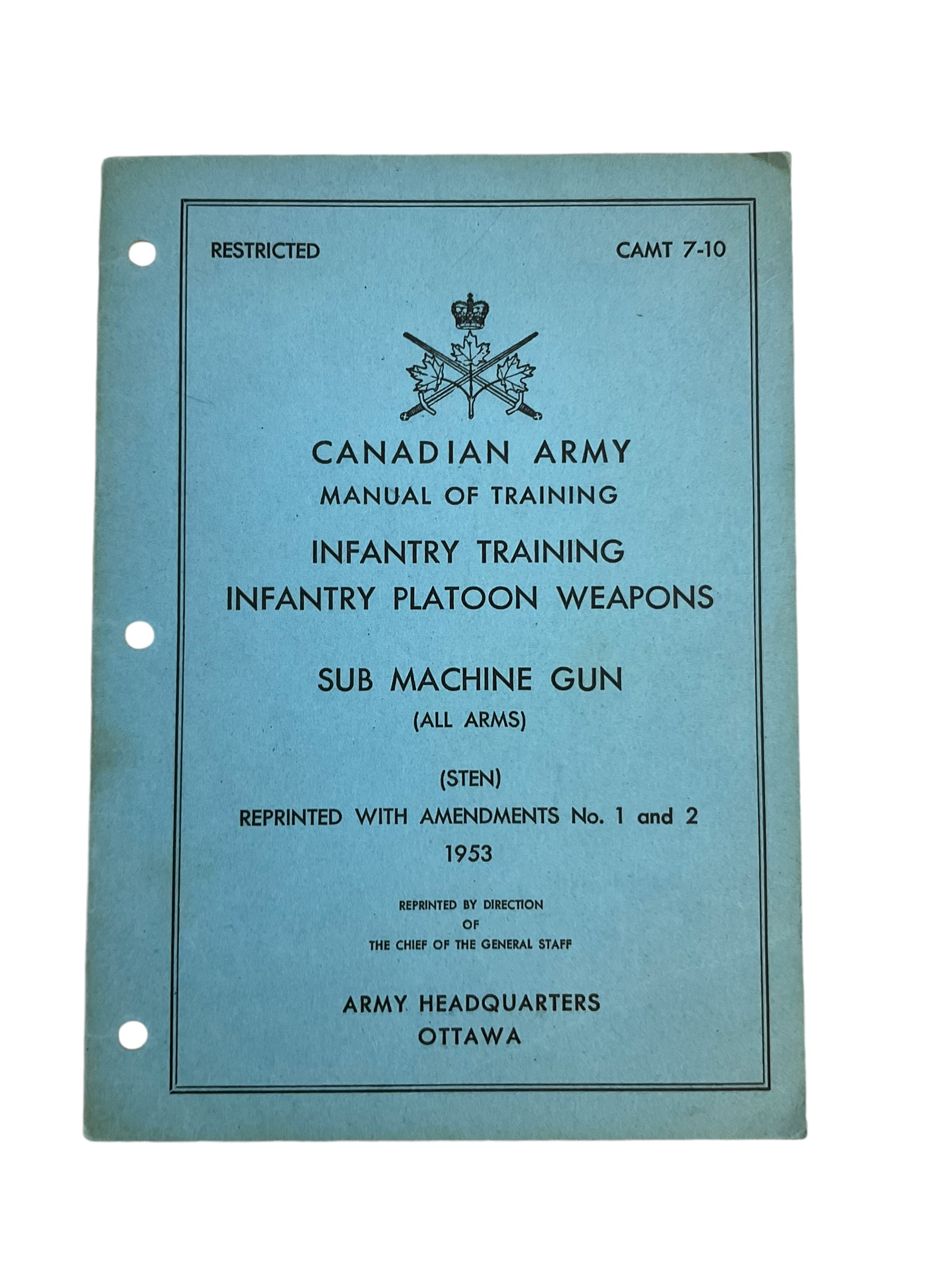 This comprehensive reference book, titled ‘Canadian Army Infantry Training Infantry Platoon Weapons Sub Machine Gun,’ is an indispensable resource for military enthusiasts, historians, or those with a keen interest in firearms. It provides a deep dive into the intricacies of infantry platoon weapons used by the Canadian Army, with a special focus on sub machine guns. The book is a softcover edition, ensuring it is lightweight and portable. The contents are meticulously researched, offering detailed insights into the specifications, handling, maintenance, and tactical deployment of these weapons. It also includes diagrams, photographs, and other visual aids for better understanding. This book not only offers a glimpse into the Canadian Army’s infantry training but also enriches the reader’s knowledge about military firearms. It is an essential addition to any military reference collection.  Total of 16 pages.