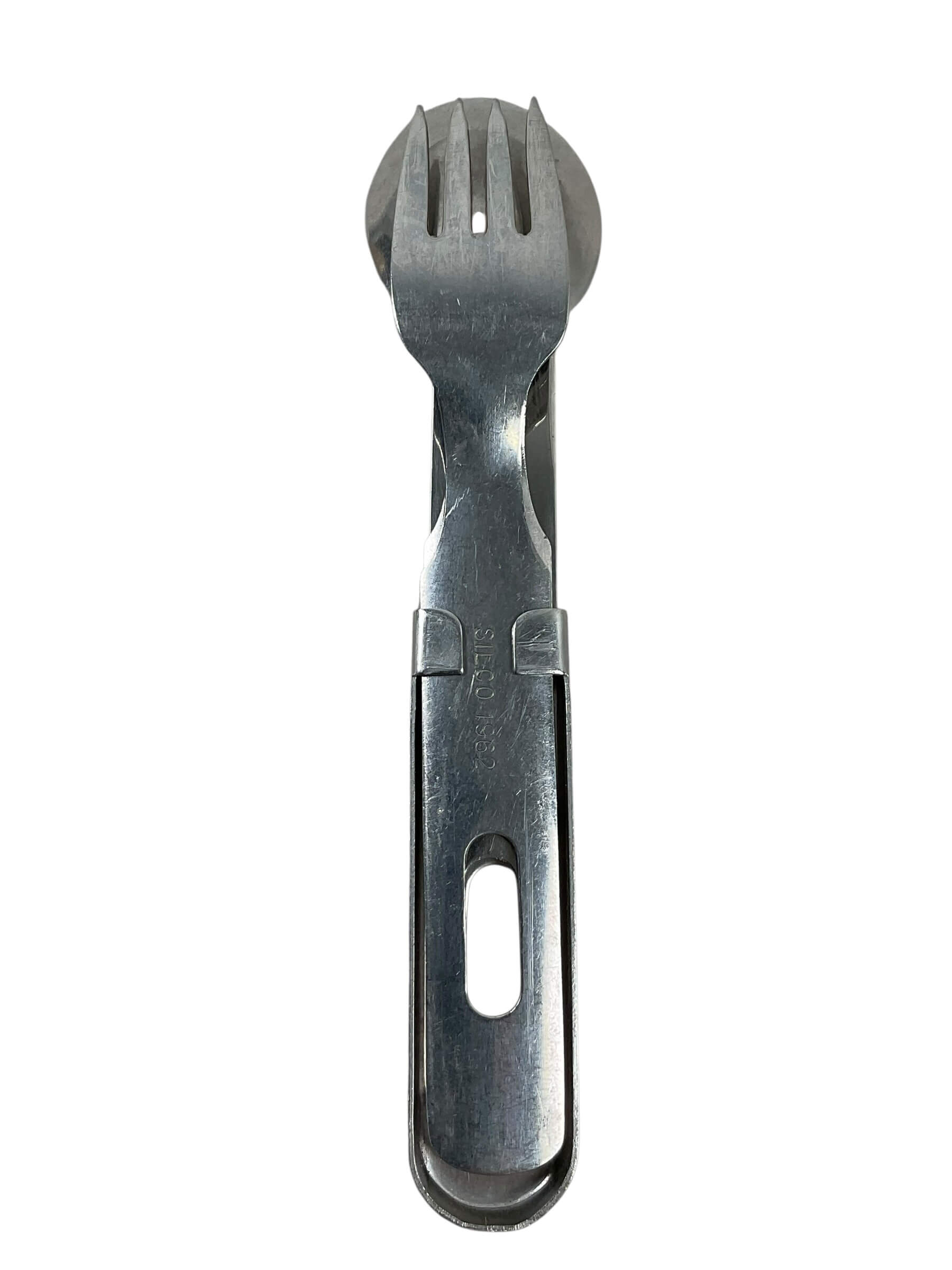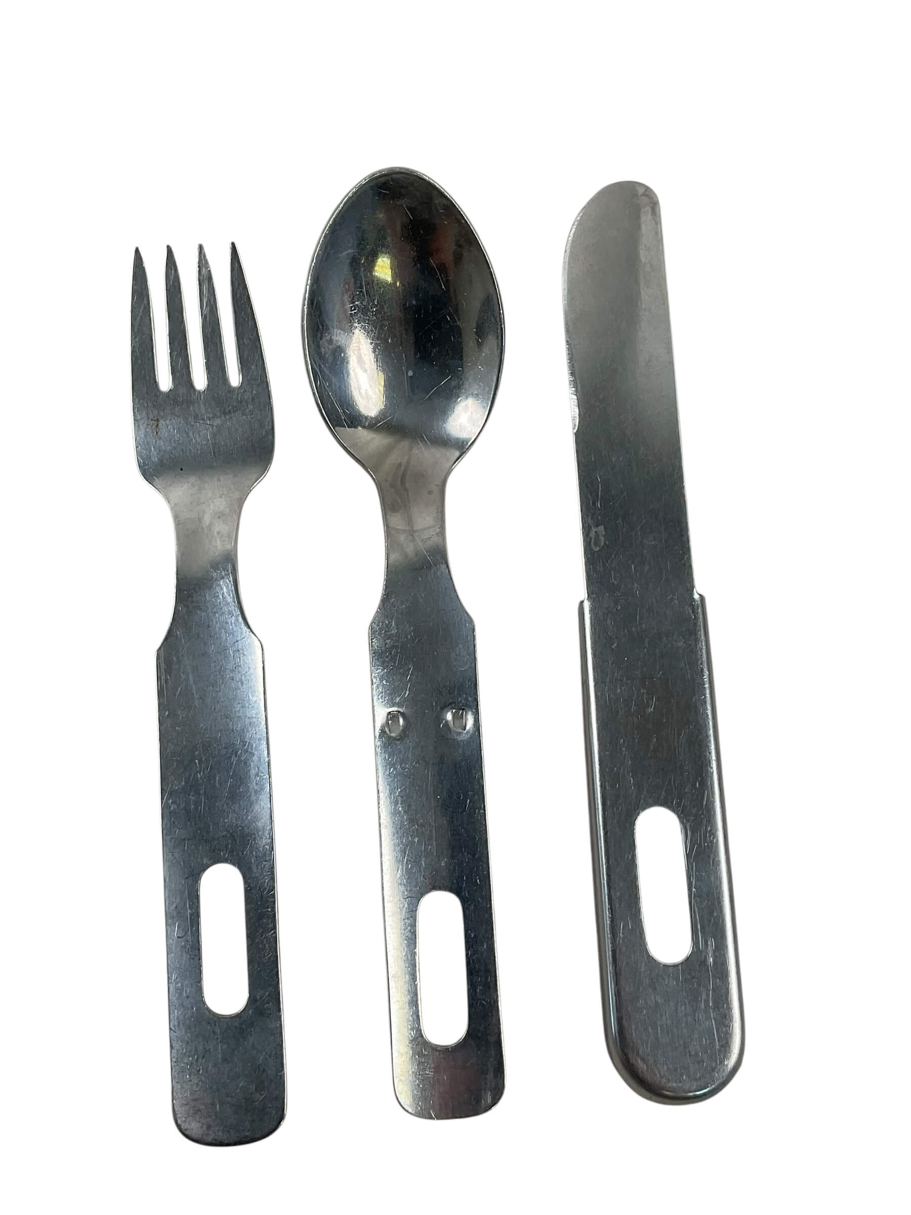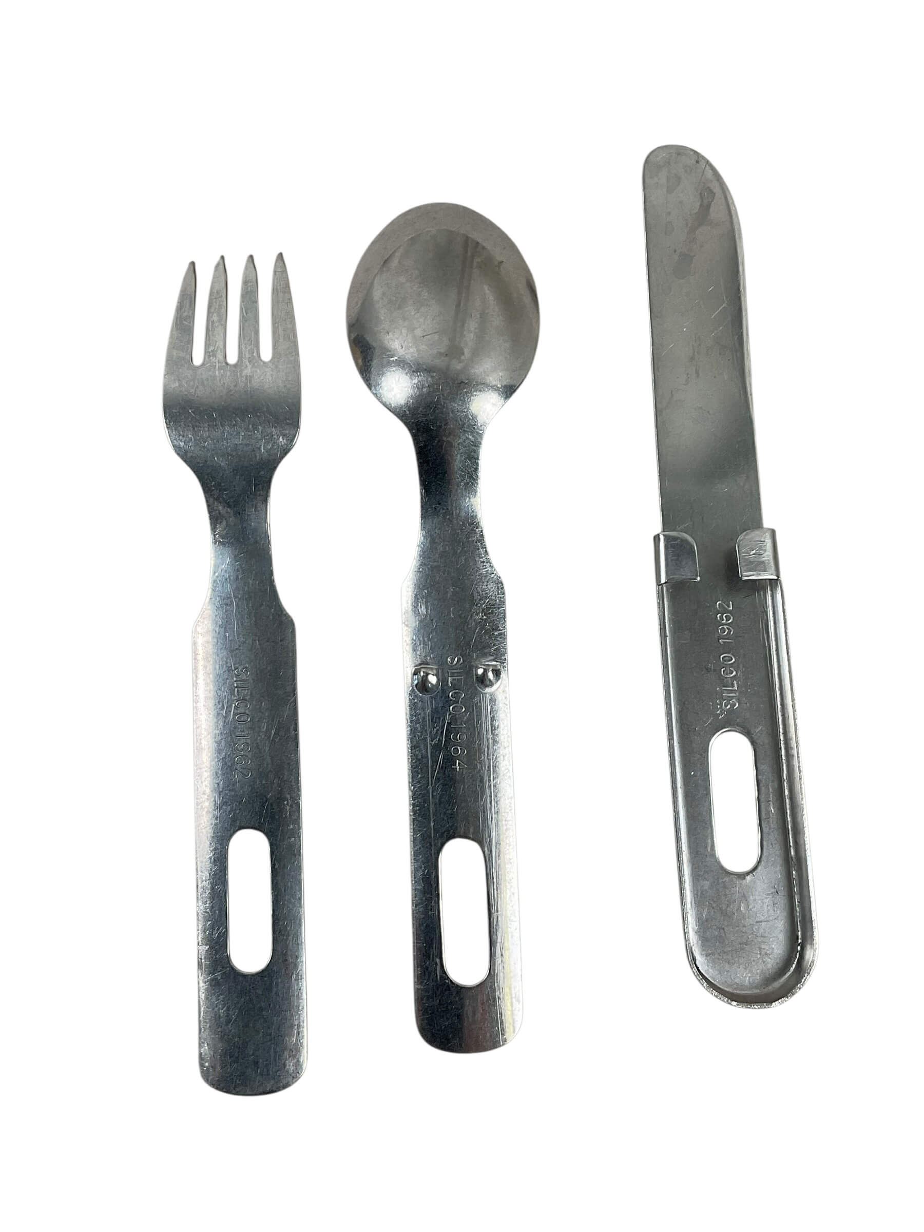 The Canadian Army KFS Set Dated 1964 Silco is a standard-issue field cutlery set used by Canadian military personnel during the mid-20th century. KFS refers to “Knife, Fork, and Spoon,” the three essential components included in the set. Manufactured by Silco in 1964, this set features stainless steel construction, providing durability and resistance to corrosion suitable for field use. Each piece is typically stamped with the manufacturer’s mark, the date of production, and a Canadian military broad arrow or property mark, attesting to its authenticity and official military use. The design emphasizes functionality, with the utensils designed to interlock or nest together for compact storage and easy transport. Such items were standard issue for Canadian Army servicemembers and commonly found in soldiers’ mess kits. KFS sets of this type reflect the logistical approaches of Cold War-era militaries, prioritizing practicality and longevity in personal equipment.