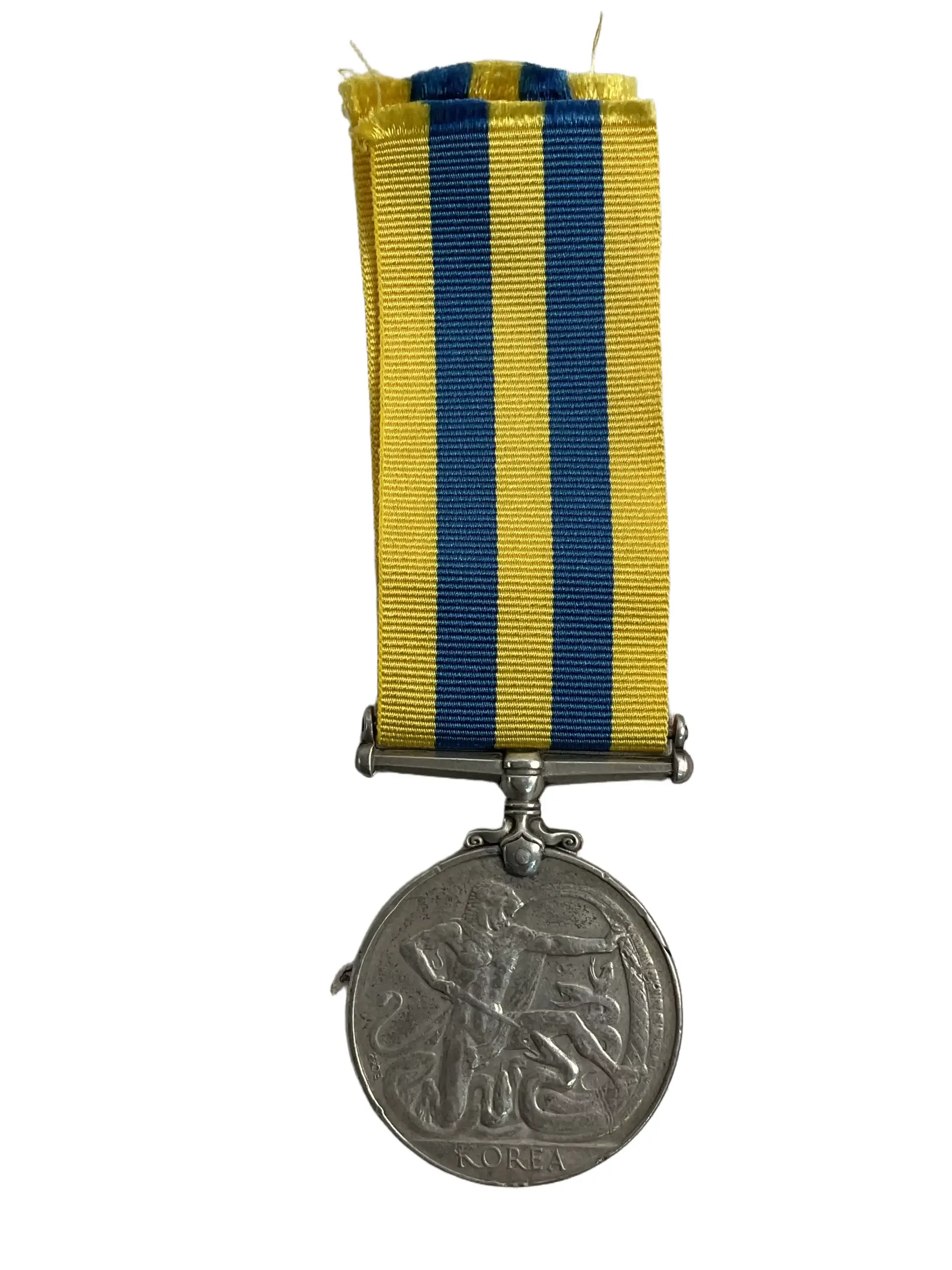 The Canadian Army Korean War Campaign Medal Full Size is an official military decoration awarded to members of the Canadian forces who participated in the Korean War between 1950 and 1953. This full-size medal is circular and struck in cupro-nickel, displaying the effigy of Queen Elizabeth II on the obverse and a depiction of Hercules wrestling the Hydra on the reverse, symbolizing the struggle against aggression. The medal is suspended from a ribbon featuring alternating dark blue, yellow, and red stripes, representing the United Nations and Commonwealth involvement. Eligibility for this medal was based on completing at least one day of service in the qualifying region or direct support operations. The item offered is intended for collectors, historians, and those interested in Canadian military history, reflecting the service and commitment of Canadian personnel during the Korean conflict. The Canadian Army Korean War Campaign Medal remains a significant artifact documenting Canada’s contributions to United Nations military operations.