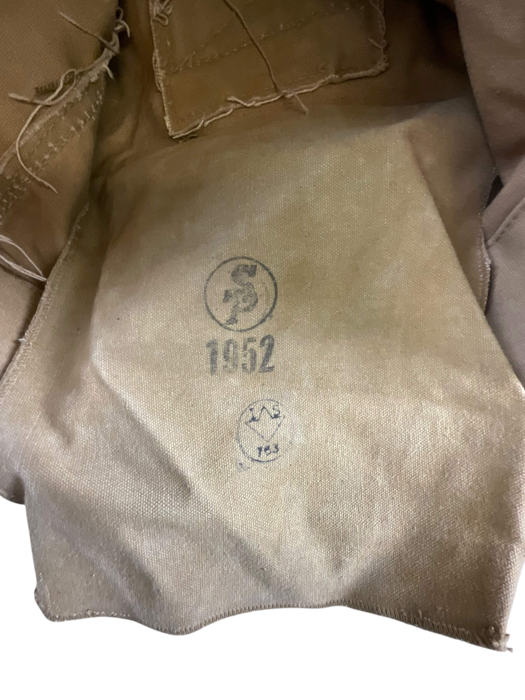 This piece is a genuine Canadian Army Korean War Duffle Bag, named and dated 1952. Its dimensions are 36″ X 20″, making it a sizeable piece of military history. Crafted with the rugged durability required by the harsh conditions of war, the bag is designed to endure. The 1952 date indicates its origins in the midst of the Korean War, a conflict in which the Canadian Army played a significant role. The bag also carries a name, a personal touch that connects it to the individual soldier who once owned it. This artefact isn’t just a bag – it’s a slice of history, a tangible link to Canada’s military past, and a testament to the brave soldiers who fought under challenging conditions. It’s a must-have for military enthusiasts, collectors, or anyone with a fascination for historical artefacts.