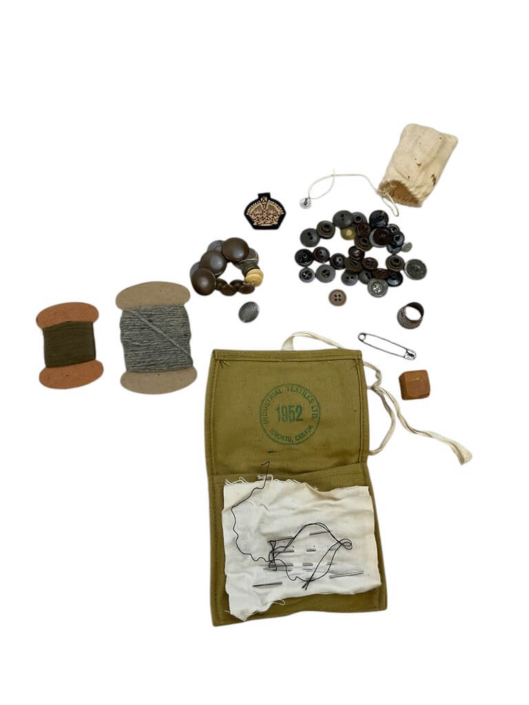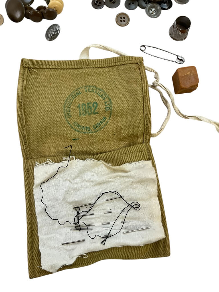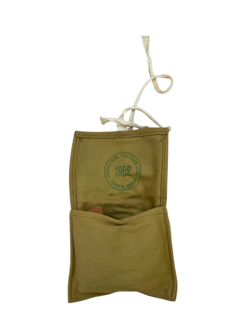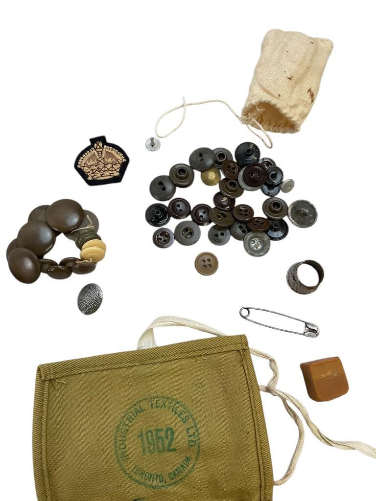 ‘The Canadian Army Korean War Housewife Dated 1952’ is a distinctive artifact that provides an intriguing glimpse into the life of a Canadian soldier during the turbulent times of the Korean War. The term ‘Housewife’ refers to a small, portable sewing kit used by soldiers for mending their clothing and uniforms. This specific kit, dated 1952, includes all the necessary tools such as needles, thread and buttons, and is encased in a neatly folded canvas pouch. The kit reflects the everyday challenges faced by soldiers in the field, and the resilience and resourcefulness they exhibited. In addition to its historic significance, this ‘Housewife’ is a poignant symbol of Canada’s contribution to the Korean War. It offers a unique, personal perspective on a global conflict that had far-reaching effects, making it a fascinating item for historians, collectors, or anyone interested in military history.