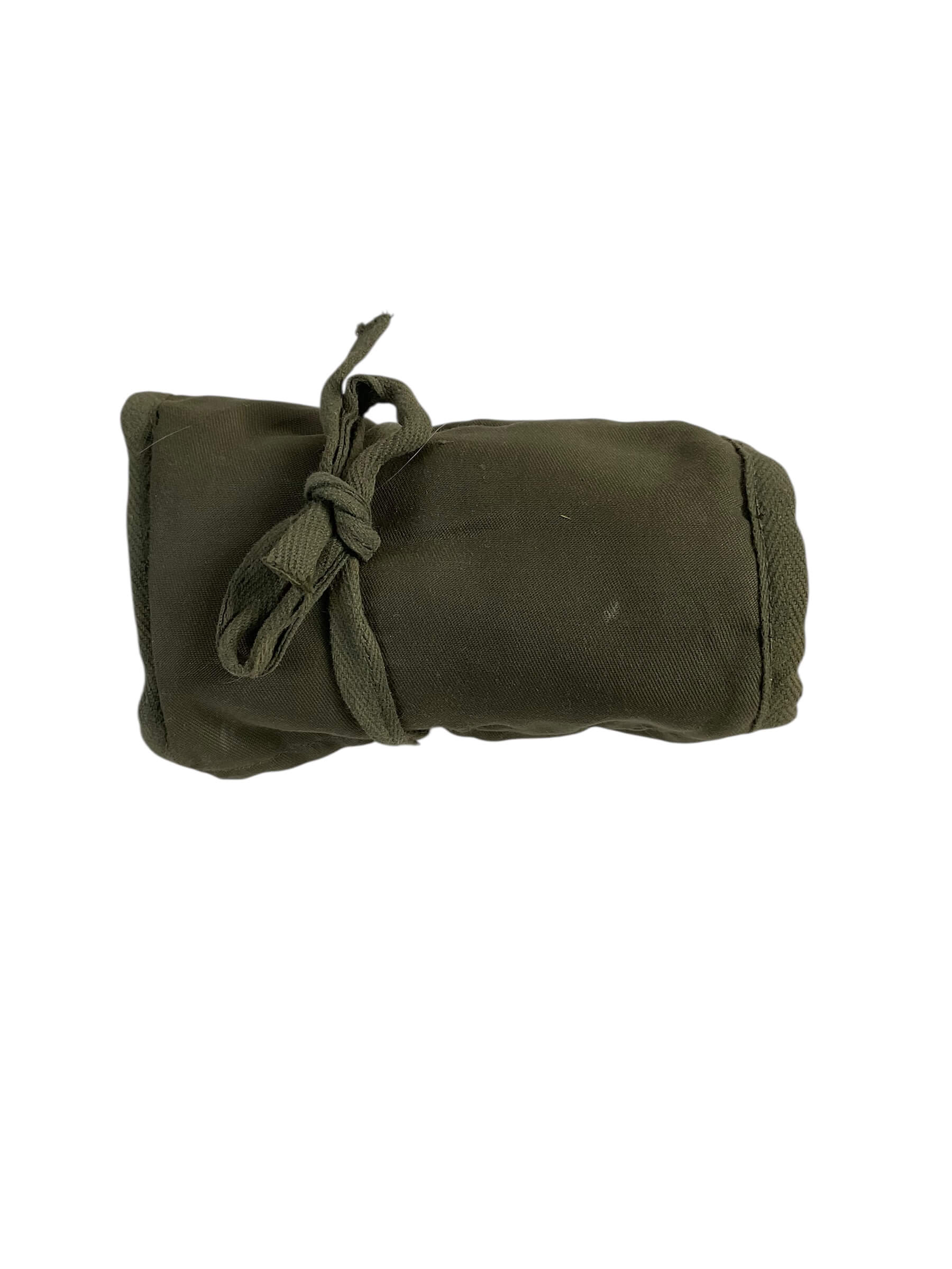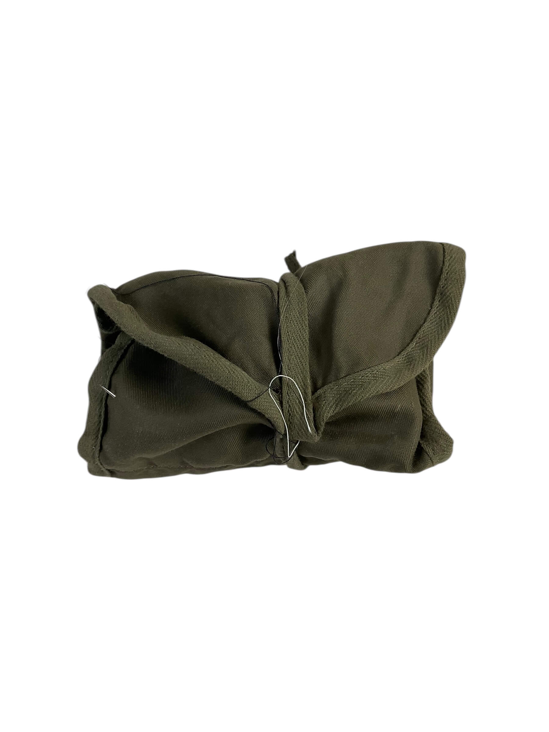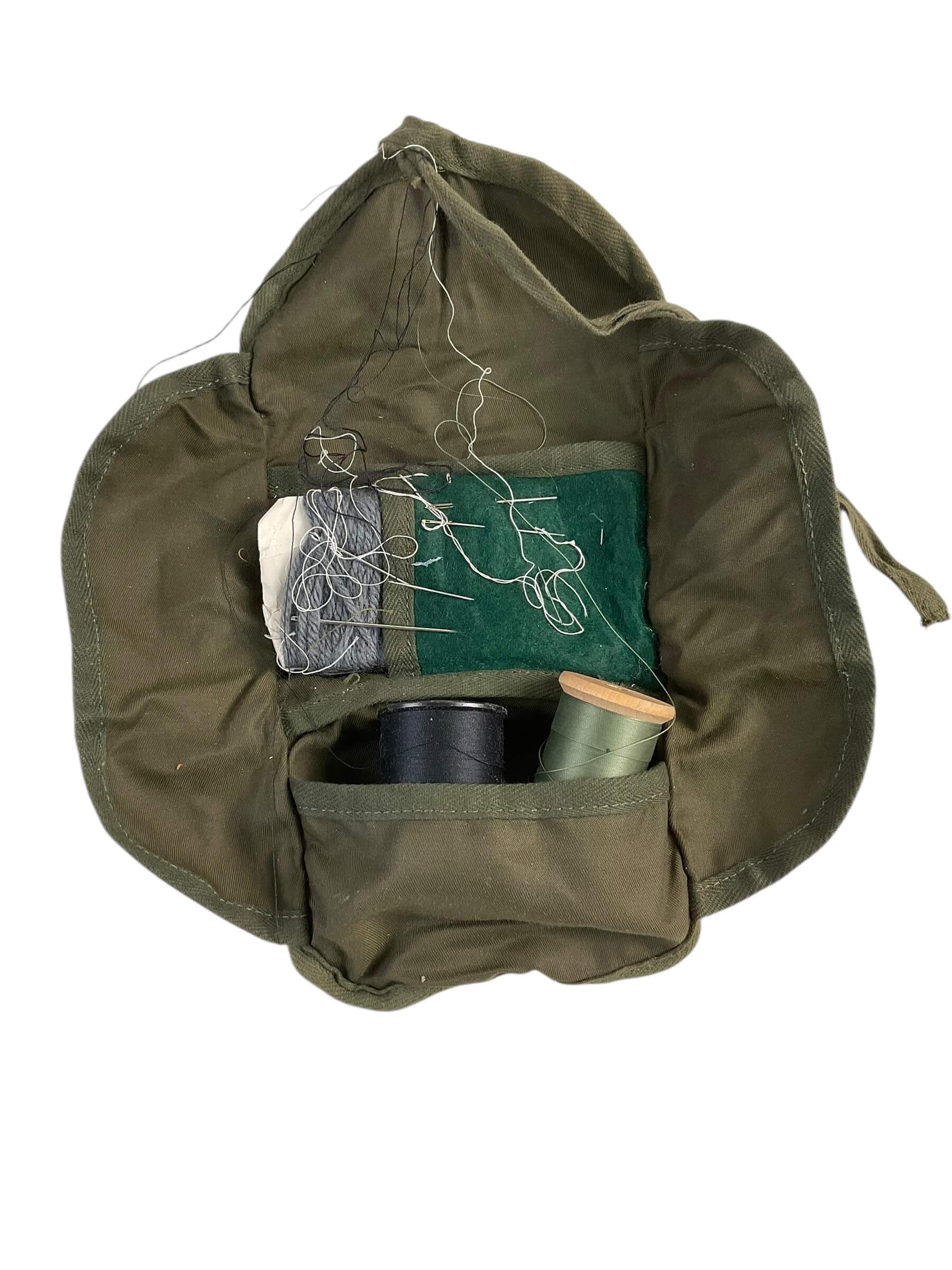 The Canadian Army Korean War Housewife With Contents is an original personal sewing kit issued to Canadian soldiers during the Korean War era (1950–1953). Commonly known as a “housewife,” this compact fabric roll contains essential mending supplies used to repair uniforms and equipment in the field. The kit typically includes items such as needles, thread in various colors, buttons, safety pins, and occasionally small scissors or thimbles, all housed within individual pockets or secured by fabric loops. The exterior is usually made of durable khaki or olive drab cloth, designed for easy transport in a soldier’s kit or pocket. These sewing kits were standard issue for Canadian troops and reflect the practical needs faced by military personnel during deployment. This particular example retains its period-appropriate contents, offering insight into the daily life and resourcefulness required of soldiers serving in the Korean War. The item is presented as acquired, with age-related wear consistent with its history.