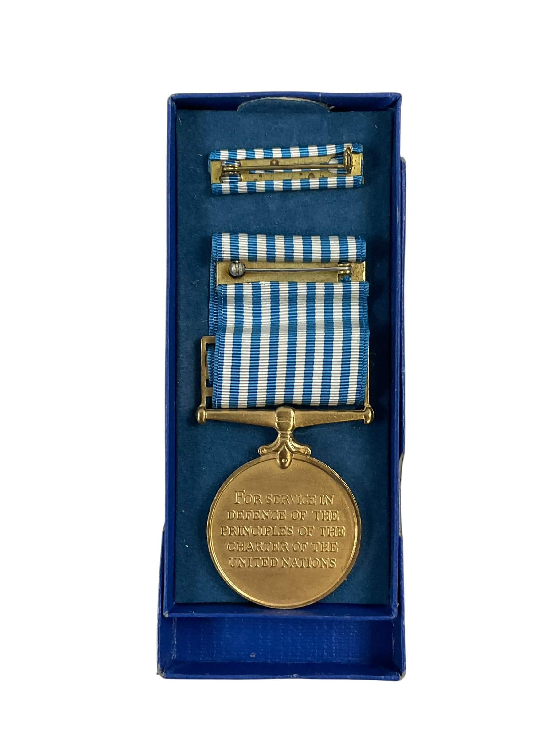 The Canadian Army Korean War Service Medal Full Size In Box is an official military decoration issued to Canadian forces personnel who served during the Korean War between 1950 and 1953. This full-size medal features a circular design with the effigy of Queen Elizabeth II on the obverse side and a symbolic representation of the Korean War on the reverse. The medal is suspended from a ribbon that displays a light blue center flanked by yellow and white stripes, representing the United Nations and the conflict’s participants. This item is presented in its original box, as issued by the Canadian government. The Korean War Service Medal was awarded to members of the Canadian military who completed at least one day of service in the operational theater or one embarkation in territorial waters during the conflict. This decoration serves as an important historical artifact reflecting Canada’s involvement in international military operations during the early Cold War era.