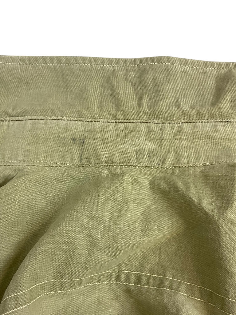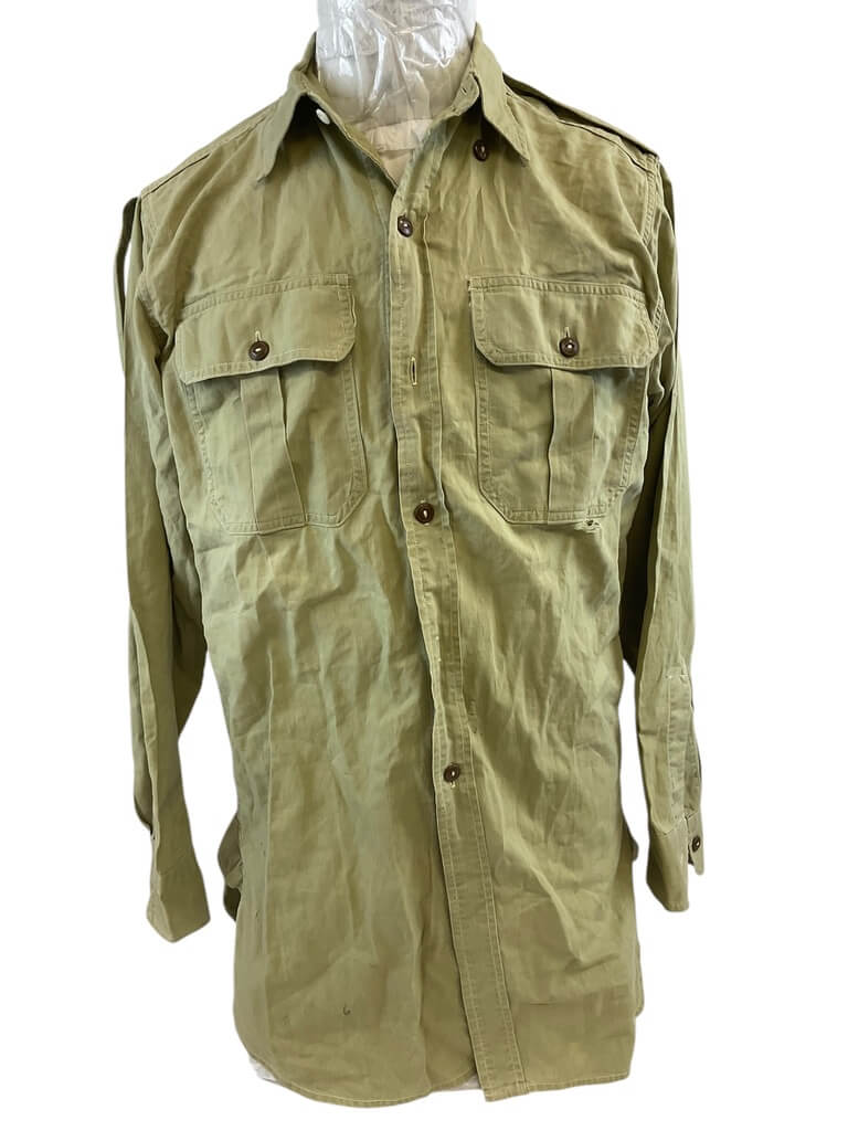 This vintage Canadian Army Long Sleeve Shirt with Epaulets, dated 1949, is an authentic piece of military memorabilia. The shirt is a rich olive green, fabricated from durable, heavy-duty material designed to withstand harsh conditions. Its defining features are the epaulets situated on both shoulders, signifying military ranking, contributing to its historic appeal. The shirt also features a classic button-down style, with two front pockets providing both functionality and style. Despite its age, this 1949 military shirt has been remarkably preserved, showcasing the resilient quality of its craftsmanship. It’s an exceptional collector’s item for military enthusiasts or those interested in historical garments. The shirt reflects not only the aesthetic style of the period but also the story of the brave men who served in the Canadian Army during that era.