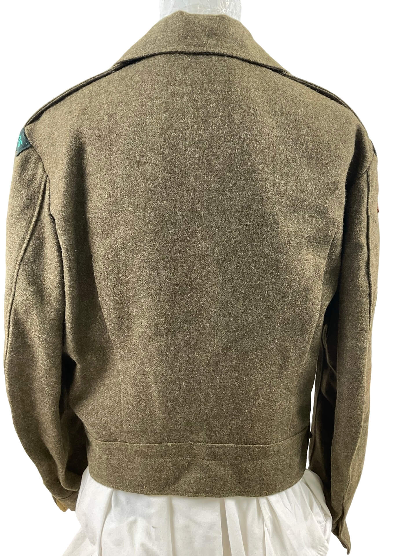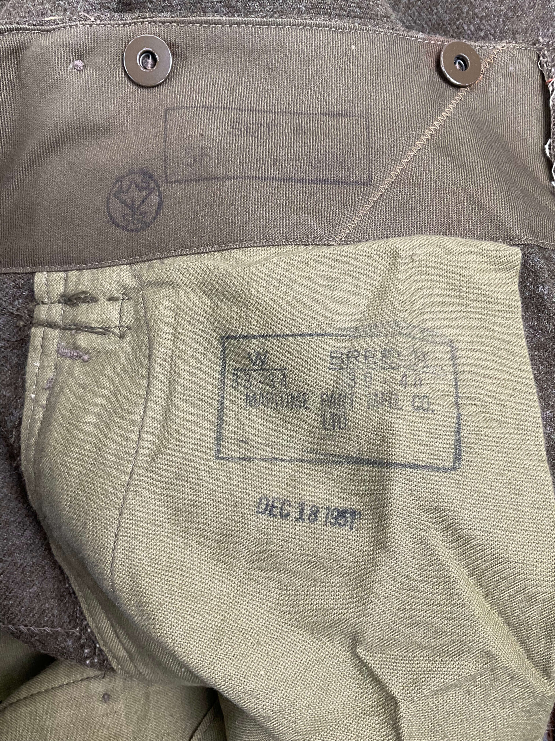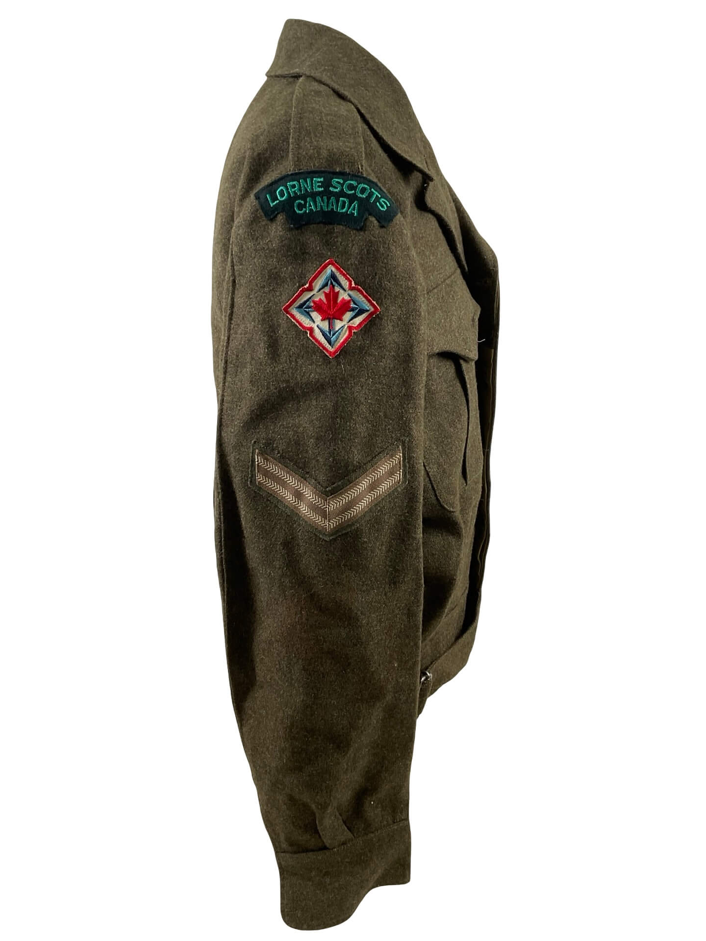 The Canadian Army Lorne Scots Battledress Jacket and Trousers is a two-piece uniform set originally issued to members of the Lorne Scots regiment during the mid-20th century. The battledress jacket is constructed from wool serge and features pleated chest pockets, a button front, and epaulets, consistent with Canadian military issue of the World War II and immediate postwar periods. The corresponding trousers are made of matching wool serge, designed with a high waist, button fly, and field dressing pocket. Both jacket and trousers are unit-marked for the Lorne Scots—a regiment with a history of service in the Canadian Army. This example is named to an individual soldier, with the name typically found on internal labels or ink stampings, providing a tangible connection to its original wearer. The set represents the standard field dress for Canadian infantry during the era and illustrates typical construction and insignia for regimental battledress in Canadian military history.