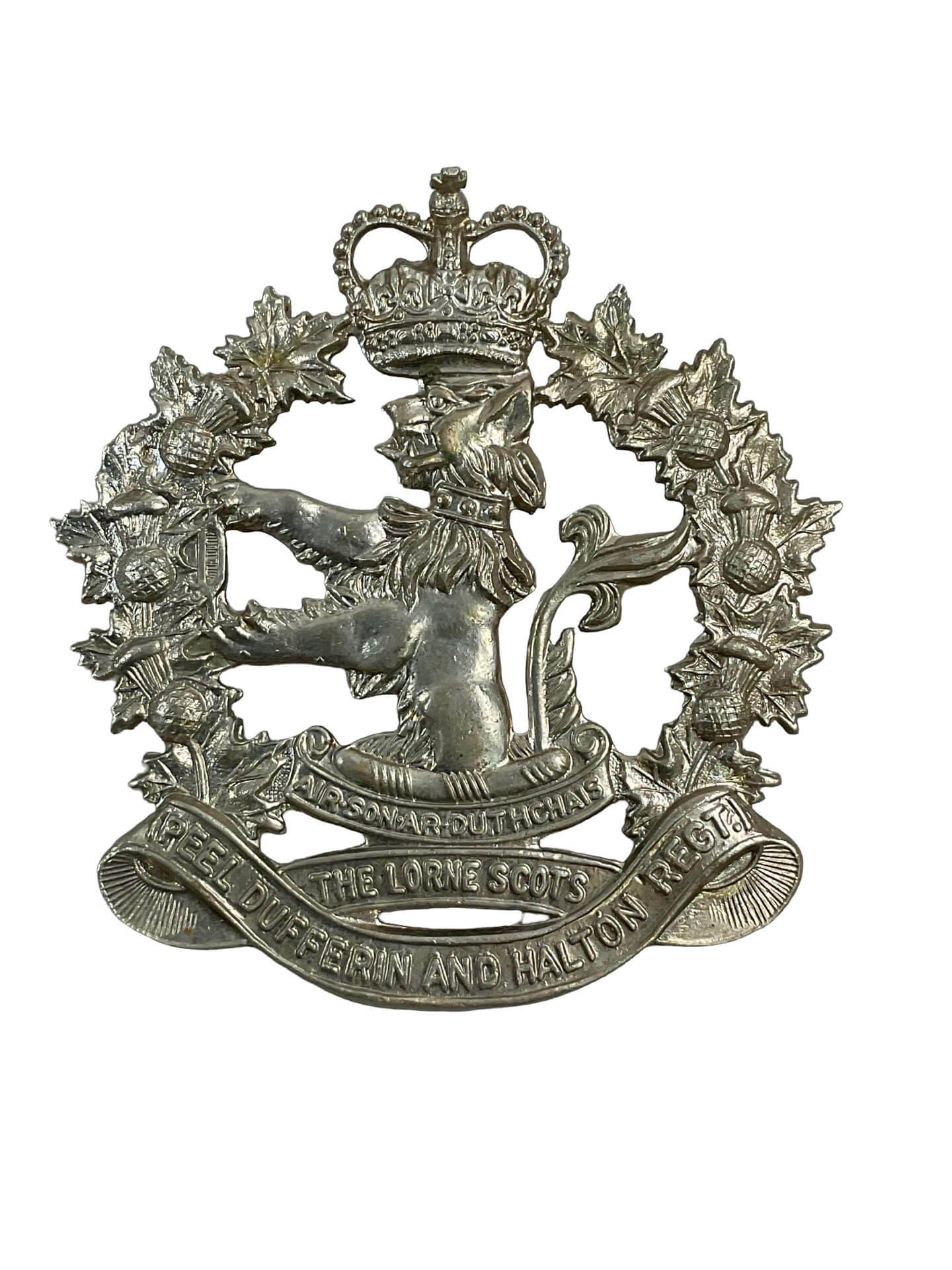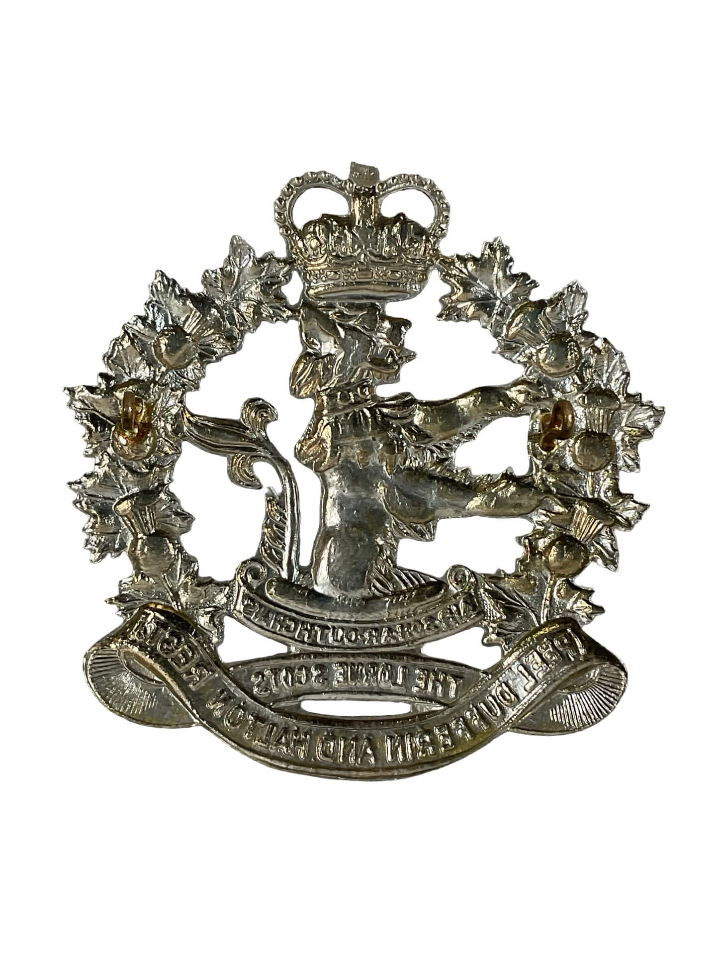 The Canadian Army Lorne Scots Cap Badge is an insignia associated with The Lorne Scots (Peel, Dufferin and Halton Regiment), a Primary Reserve infantry regiment of the Canadian Army. The badge typically features a boar’s head over a scroll bearing the regiment’s name, flanked by thistles, symbolizing the unit’s Scottish heritage. It is constructed from metal, most commonly brass or white metal, and has been used in various forms since the regiment’s establishment in 1936. The badge is designed to be worn on the headdress, signifying membership in The Lorne Scots. Its appearance and design reflect the traditions and history of Scottish regiments within the Canadian Armed Forces. These badges were issued to personnel during active service and training, serving as both identification and as a mark of regimental pride. The Lorne Scots Cap Badge remains an item of interest for collectors of Canadian military memorabilia.