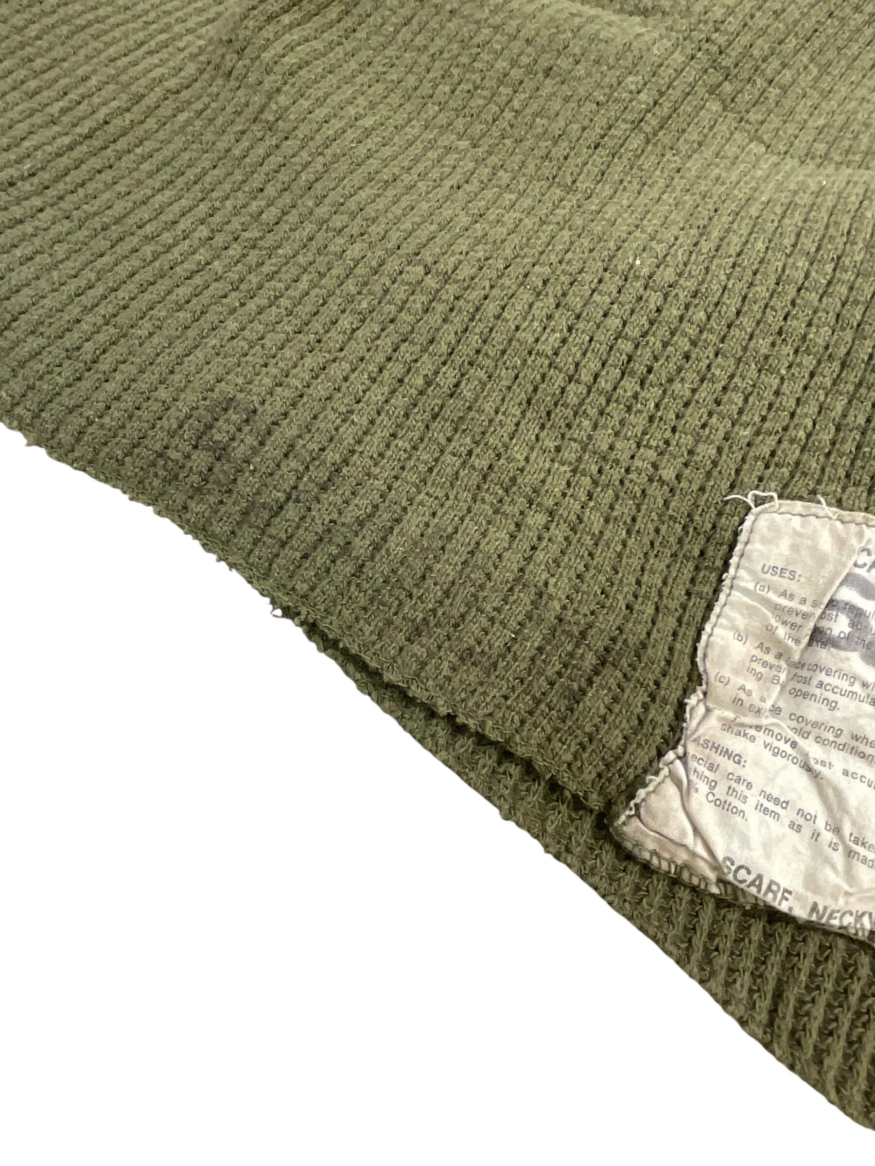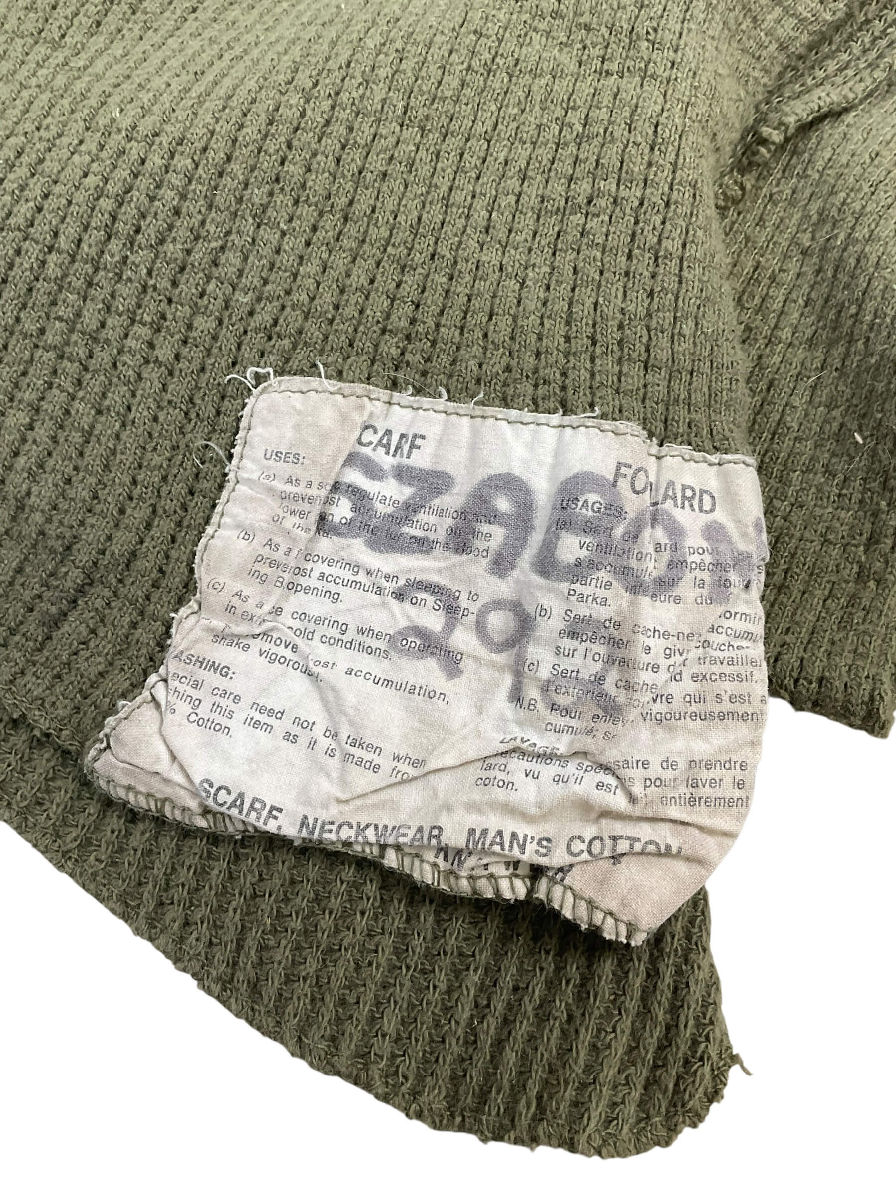 The Canadian Army OD Green Combat Scarf is a standard-issue garment used by Canadian military personnel. Made from lightweight cotton or cotton-blend fabric, this scarf is designed for versatility in various field conditions. The olive drab (OD) green color provides effective camouflage in forested and temperate environments, aligning with standard Canadian Armed Forces uniform requirements. Typically measuring approximately 60 inches in length and 12 inches in width, the scarf can be worn around the neck, over the face, or under headgear to provide protection against dust, wind, and sun. It can also serve practical uses, such as an improvised first aid bandage or sling. The simple rectangular design features stitched or hemmed edges for durability. Commonly issued from the mid-20th century onward, the OD Green Combat Scarf is recognized as a staple element among Canadian military field gear. This item reflects standard military utility and uniform regulations within the Canadian Armed Forces