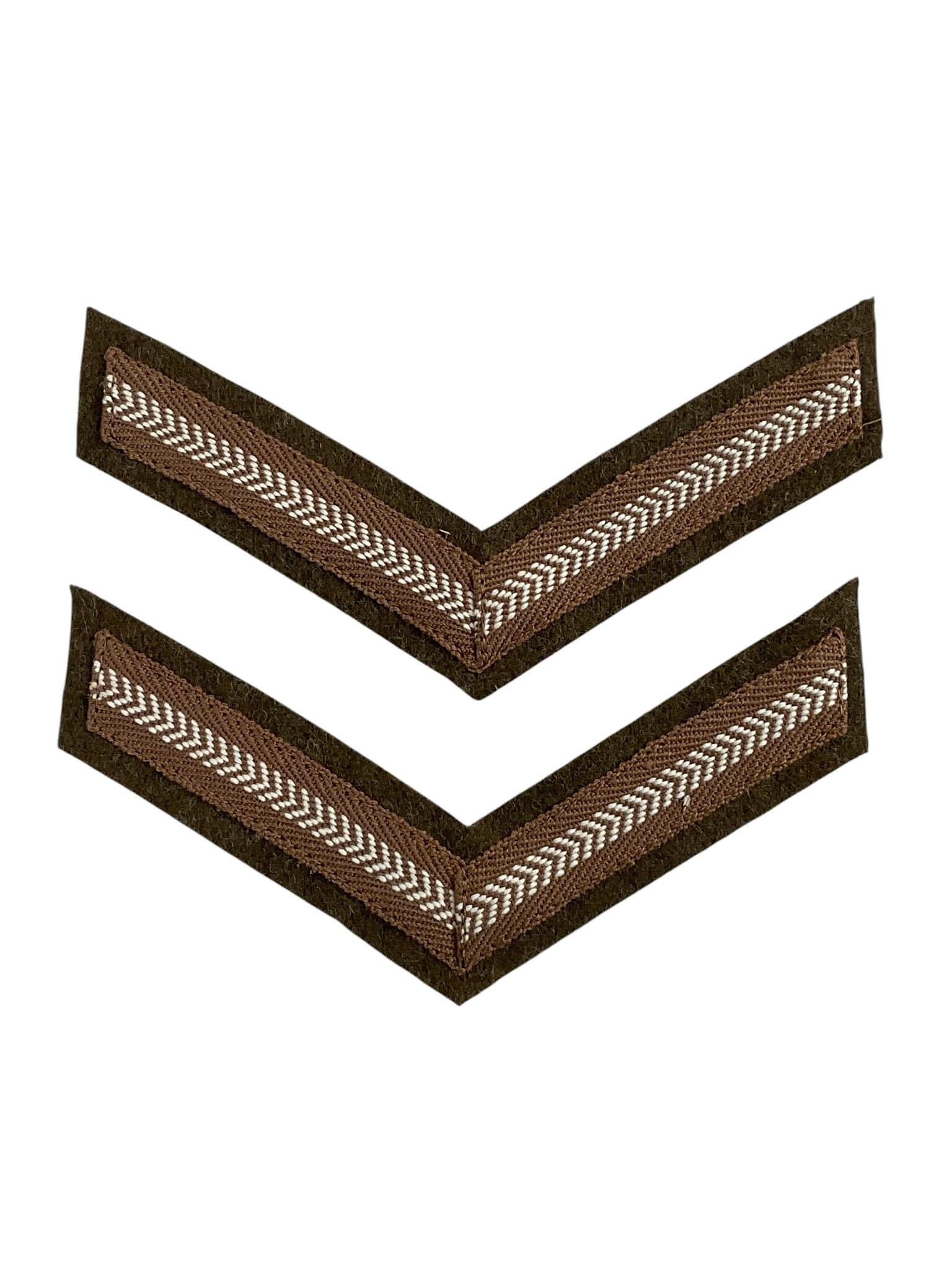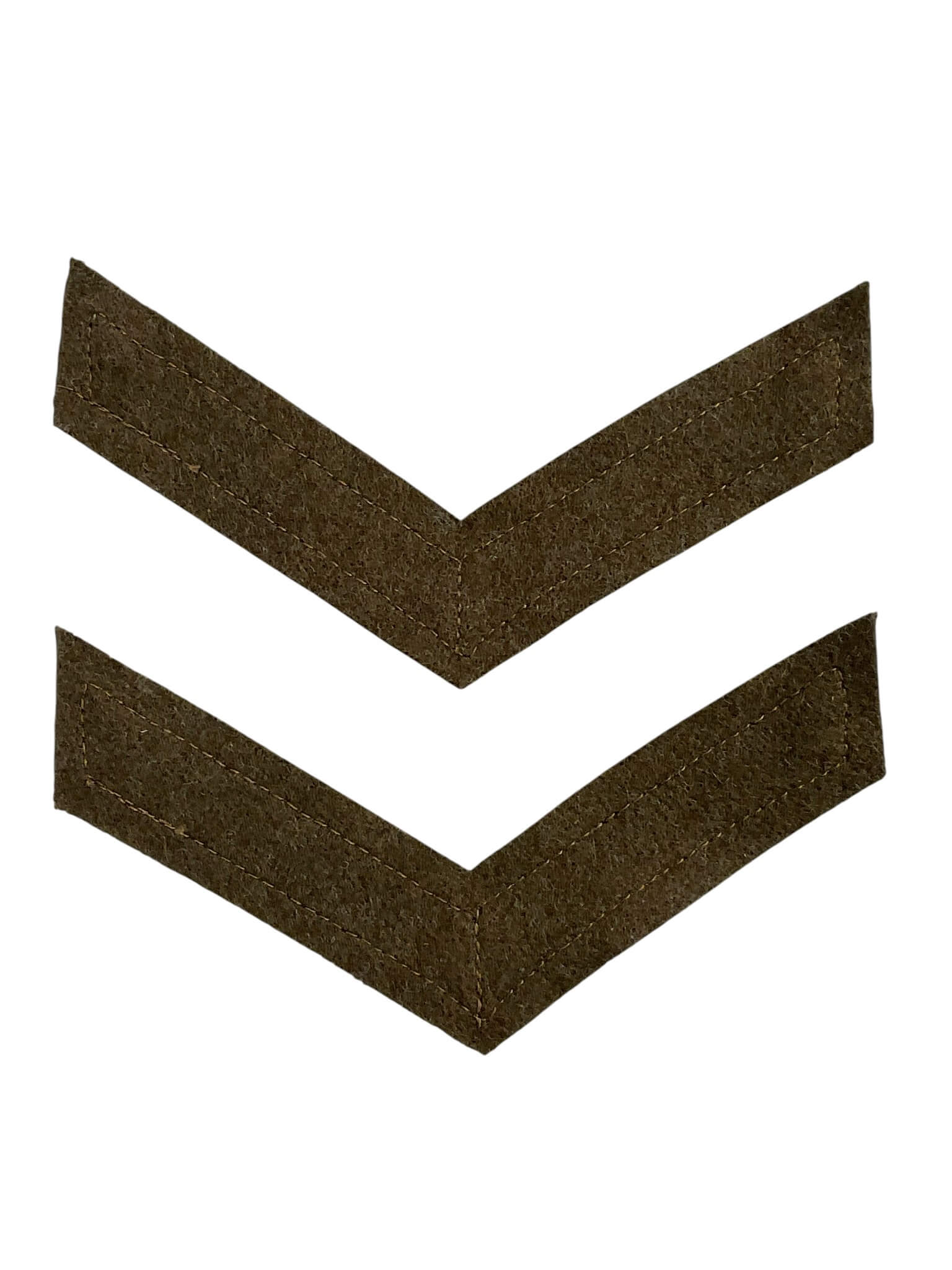 The Canadian Army Private Rank Insignia Pair consists of two matching cloth patches representing the rank of Private in the Canadian Army. Typically, this insignia is worn on the uniform sleeve and signifies the entry-level rank for enlisted personnel. The rank insignia generally features a single, plain chevron rendered in appropriate thread colors, corresponding to the era and branch specifications. These insignia pairs were produced for wear on standard-issue combat and dress uniforms. Canadian Army insignia designs have evolved over time, so variations may exist in materials, stitching, and dimensions based on date of manufacture and uniform regulations. This pair is representative of the standardized insignia used to denote a Private during a specified period of service. Items such as these are of interest to collectors, historians, and individuals researching military attire and rank structure in the Canadian Armed Forces. Condition and exact appearance can vary depending on age and previous use.