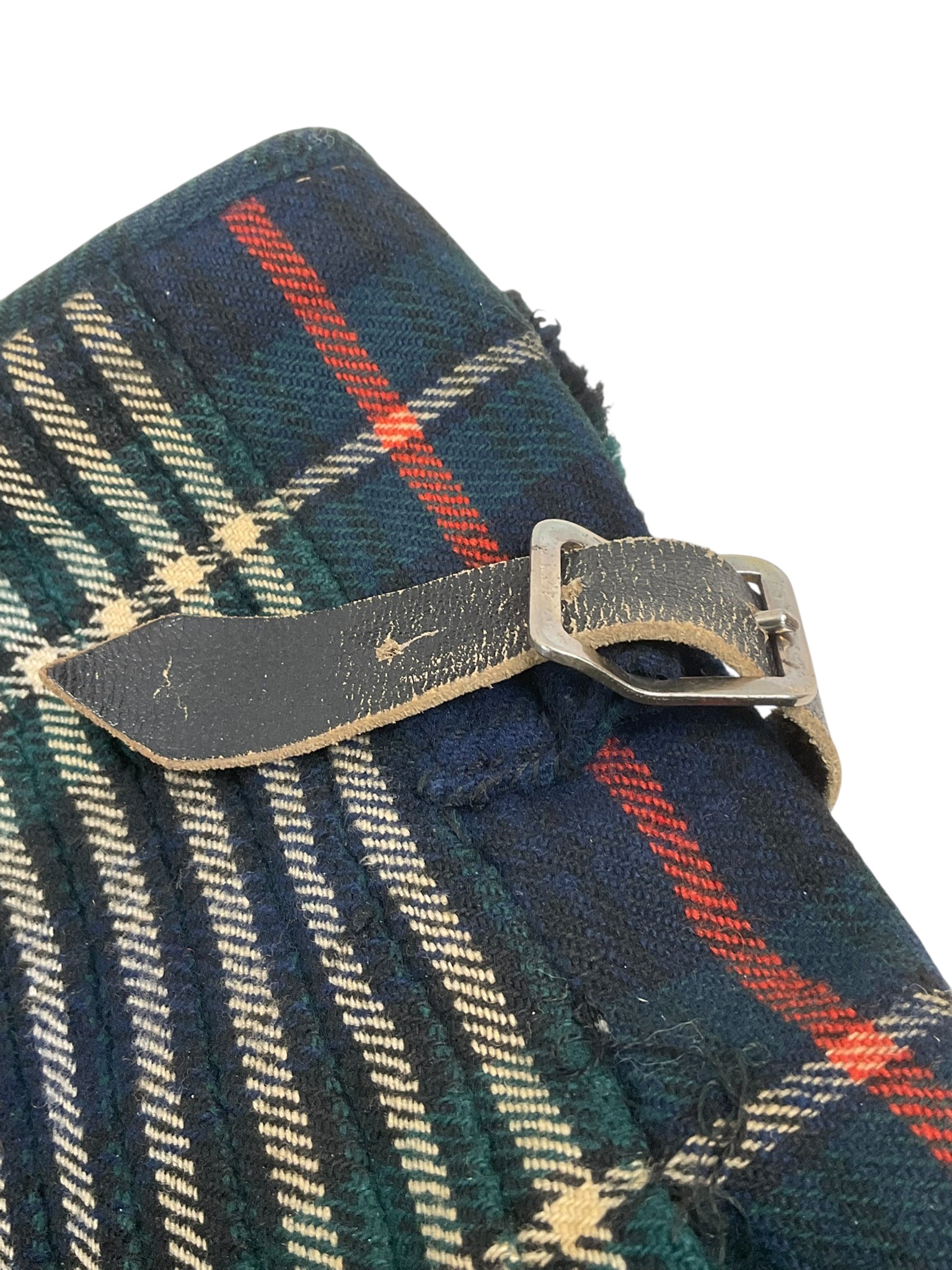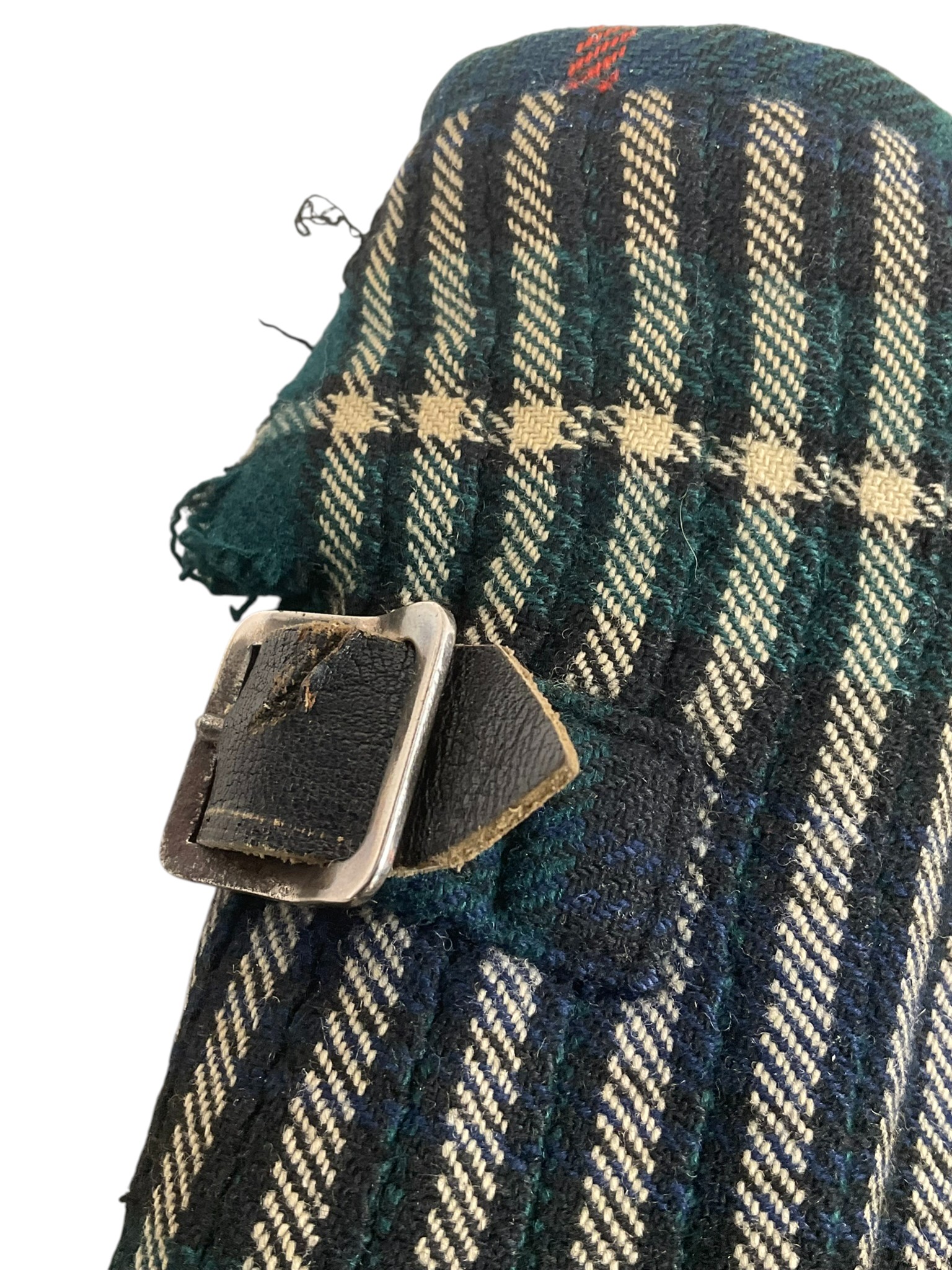 The Canadian Army Seaforth Highlanders Kilt is a traditional military garment associated with the Seaforth Highlanders of Canada, a distinguished infantry regiment with Scottish heritage. This example measures 32 inches at the waist and 26 inches in drop length. The kilt is constructed from wool fabric and features the regiment’s signature tartan pattern, typically a modified Mackenzie tartan characterized by its green, blue, and black stripes with thin red and white lines. Kilts of this type were standard issue for ceremonial and full dress occasions and are notable for their pleated design at the back, leather straps, and buckles for adjustment. The Seaforth Highlanders played significant roles in Canadian military history, and their uniforms remain a symbol of regimental identity. This kilt reflects period military tailoring and is representative of the garments worn by soldiers during active service and formal events throughout the 20th century.