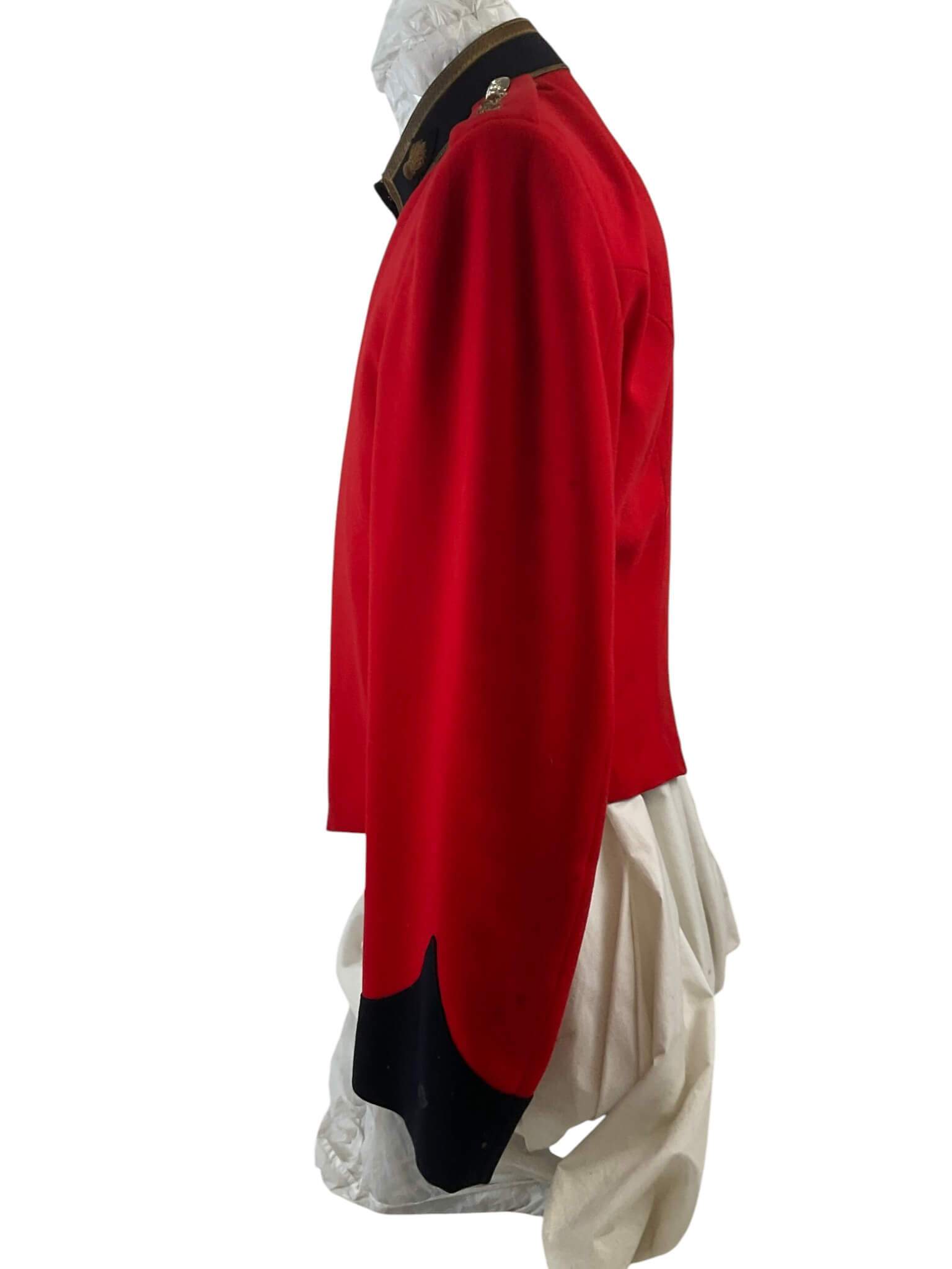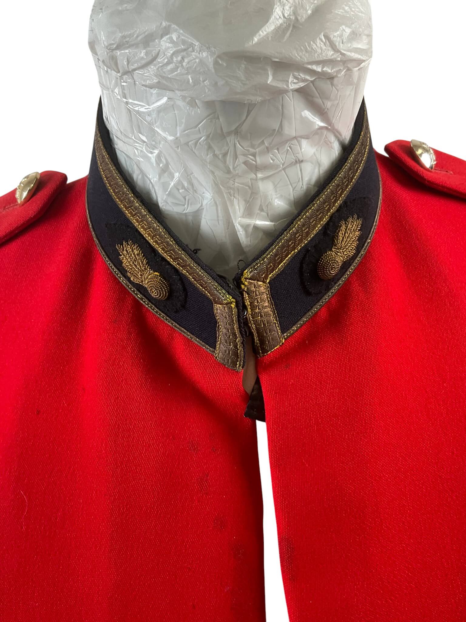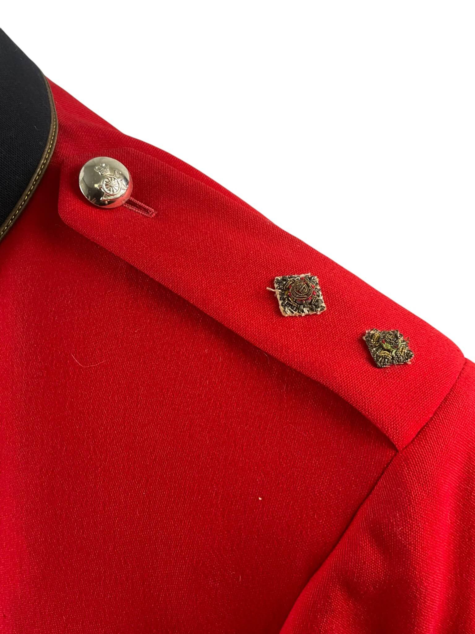 This Canadian Artillery Officer’s Named Mess Dress Jacket is an authentic example of formal military attire used by members of the Royal Regiment of Canadian Artillery. The garment is tailored in the traditional mess dress style, featuring a scarlet wool body, contrasting dark blue facings, and gold-toned trim. The cuffs and collar are adorned with regimental detailing, consistent with period specifications. The interior typically includes a silk or similar lining for comfort. Rank insignia and officer-specific embellishments are present on the epaulettes, and the original manufacturer’s labels or officer’s name tag can be found inside, confirming its provenance. This jacket represents the formal evening wear worn at regimental dinners, ceremonies, and special functions, where full dress was not required but high standards of presentation were maintained. Such items provide valuable insight into Canadian military traditions and the personal history of their former owners. Suitable for study or as part of a historical collection.