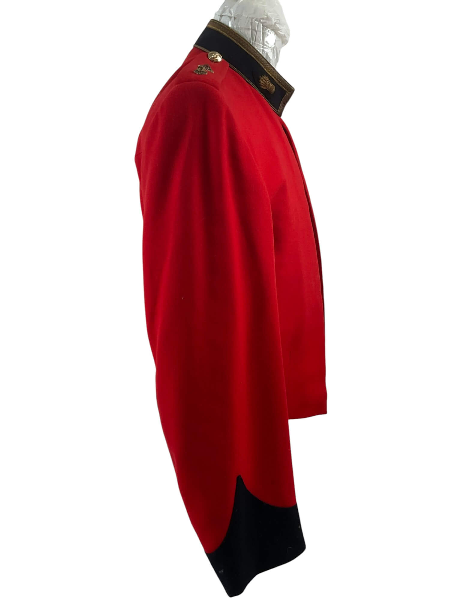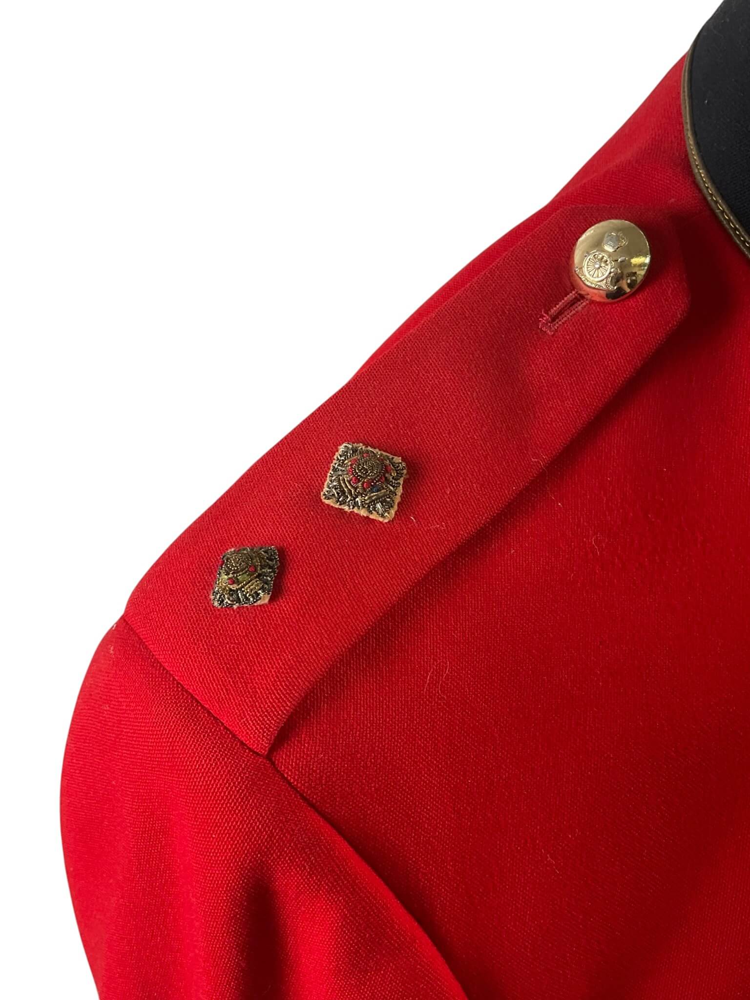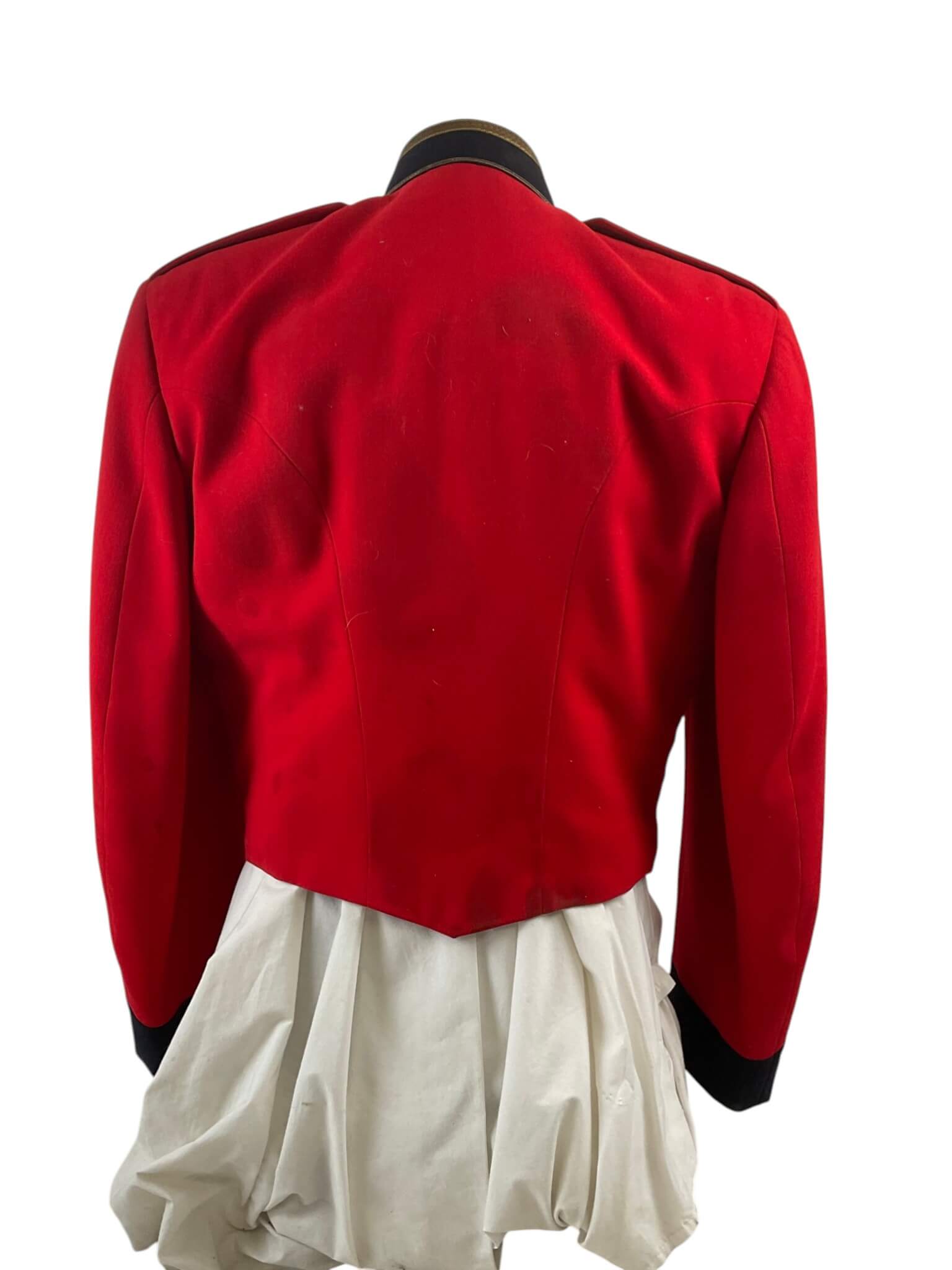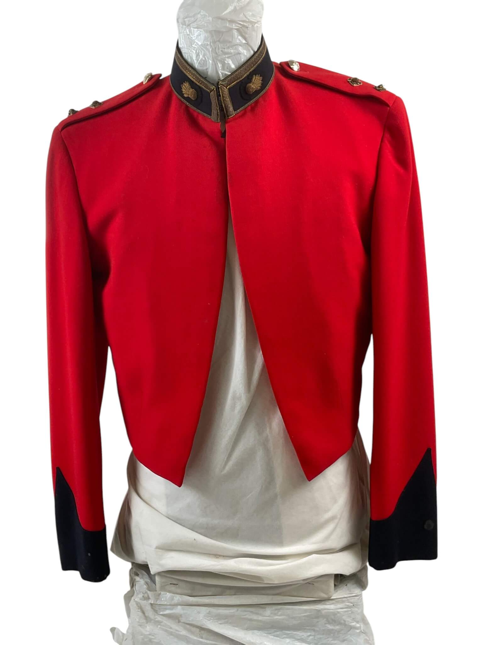 This Canadian Artillery Officer’s Named Mess Dress Jacket is an authentic example of formal military attire used by members of the Royal Regiment of Canadian Artillery. The garment is tailored in the traditional mess dress style, featuring a scarlet wool body, contrasting dark blue facings, and gold-toned trim. The cuffs and collar are adorned with regimental detailing, consistent with period specifications. The interior typically includes a silk or similar lining for comfort. Rank insignia and officer-specific embellishments are present on the epaulettes, and the original manufacturer’s labels or officer’s name tag can be found inside, confirming its provenance. This jacket represents the formal evening wear worn at regimental dinners, ceremonies, and special functions, where full dress was not required but high standards of presentation were maintained. Such items provide valuable insight into Canadian military traditions and the personal history of their former owners. Suitable for study or as part of a historical collection.