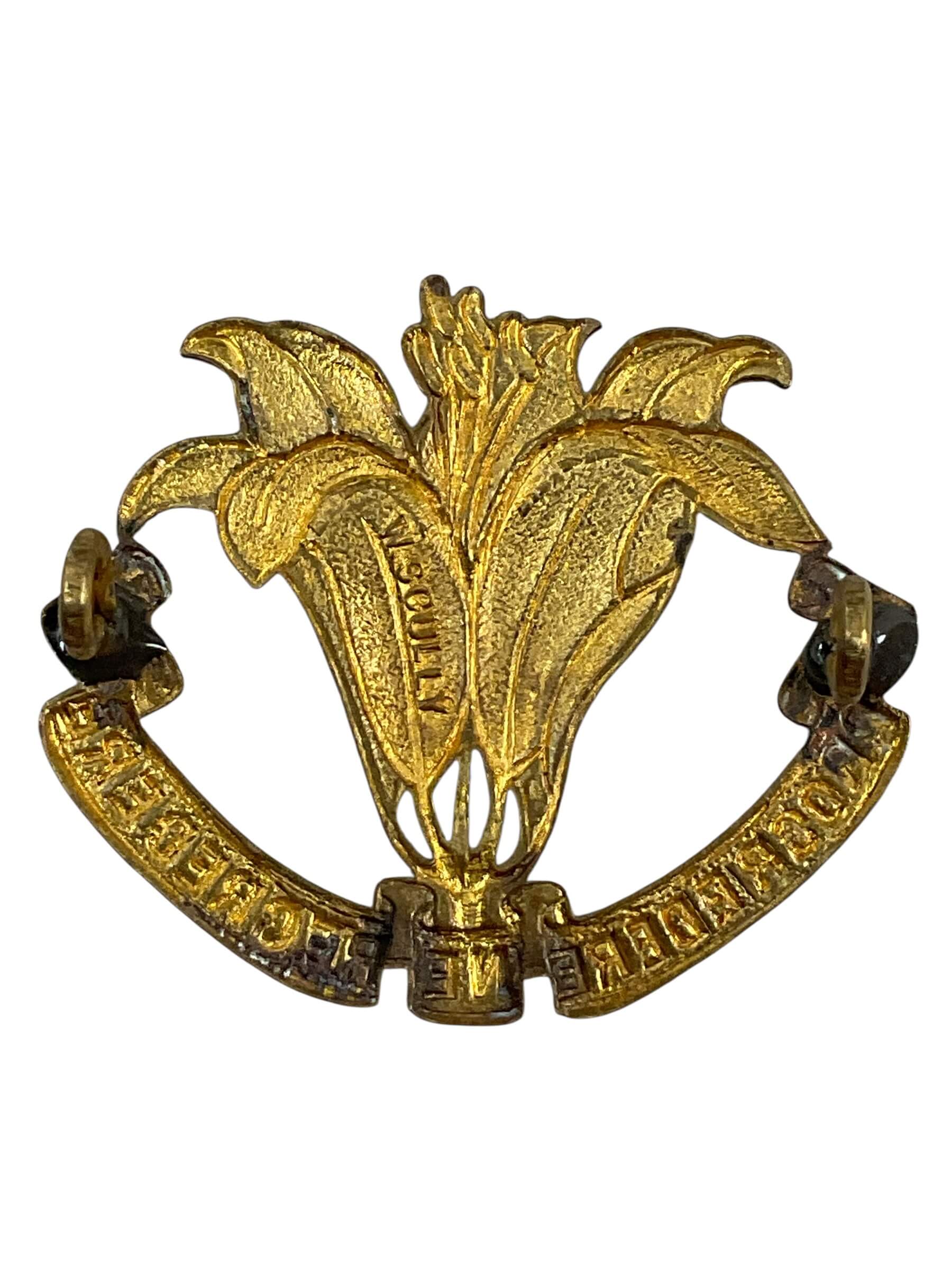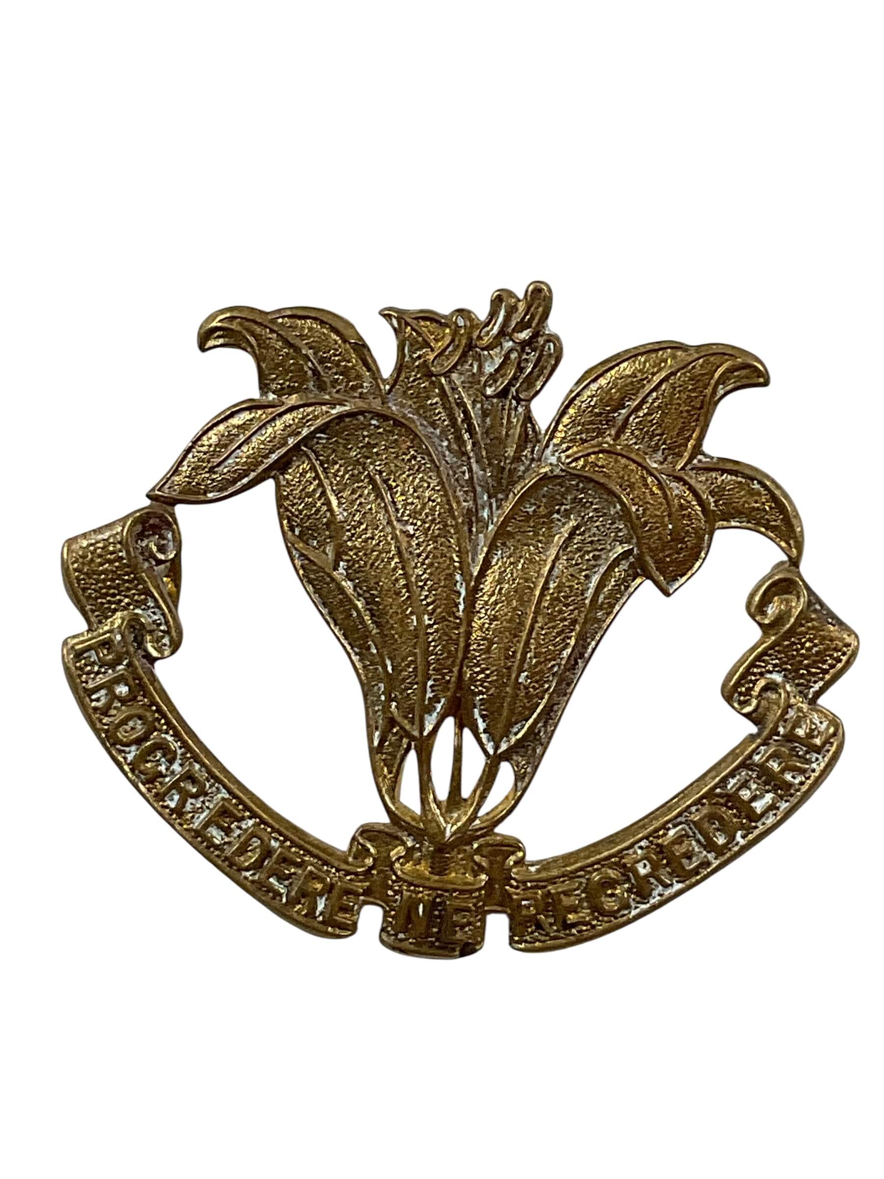 The Canadian Assiniboine Regiment Cap Badge is a military insignia associated with the Assiniboine Regiment, a Canadian militia unit formed in 1920 and later amalgamated into The Royal Winnipeg Rifles in 1954. This brass badge typically features a central maple leaf motif, a crown, and a scroll inscribed with the regiment’s name. The design reflects traditional Canadian military symbolism, with the maple leaf representing the nation and the crown indicating loyalty to the Crown. Cap badges such as this were worn on the headdress as identifying marks by members of the regiment. The fastening device on the reverse often consists of lugs or a slider affixed to the back of the badge, enabling secure attachment to the uniform. Cap badges serve as key identifiers for military units and are of interest to collectors for their historical and regimental associations. This item provides a tangible link to the heritage and organizational history of Canadian forces.