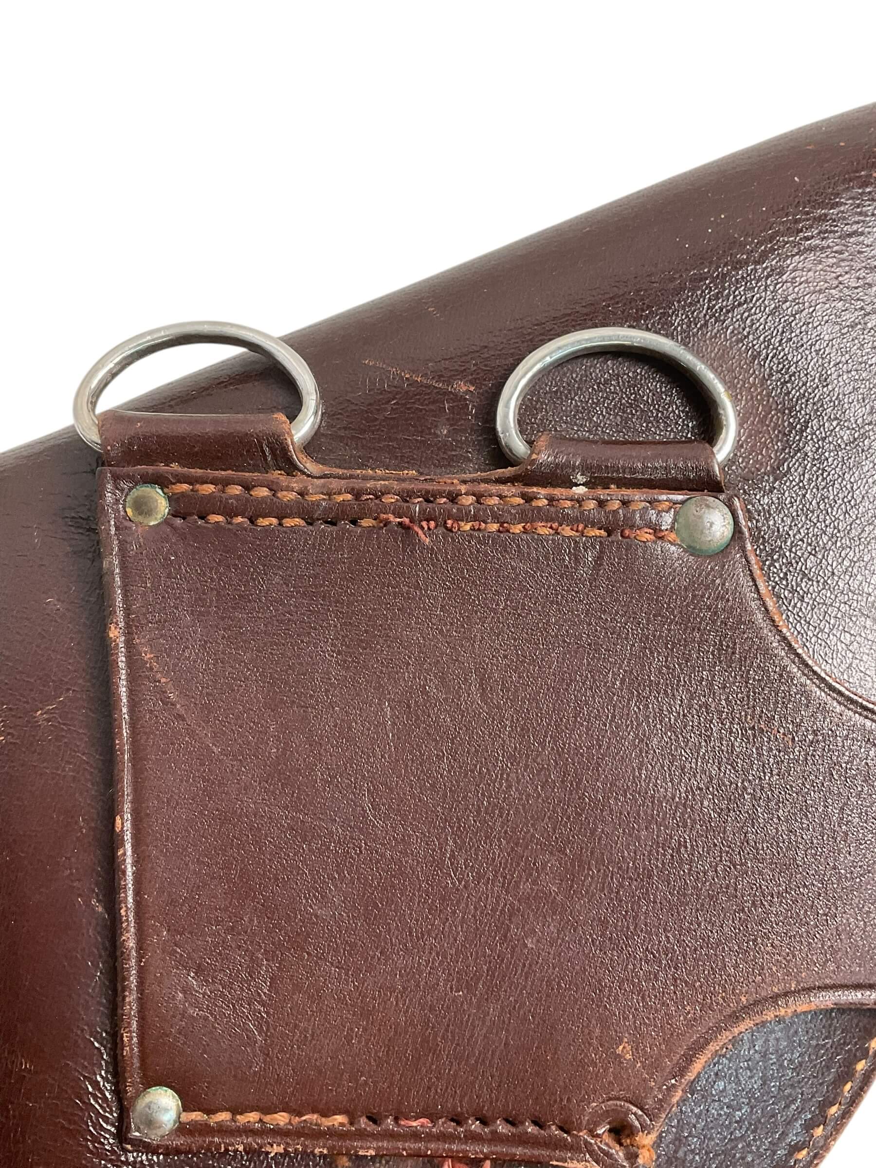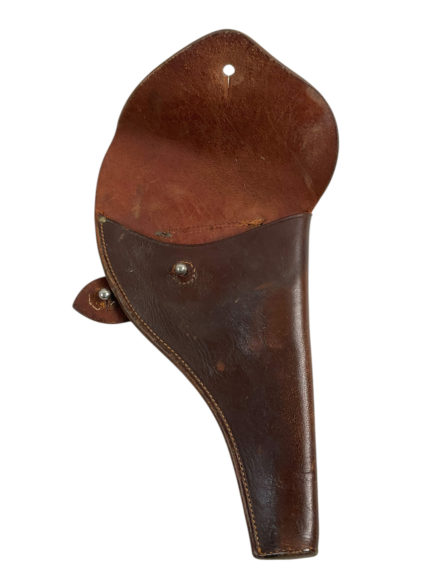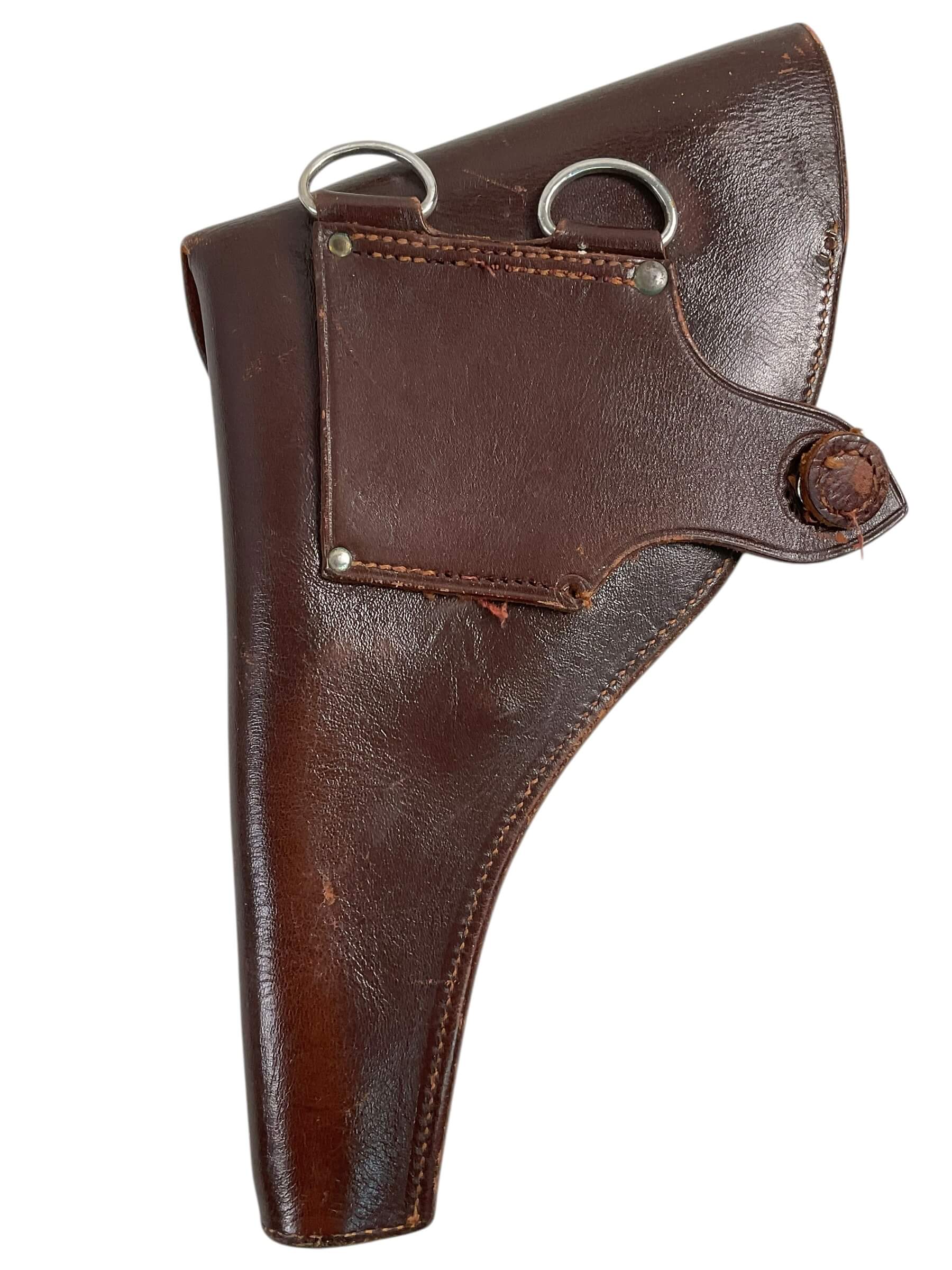 The Canadian British Army Sam Browne Holster is a standard-issue leather sidearm holster used by Canadian and British military personnel during the 20th century. Designed to be worn in conjunction with the Sam Browne belt, this holster is constructed from durable leather and often features a flap closure secured by a strap or snap fastener. The holster is designed to accommodate service pistols commonly used during the period, such as the Webley or Enfield revolver. It includes sturdy stitching, brass or metal hardware, and belt loops for secure attachment to the Sam Browne belt system. The design provided quick access to the sidearm while ensuring that the weapon remained protected and secure. The Sam Browne Holster has historical significance as a component of military dress and field equipment, and it reflects the standardization of military gear among Allied forces throughout both World Wars and subsequent decades.