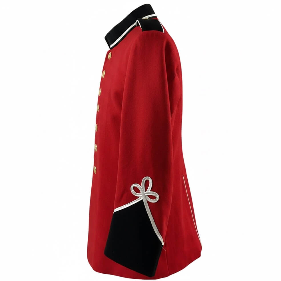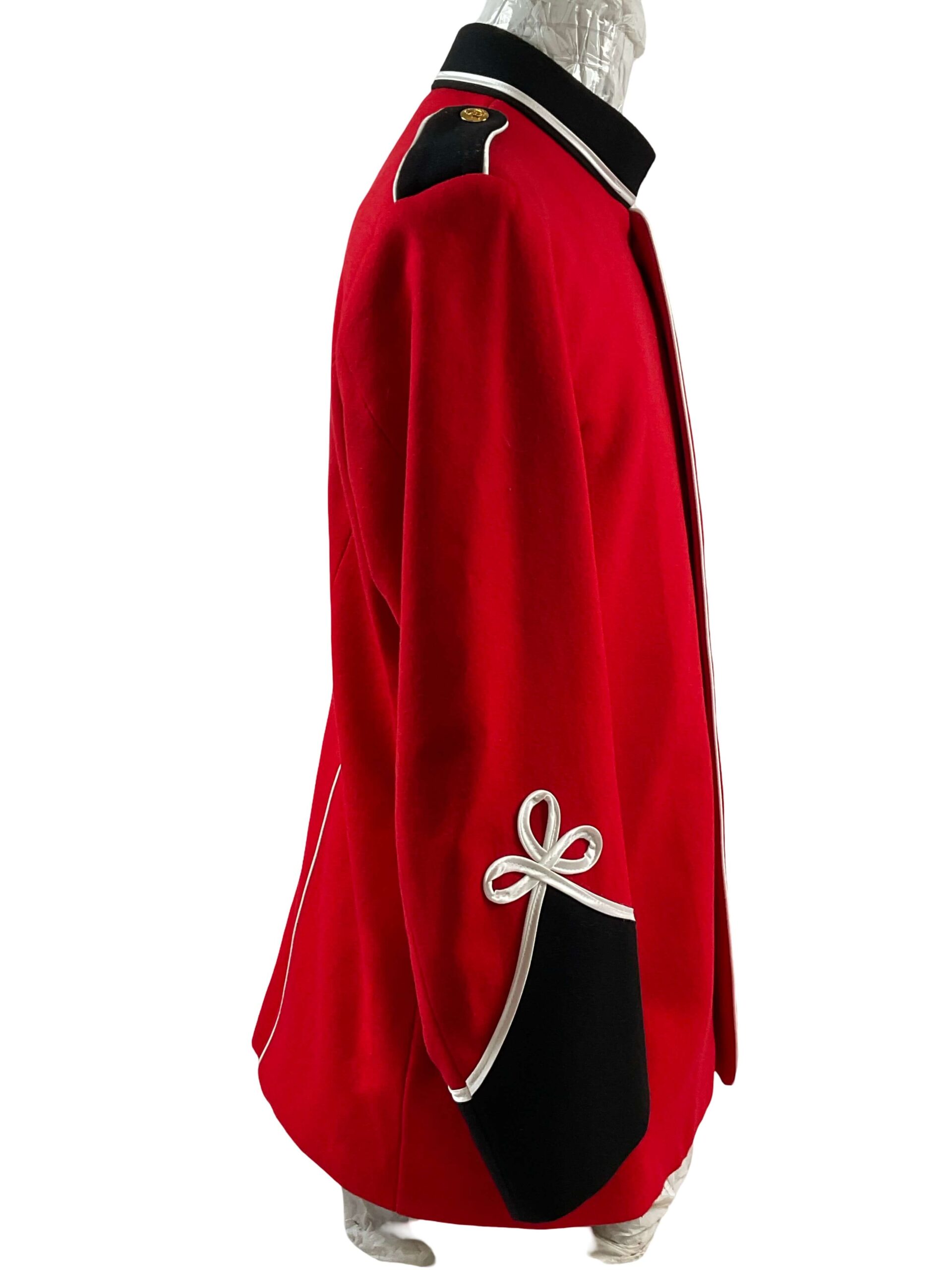 The Canadian British Infantry Scarlett Wool Tunic Size 40 Short is a military uniform garment modeled after the standard-issue tunics worn by British and Canadian infantry during the late 19th and early 20th centuries. Constructed from scarlet red wool, this tunic features a stand-up collar, brass buttons, and white piping that align with infantry dress regulations of the period. The tunic is tailored in a “Short” size variation, suitable for individuals with a chest measurement of approximately 40 inches. Such tunics were commonly used in formal parades, ceremonial events, and as part of the full-dress field uniform. The scarlet color was chosen for its traditional association with British military units. Details such as reinforcement stitching, internal lining, and button arrangements reflect the practical requirements and design standards of the era. This example offers insight into the military dress conventions practiced by British and Canadian forces prior to the widespread adoption of drab service uniforms.