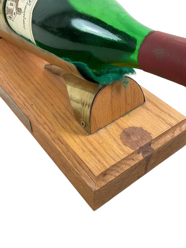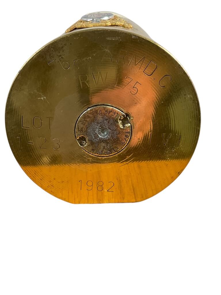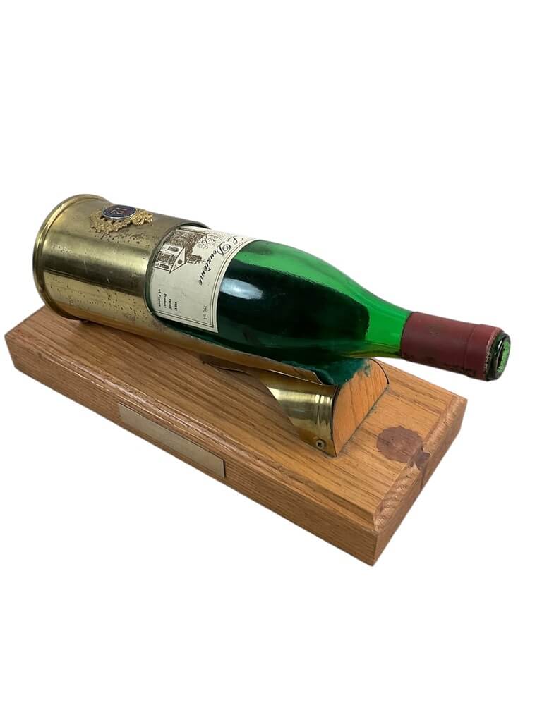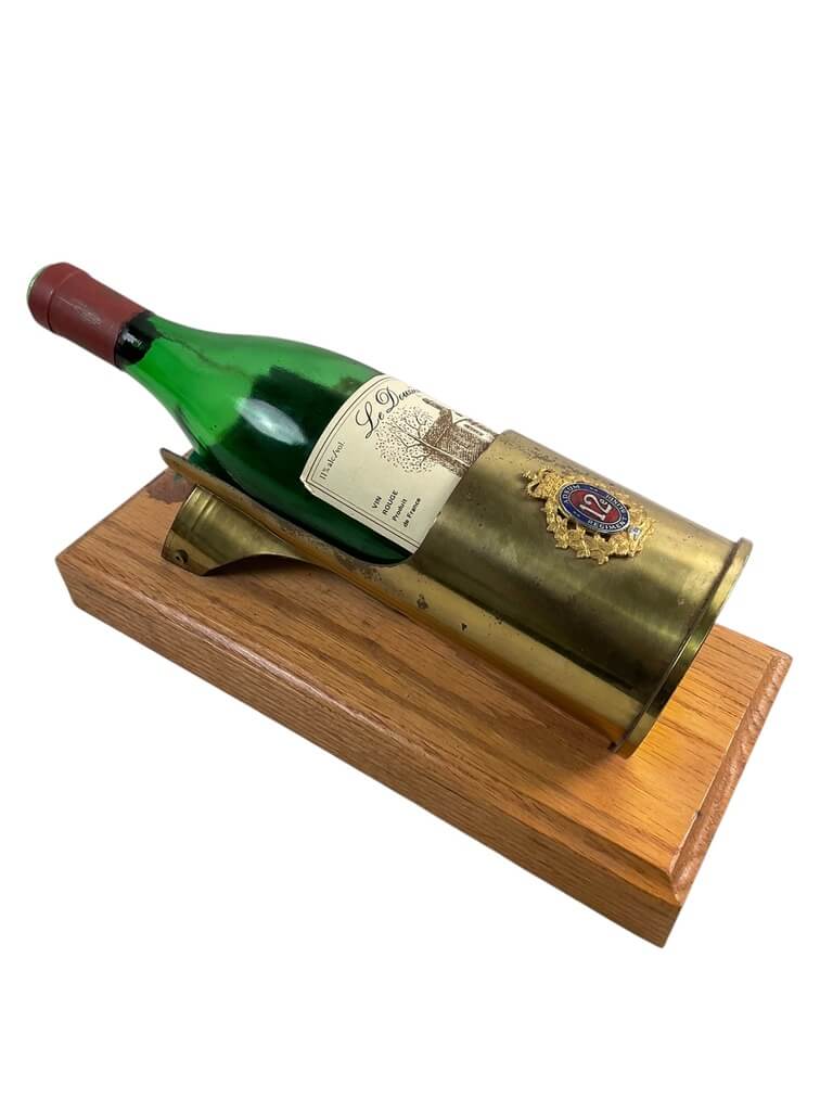 This item is a piece of trench art featuring a 76mm shell case associated with the Canadian Forces 12th Régiment blindé du Canada (12 RBC). Trench art refers to decorative objects made by military personnel, often from spent shell casings or other military surplus, typically during or after periods of conflict. The focal point of this piece is a regimental wine bottle, now empty, which is included with the shell. The 76mm shell case has likely been repurposed and shaped, incorporating regimental insignia or motifs linked to the 12th Régiment blindé du Canada, an armored regiment formed in the early 20th century. Such items were commonly created as commemorative or souvenir pieces reflecting regimental identity and camaraderie. This example illustrates the practice of turning battlefield or surplus materials into keepsakes that hold historical significance, both as artifacts of material culture and as records of military heritage.