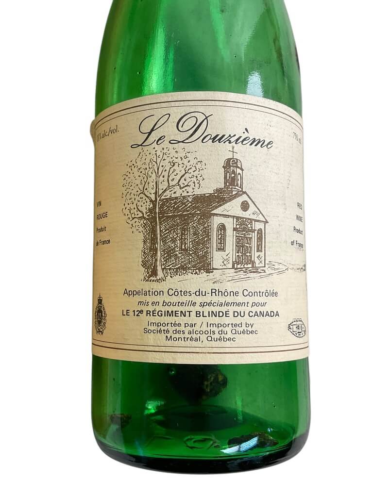 This item is a piece of trench art featuring a regimental wine bottle, associated with the Canadian Forces 12th Régiment blindé du Canada. The wine bottle is empty and is likely to have been modified or decorated as a form of trench art, a practice where military personnel repurposed spent ordnance or everyday objects during periods of downtime. The 12th Régiment blindé du Canada