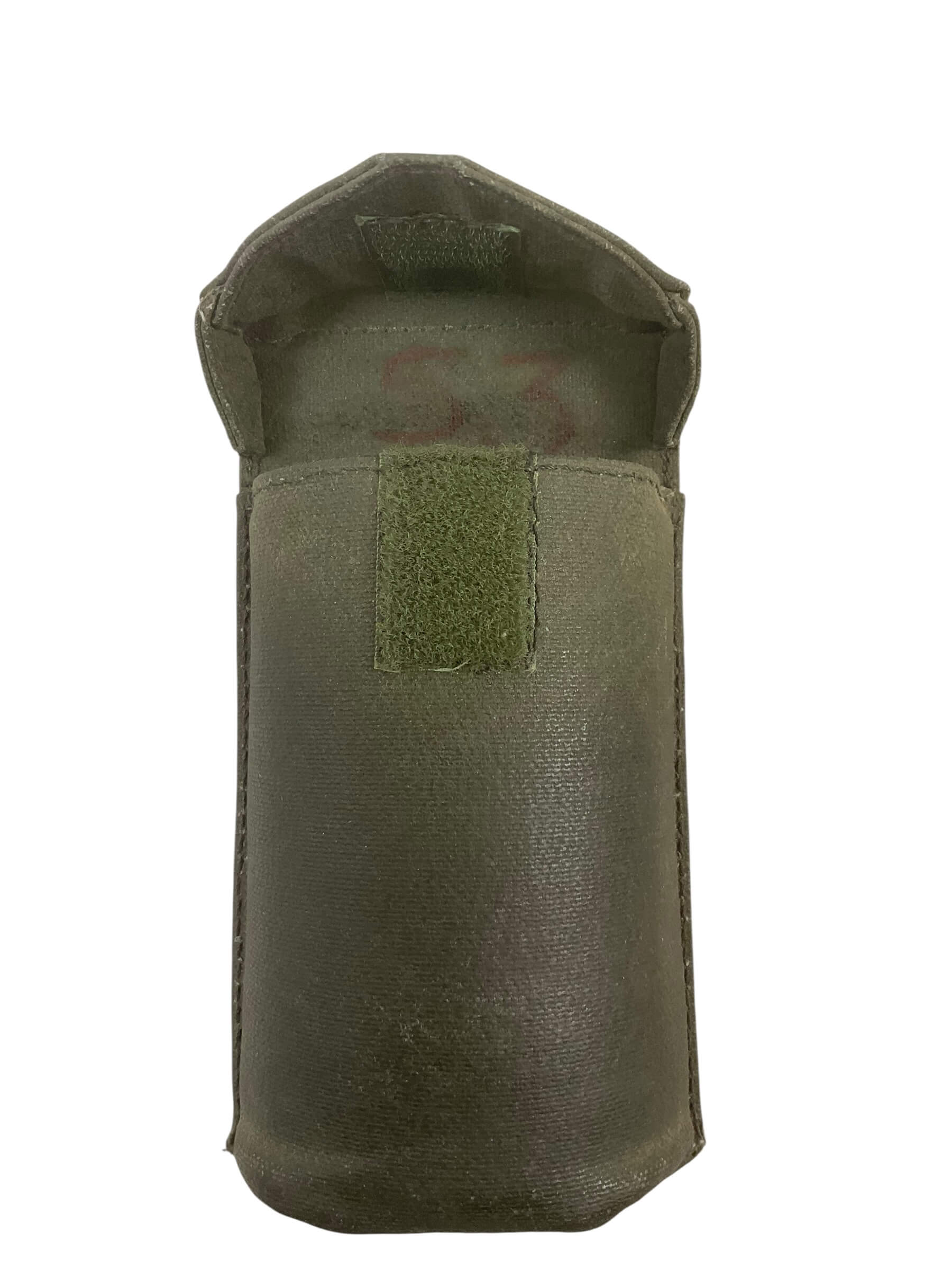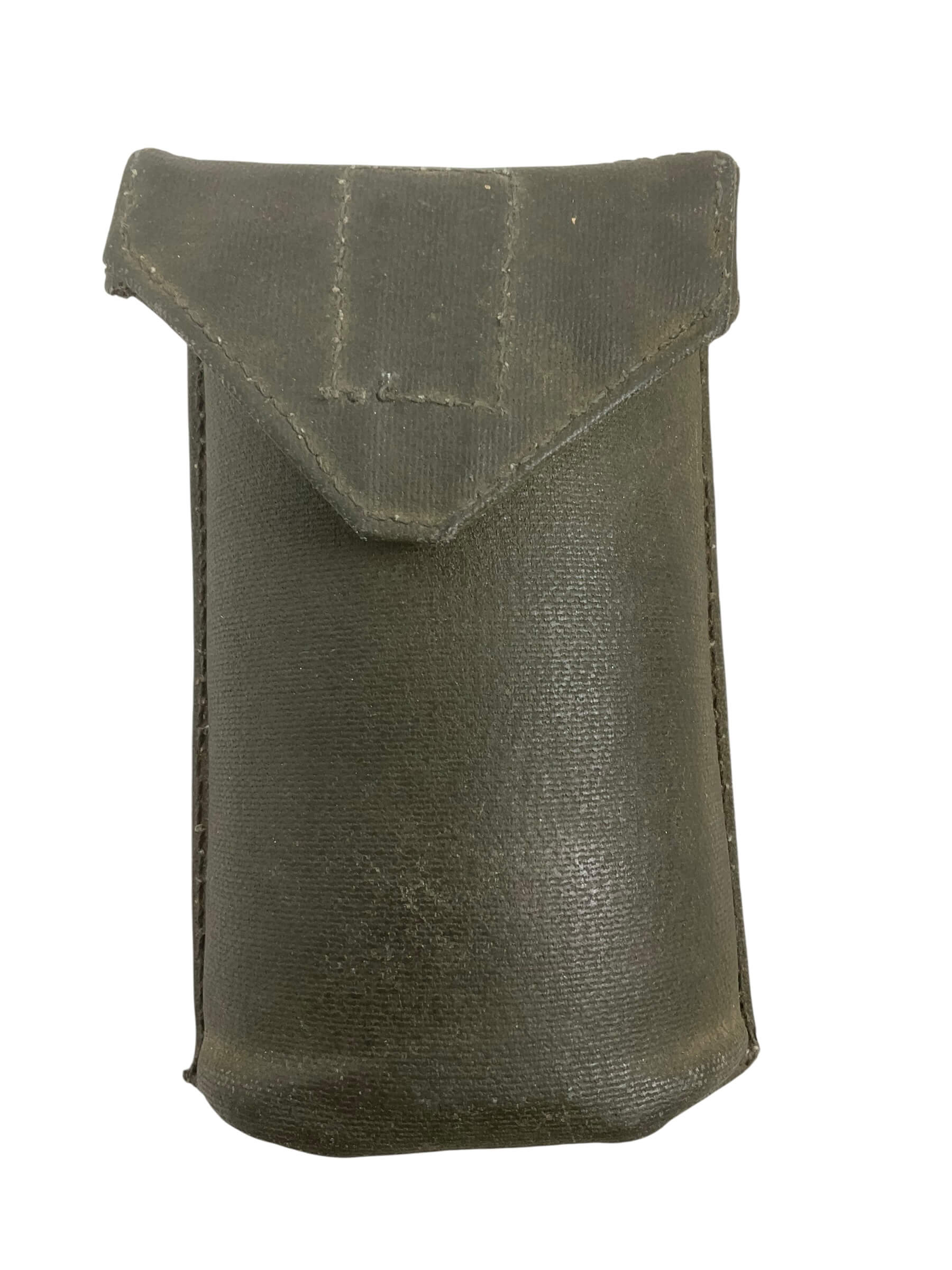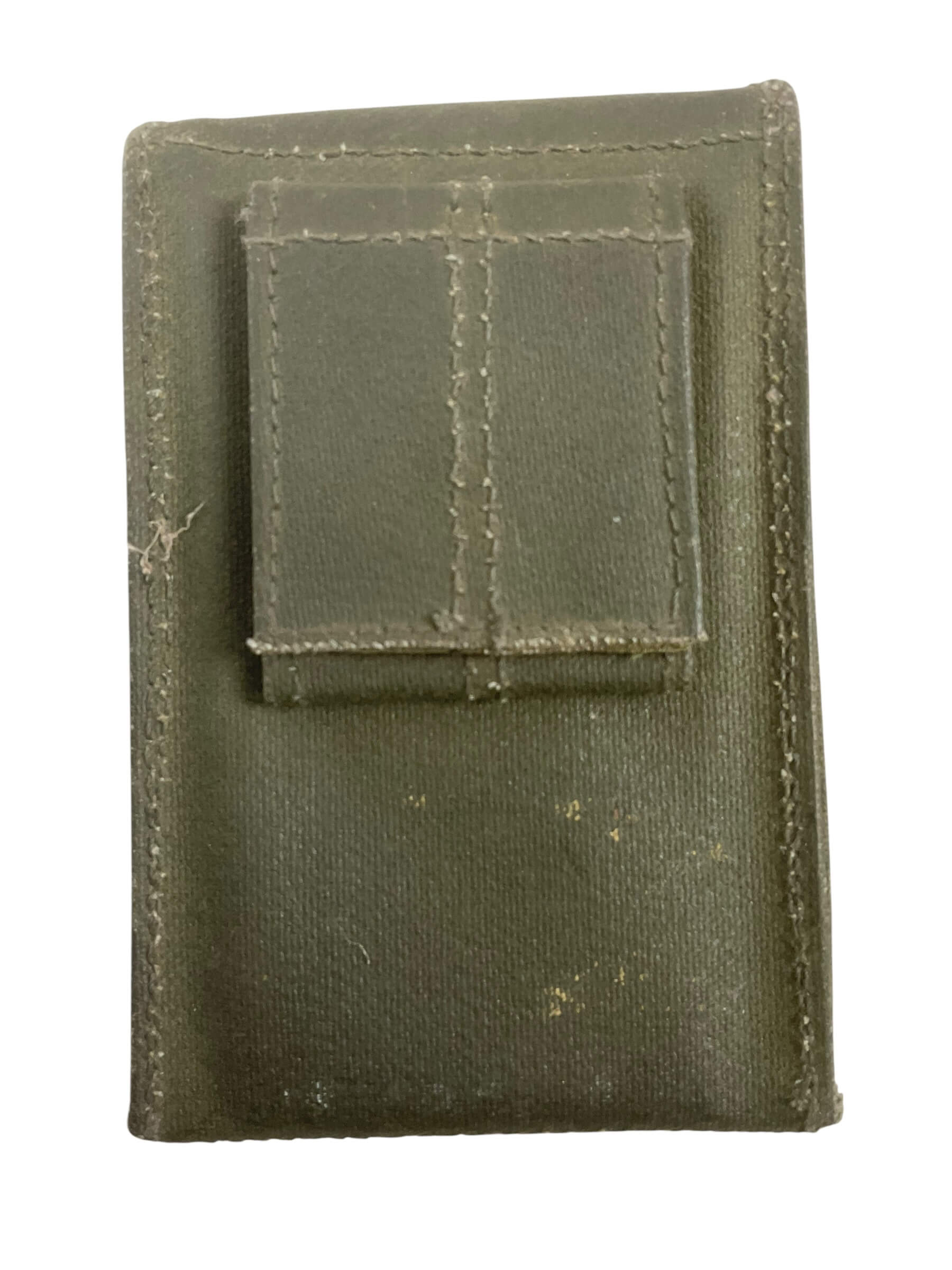 The Canadian Forces 64 Pattern Compass Pouch is a standard-issue military accessory designed to carry and protect a field compass. Introduced as part of the 1964 Pattern Web Equipment system, this pouch was issued to Canadian military personnel throughout the latter half of the 20th century. Constructed from heavy-duty olive green cotton canvas, it was designed for durability in various field conditions. The pouch measures approximately 3 x 3 x 2 inches and features a flap secured by a metal snap closure, ensuring the contents remain secure during movement. On the rear, it includes integrated webbing straps for attachment to standard 64 Pattern belts and equipment harnesses. The interior typically contains a simple compartment to accommodate most military-issue compasses. The direct and functional design of the 64 Pattern Compass Pouch reflects Canadian military gear standards during the era and makes it a relevant example of Cold War period equipment.