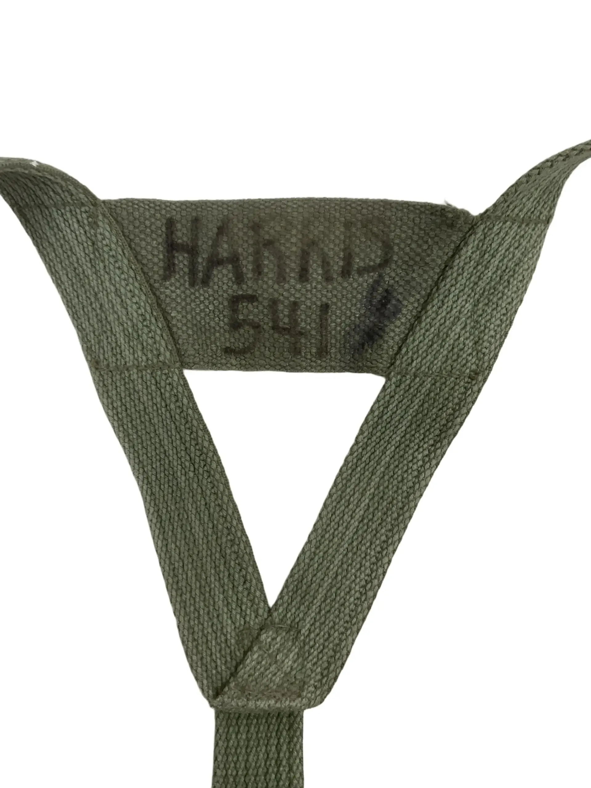 The Canadian Forces 64 Pattern Web Yoke Shoulder Straps are components of the 1964 Pattern web equipment system used by the Canadian military from the 1960s through to the 1980s. Made primarily from heavy-duty olive drab cotton webbing, these straps were designed to distribute the weight of load-bearing equipment across the wearer’s shoulders. The yoke attaches to the main belt and other elements of the 64 Pattern web gear, providing stability and support during field operations. Metal hardware, such as buckles and adjustment slides, is used to secure and customize the fit. Each yoke is typically marked or “named” with the original service member’s identification for accountability and issue purposes. These shoulder straps reflect the design evolution of Canadian military gear in response to postwar operational needs. The 64 Pattern system is recognized for its simplicity and robustness, making these yokes a representative artifact of late 20th-century Canadian military kit.