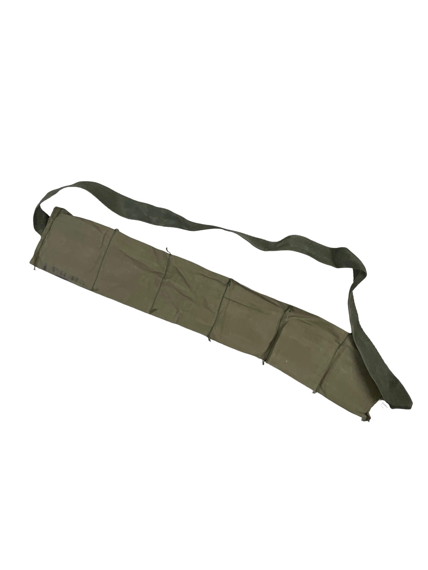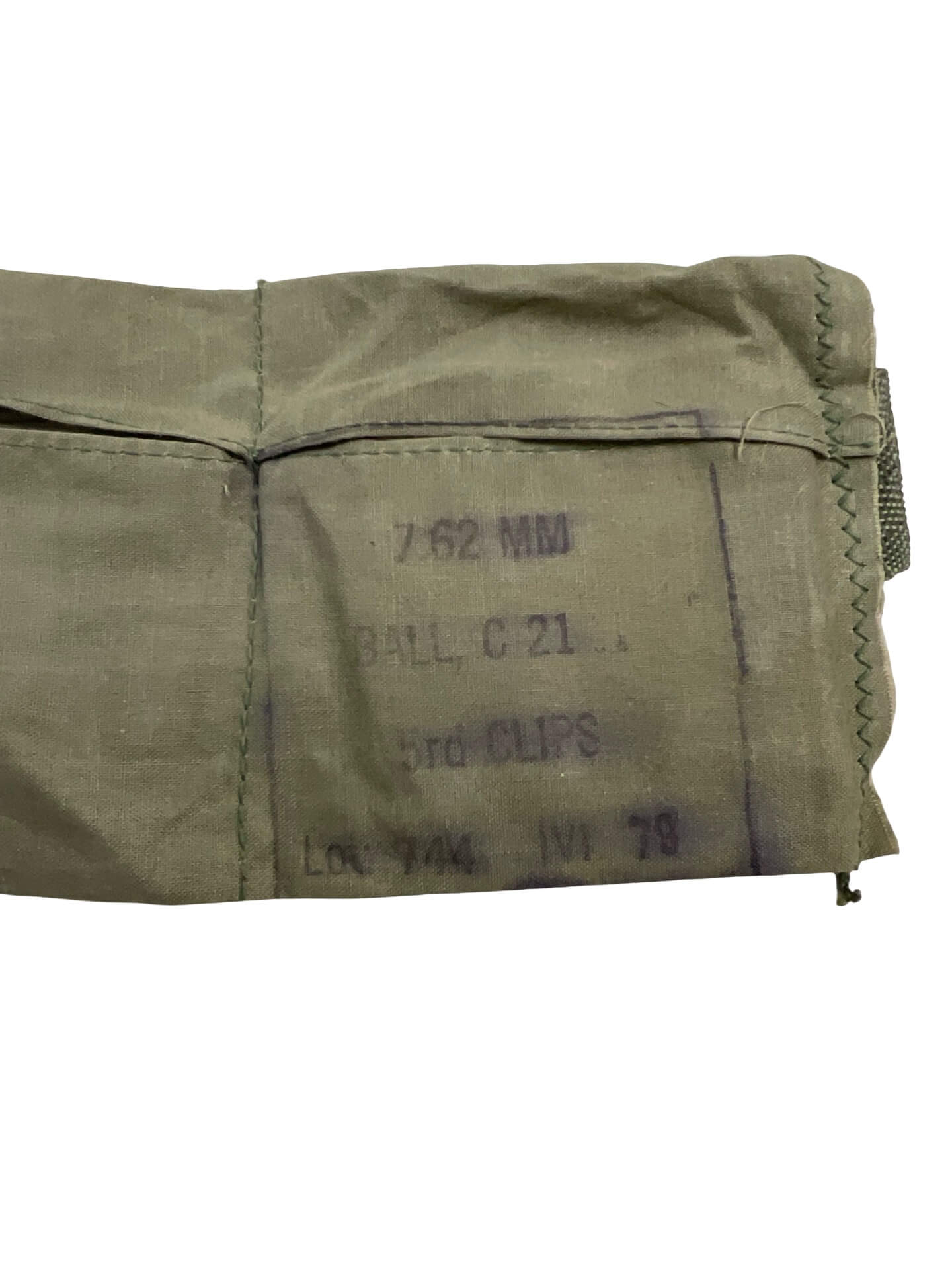The Canadian Forces 7.62 Bandolier is a canvas ammunition carrier originally issued to personnel of the Canadian military. Designed to accommodate 7.62mm NATO rifle cartridges, this bandolier typically features several pouches, each secured with a snap or flap closure, allowing for organized and rapid access to ammunition in the field. The bandolier is constructed from durable olive drab or khaki canvas, offering resistance to wear and suitable camouflage for a variety of operational environments. It is equipped with a shoulder strap for convenient carrying over the uniform or web gear. The 7.62 bandolier was commonly used in conjunction with automatic and semi-automatic rifles such as the FN C1 or C2 during the Cold War era and into later decades. This item reflects standard-issue Canadian military field equipment and offers insight into the logistics and equipment design of the period. Items may show typical signs of service use and handling.