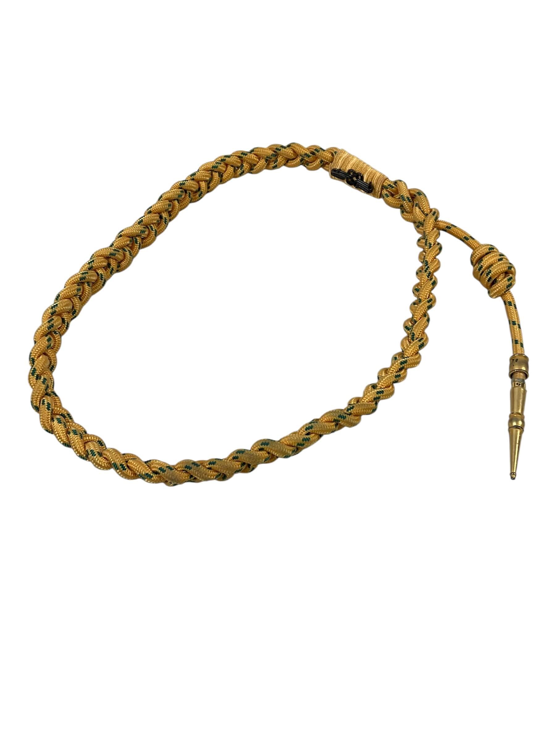 The Canadian Forces Aide-De-Camp Lieutenant General Aiguillette is a ceremonial item worn by aides-de-camp serving high-ranking officers within the Canadian military. This aiguillette is characterized by its distinctive gold cord construction, featuring intricately braided cords finished with metal tips, designed to drape over the right shoulder of the service dress uniform. The pattern and color of the aiguillette denote the rank of Lieutenant General and its specific role in signifying the aide’s official duties and close association with the senior officer. Typically, such aiguillettes are utilized during formal occasions and parades, reflecting longstanding military traditions of recognition and protocol. The item provides insight into the dress regulations and ceremonial practices of the Canadian Armed Forces, illustrating the importance of visual symbols in military hierarchy and function. Due to its association with a high command position, this aiguillette represents a specialized component of Canadian military regalia.