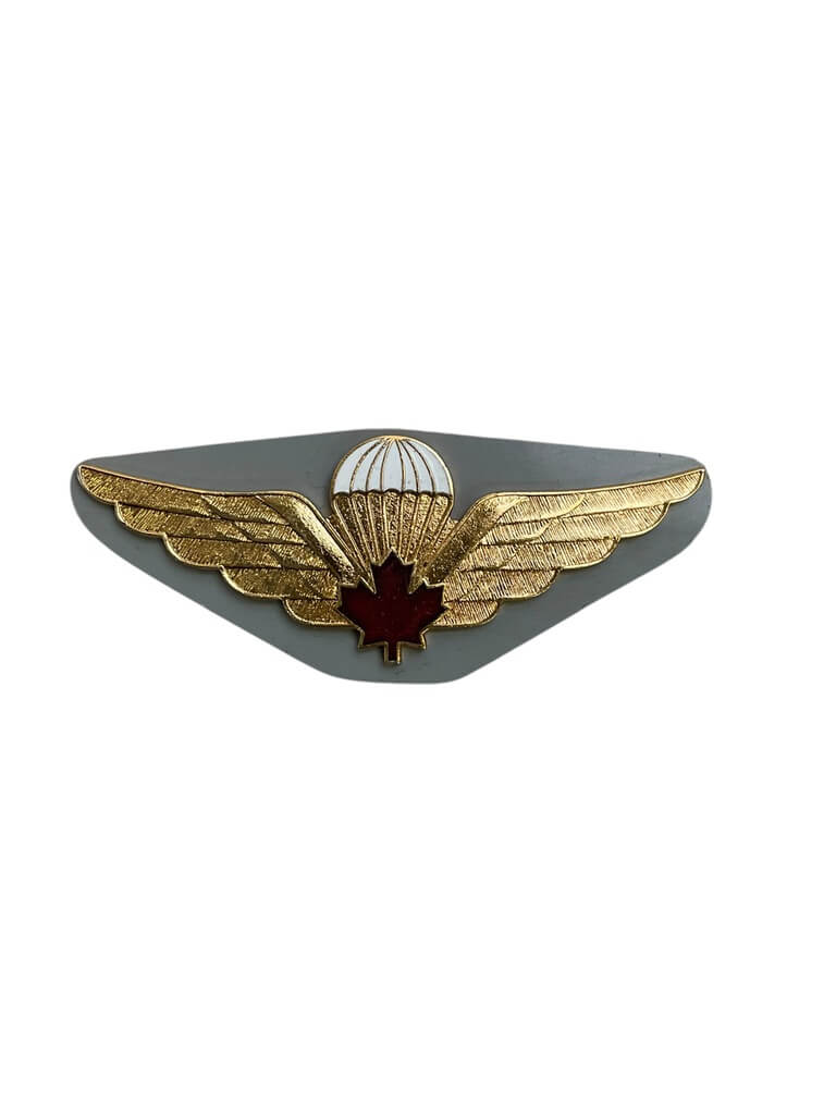 The ‘Canadian Forces Airborne Red Leaf Jump Wings Metal’ is a highly coveted insignia within the Canadian military, symbolizing an individual’s prowess and dedication in airborne operations. This beautifully crafted metal badge features a striking red maple leaf – the iconic emblem of Canada – flanked by two silver wings, signifying the airborne division. The intricate details and high-quality metalwork are indicative of the wearer’s accomplished parachute jumps and display their exceptional commitment to the Canadian Forces. This insignia is not only a badge of honor, but also a piece of Canadian military history. It serves as an excellent addition to any military memorabilia collection, ideal for veterans, active service members, or military enthusiasts. The ‘Canadian Forces Airborne Red Leaf Jump Wings Metal’ is a testament to courage, skill, and a proud symbol of Canadian military service.