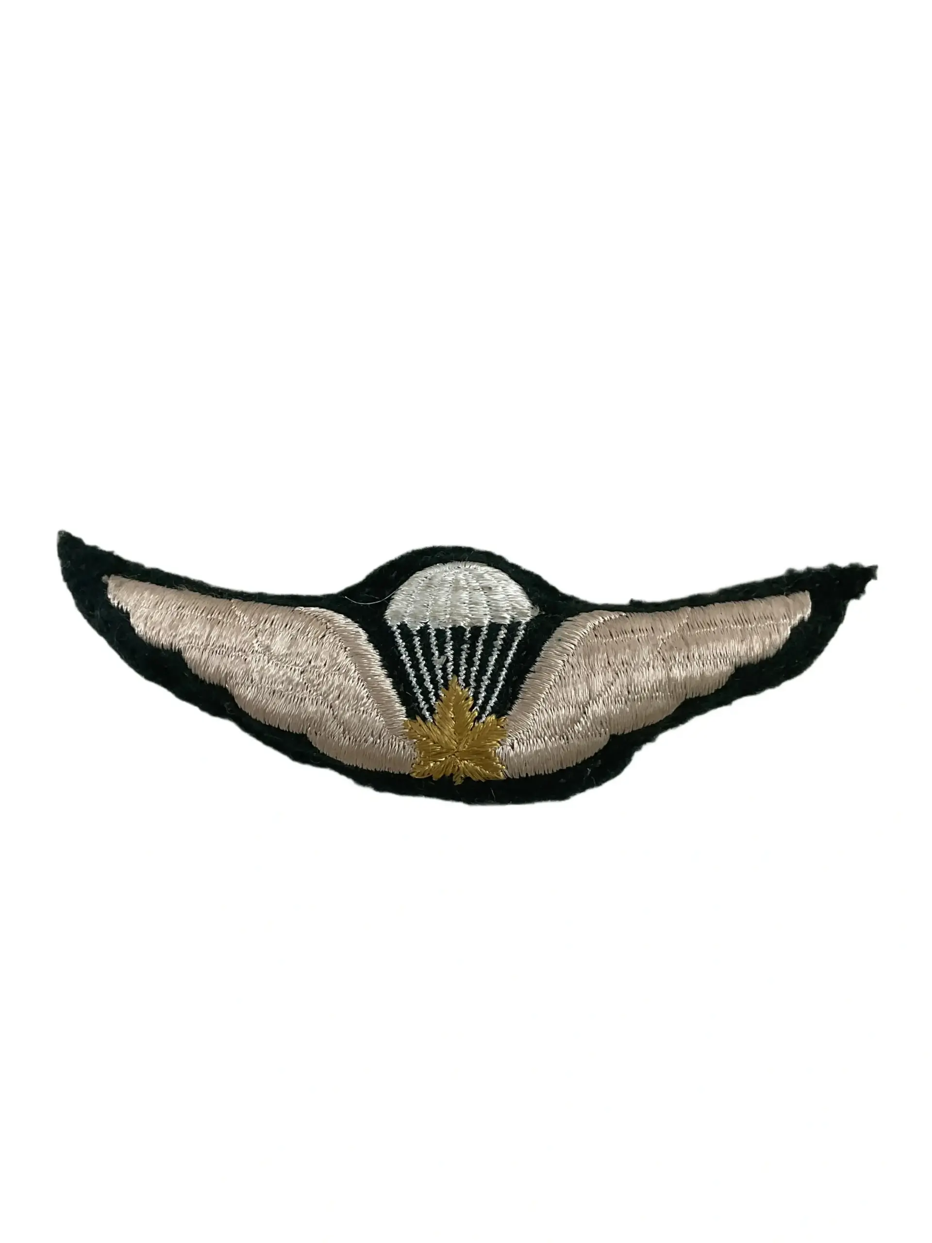 The Canadian Forces Airborne Regiment Padded Jump Wing is a cloth qualification badge awarded to personnel who successfully completed the Canadian military airborne training program. Introduced for the Airborne Regiment, this insignia features a central open-winged parachute design, rendered in white embroidery on a padded olive-drab or similar subdued background. Worn on the left breast of the uniform, the badge signifies completion of the Canadian Forces Basic Parachutist Course and association with airborne-qualified units. The padded version is distinguished by raised, quilted backing for enhanced durability and visibility on field uniforms. The Airborne Regiment, established in 1968 and disbanded in 1995, was the primary Canadian airborne infantry unit during its operational period, and the jump wing remains a symbol of elite qualification. This item represents both Canadian military heritage and the tradition of parachute operations within the armed forces. The badge is of interest to collectors of military insignia and airborne memorabilia.