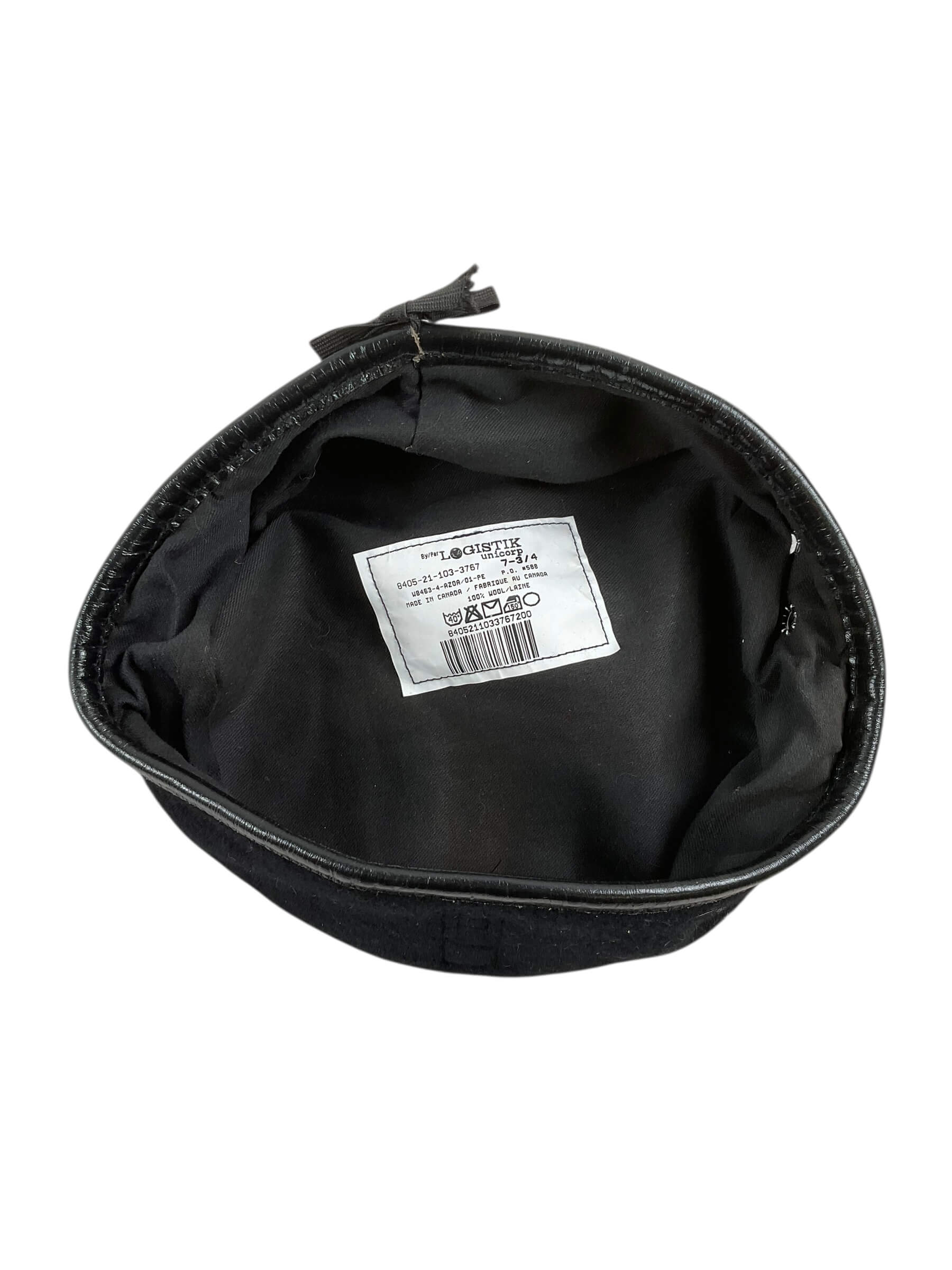 This Canadian Forces Black Beret in size 7 3/4 is a symbol of military pride and professionalism. It is made from superior quality wool and designed to meet the rigorous standards of the Canadian Armed Forces. The beret is dyed in a rich, black hue, denoting the distinct identity of our military personnel. It features a leather trim for durability, and a silk lining for comfort, ensuring a perfect fit for individuals with a head circumference of 7 3/4 inches. Its design includes a small, stiff patch for the Canadian Armed Forces cap badge. This beret provides an excellent blend of tradition, functionality, and style. Whether for active duty, ceremonies, or as part of a collection, this beret embodies the steadfast spirit of the Canadian Forces.