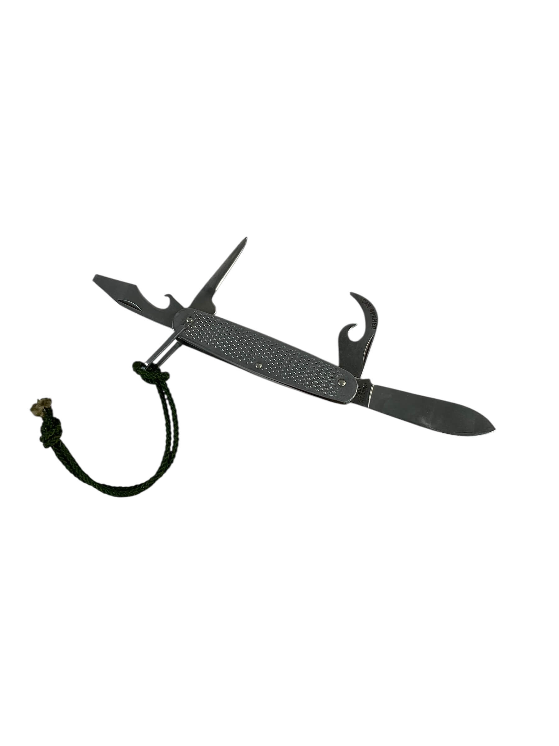 The Canadian Forces C4 Pocket Knife Camillus 1983 is a standard issue multi-tool produced for the Canadian military. Manufactured by Camillus Cutlery Company, this model was utilized by Canadian service members during the early 1980s. The C4 knife features a stainless steel construction with a matte finish and a durable, utilitarian design suited for field use. Its primary components include a spear-point blade, can opener, bottle opener, flathead screwdriver, and an integrated marlin spike, which assists in rope work and knot tying. The handle is marked with “CAMILLUS 1983,” indicating its year of production and manufacturer. With a compact, foldable form, this knife fits easily in a uniform pocket or gear pouch. The Canadian Forces C4 Pocket Knife represents a practical example of military-issued equipment, reflecting both the functional requirements and production standards of its time.