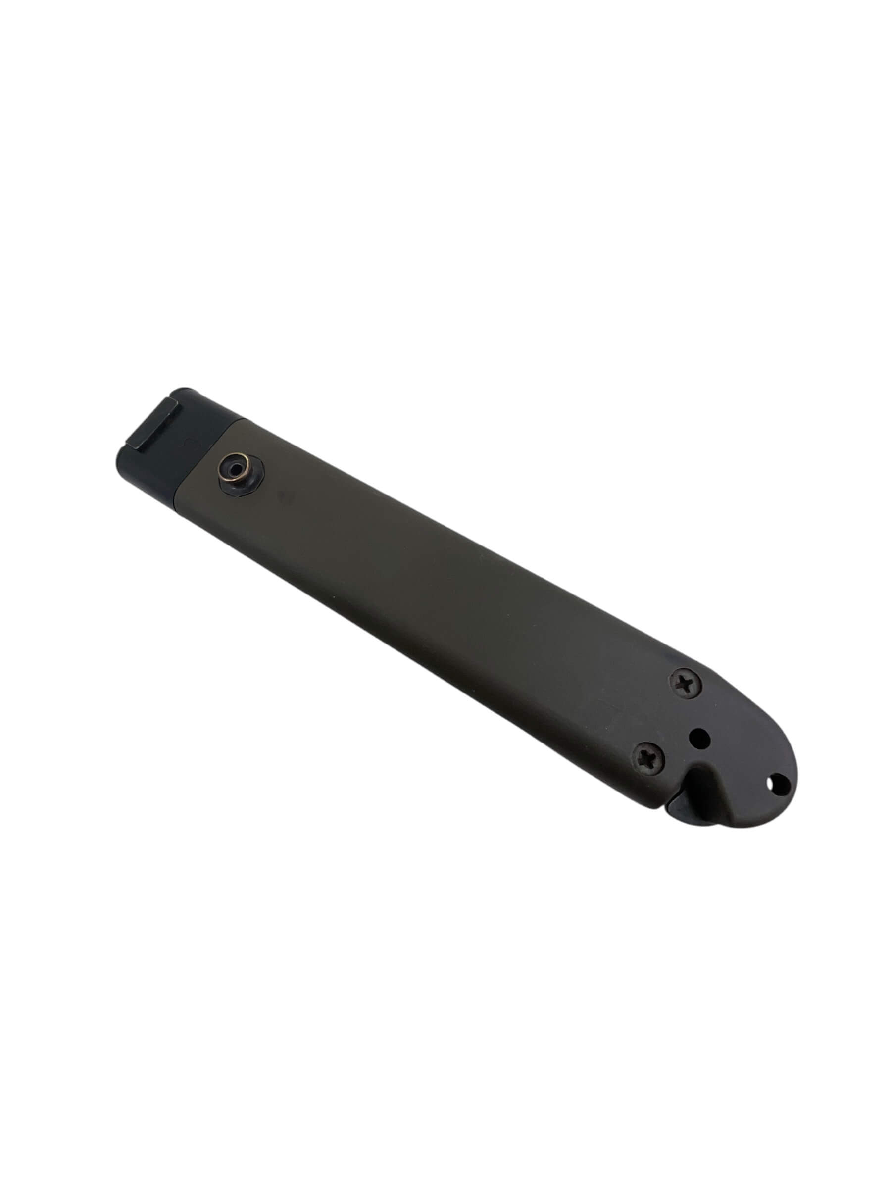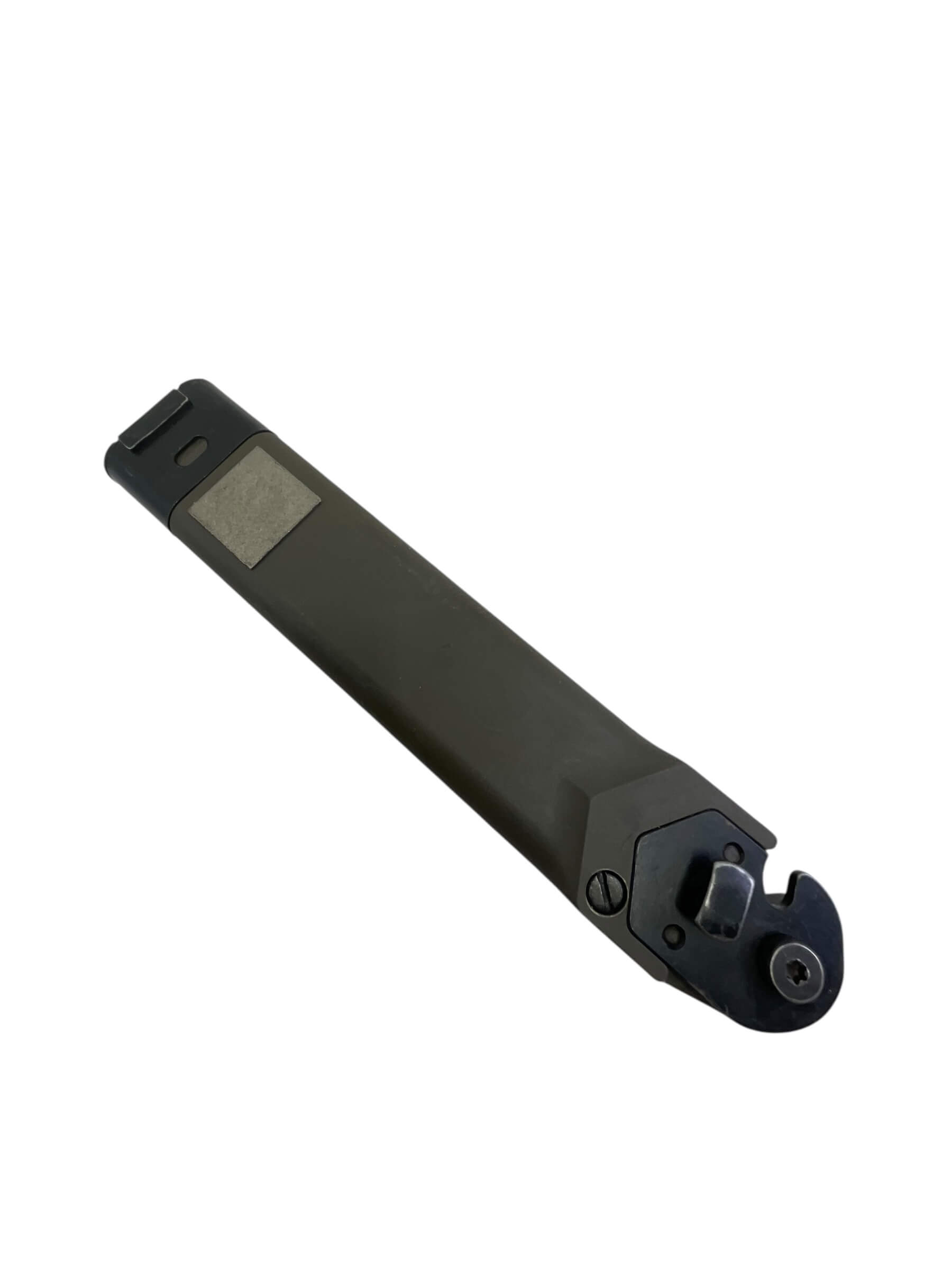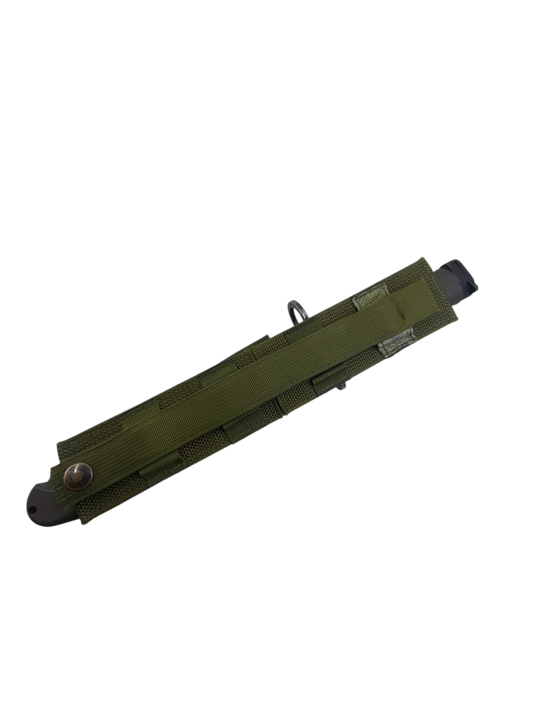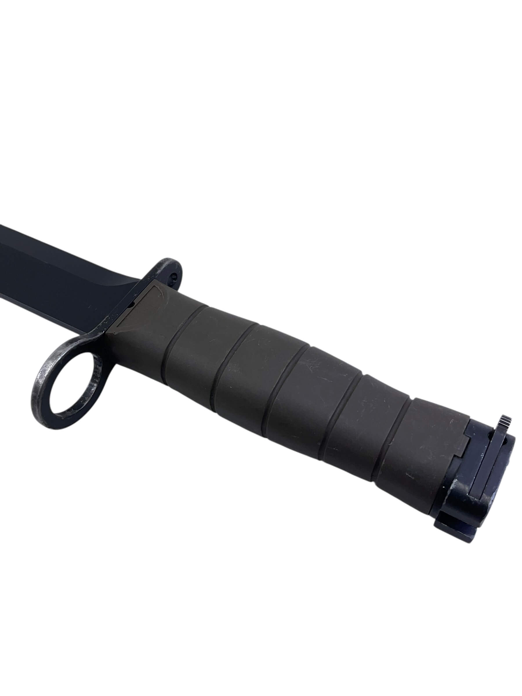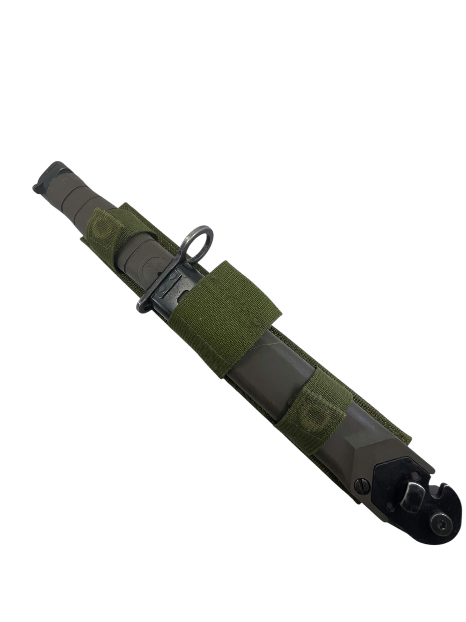 The Canadian Forces C7 Eickhorn Bayonet with Scabbard is a military-issued edged weapon designed for compatibility with the C7 rifle, the standard service rifle of the Canadian Armed Forces since the 1980s. Manufactured by the German company Eickhorn, this bayonet follows the NATO-standard design developed for the M16 rifle. It features a 7-inch (approximately 18 cm) spear-point blade constructed from corrosion-resistant steel, providing durability and utility in field conditions. The handle is composed of high-impact synthetic material, textured for a secure grip. The included scabbard is fashioned from tough polymer and incorporates a sharpening stone and a wire-cutting device, enhancing its functional value for soldiers. Attachment to the C7 rifle is achieved via a standardized crossguard and locking mechanism. This example represents a typical sidearm issued to Canadian military personnel and is consistent with NATO bayonet standards from the late 20th century onwards.