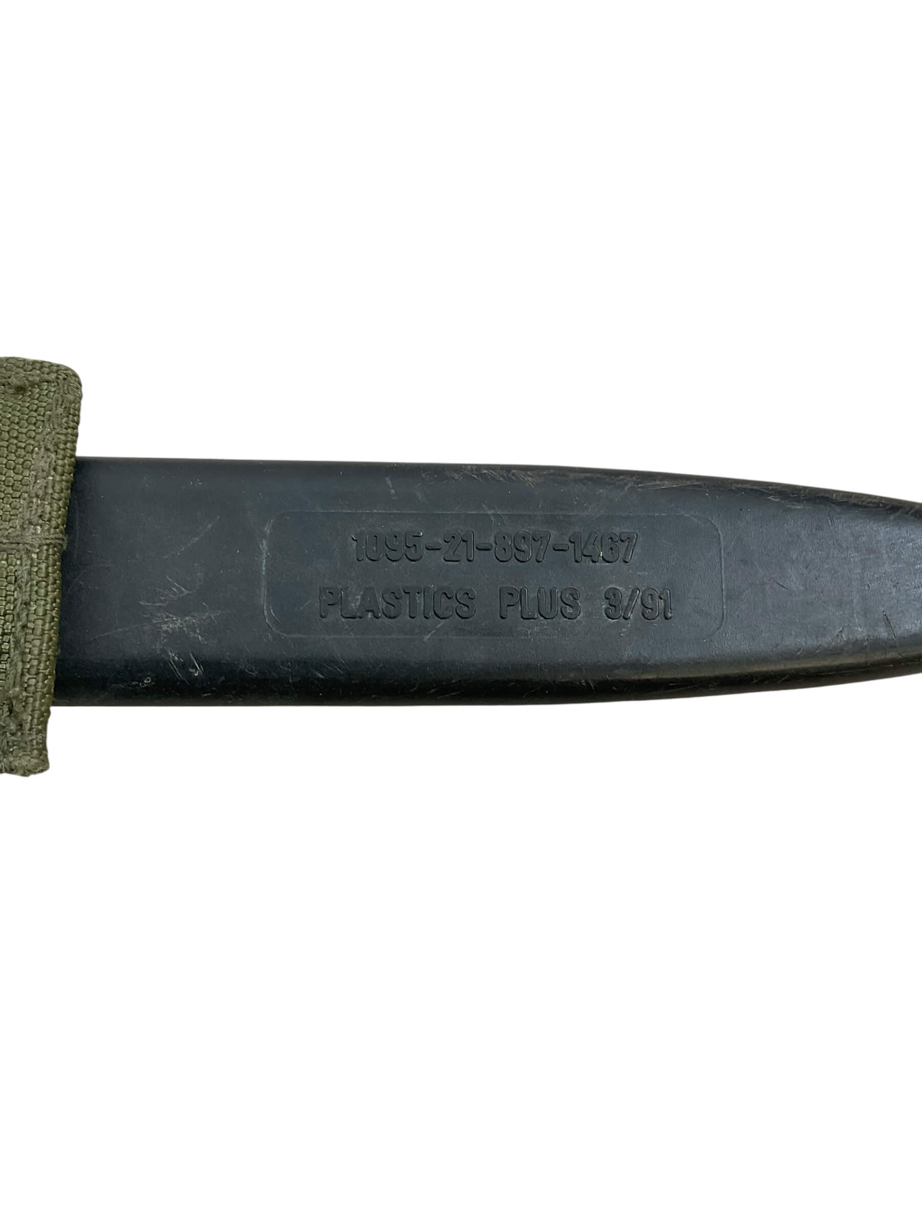 The ‘Canadian Forces C7 Nella Bayonet Frog and Scabbard’ is a set of military-grade equipment used by the Canadian Armed Forces. It is a two-part set that includes the ‘Frog’ or holder and the ‘Scabbard’, a protective cover for the bayonet. The C7 Nella Bayonet Frog is designed to securely hold the bayonet when not in use and can be attached to the soldier’s belt or other gear for easy access. On the other hand, the Scabbard is a robust cover that protects the bayonet from getting damaged, dull, or rusty. Both items are made of high-quality and durable materials that can withstand harsh field conditions. This set is not just a piece of military equipment but also an important part of Canadian military history.