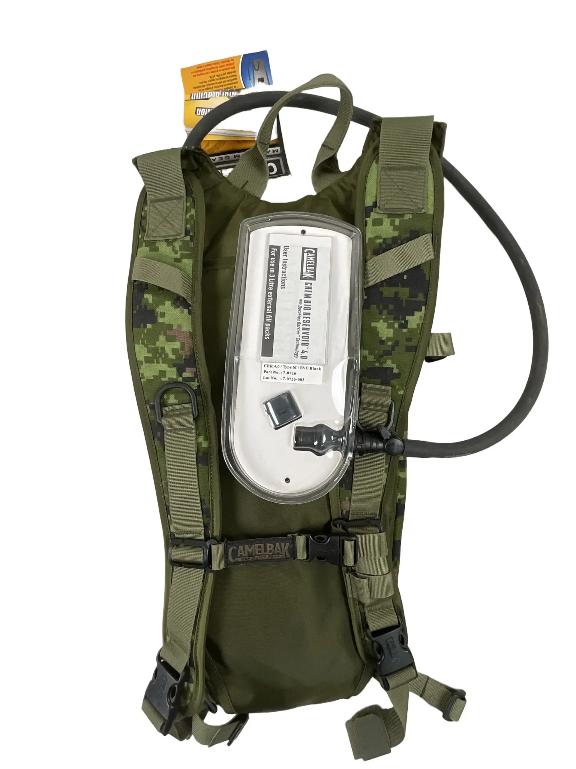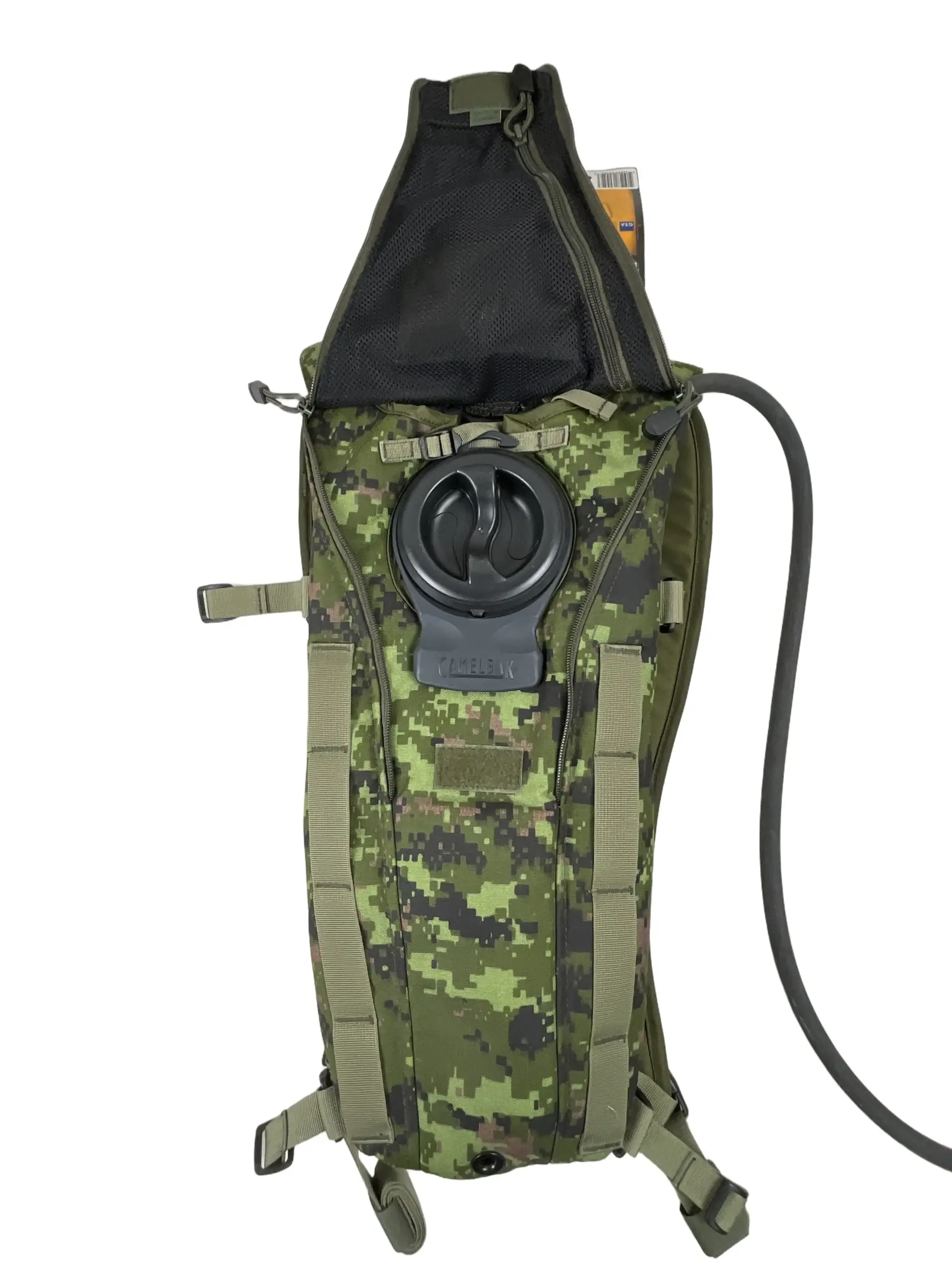 The Canadian Forces CADPAT Camelbak is a hydration system issued to military personnel in the Canadian Armed Forces. This item is new and unused. It features the distinct CADPAT (Canadian Disruptive Pattern) camouflage, designed for effective concealment in temperate woodland environments. The Camelbak system comprises a durable nylon carrier in CADPAT green and a removable, food-grade reservoir with a standard capacity of approximately 3 liters. The carrier is equipped with adjustable shoulder straps and attachment points for integration with field gear or bergen rucksacks. The bite valve allows for hands-free hydration while on the move. This model was introduced as part of efforts to modernize load-bearing and hydration equipment for Canadian ground forces in the 21st century. The design prioritizes reliability, ease of cleaning, and compatibility with other issued equipment. The CADPAT Camelbak remains a practical example of contemporary military gear standardized in Canadian service.