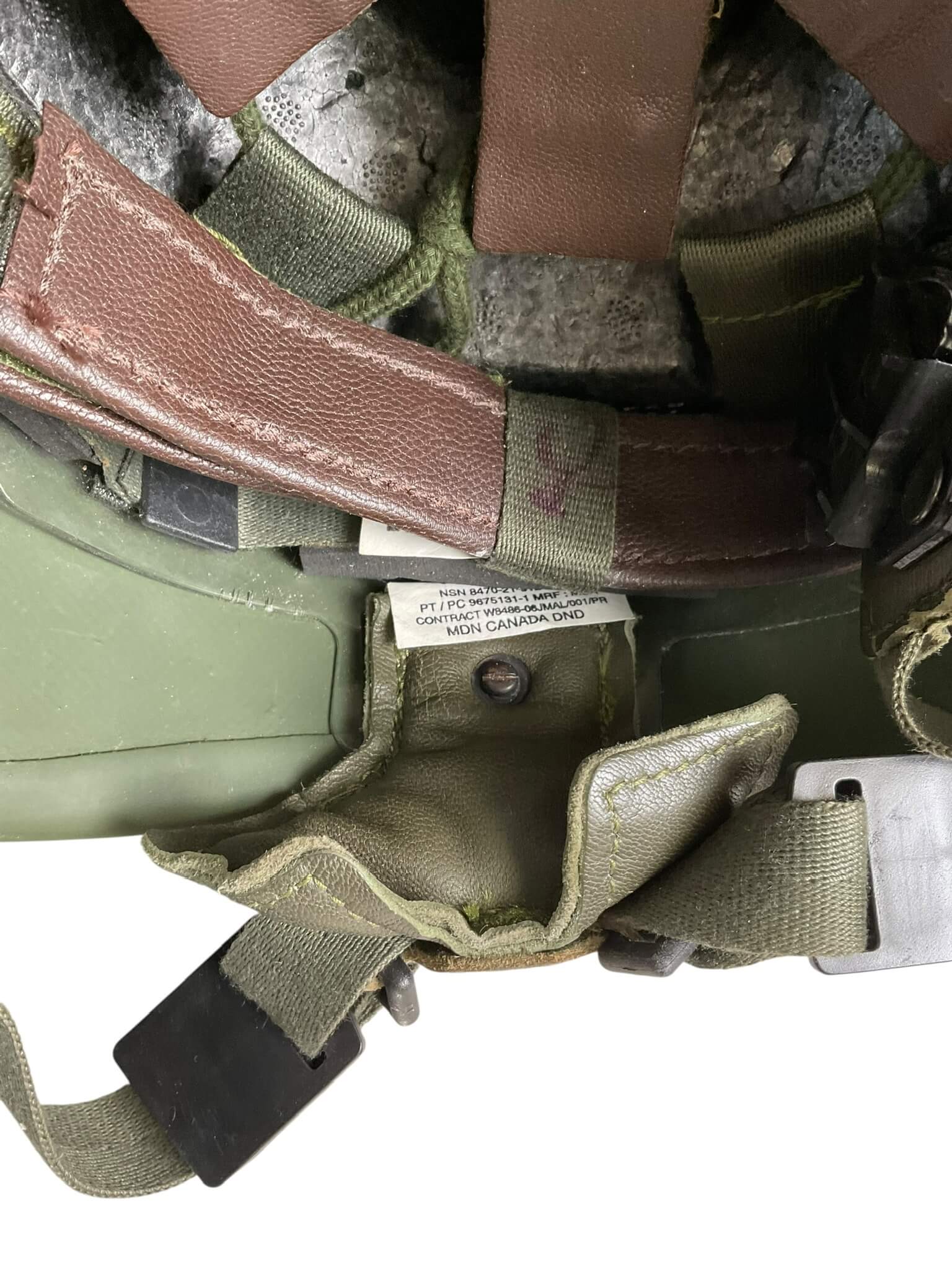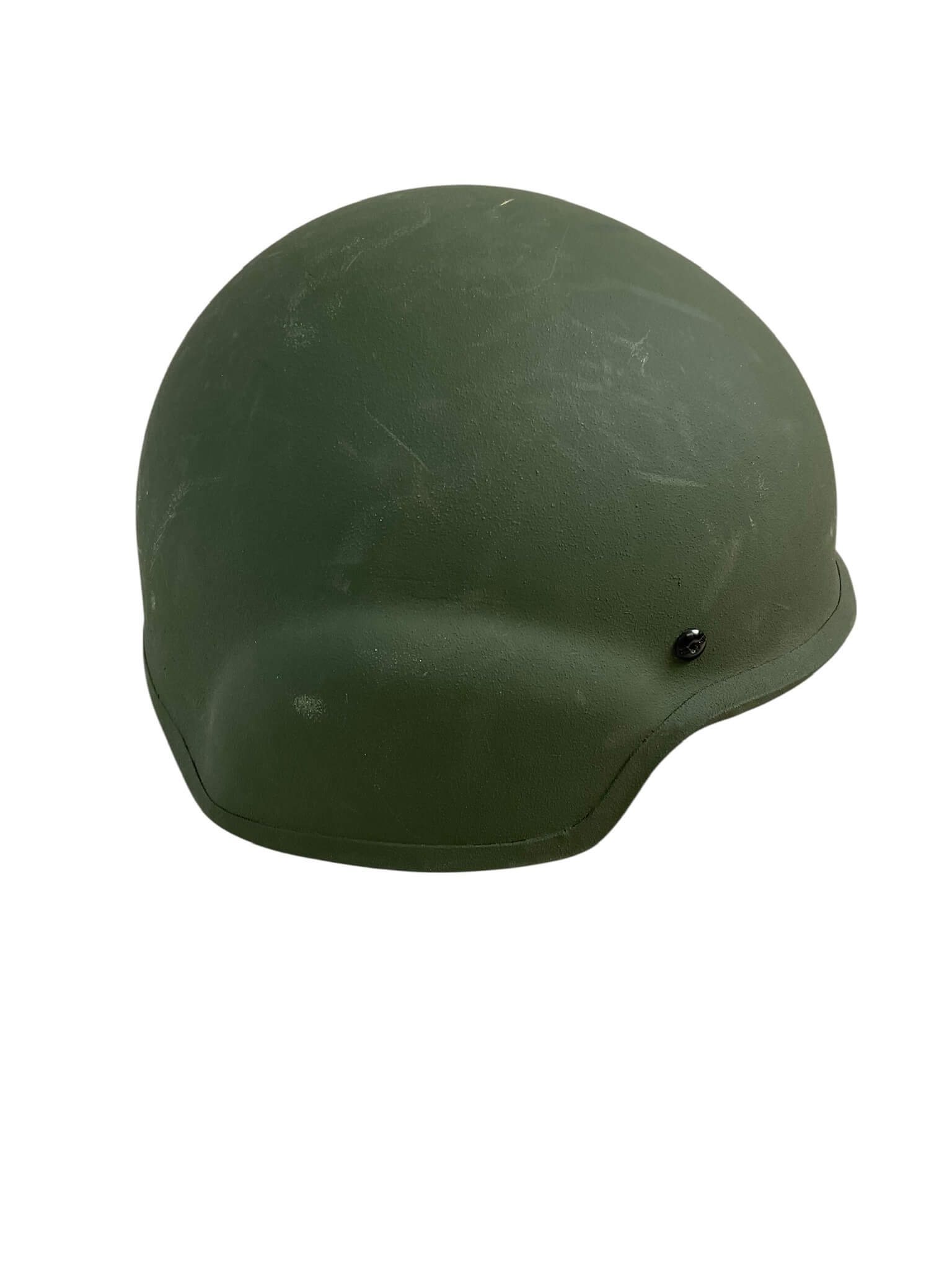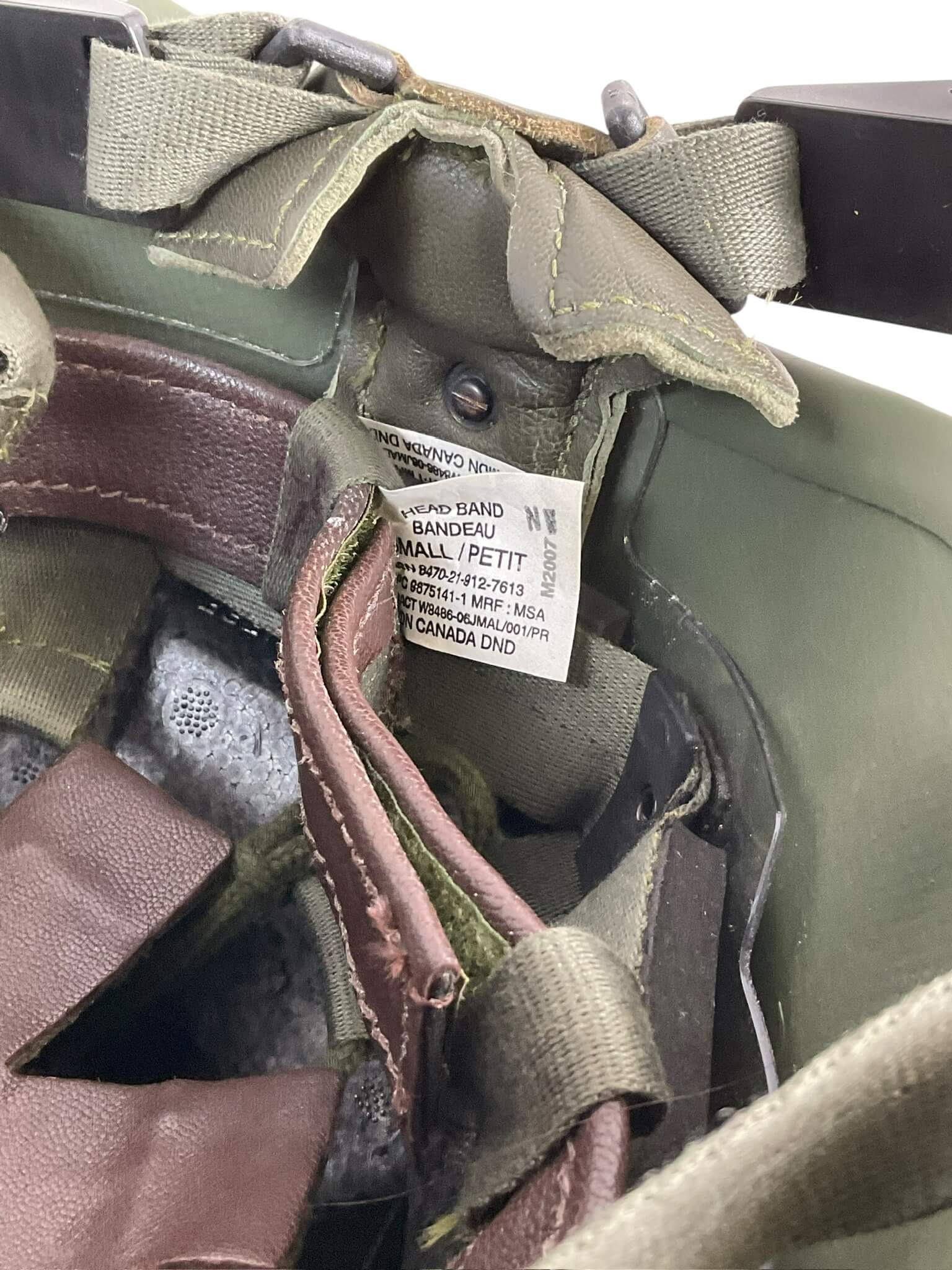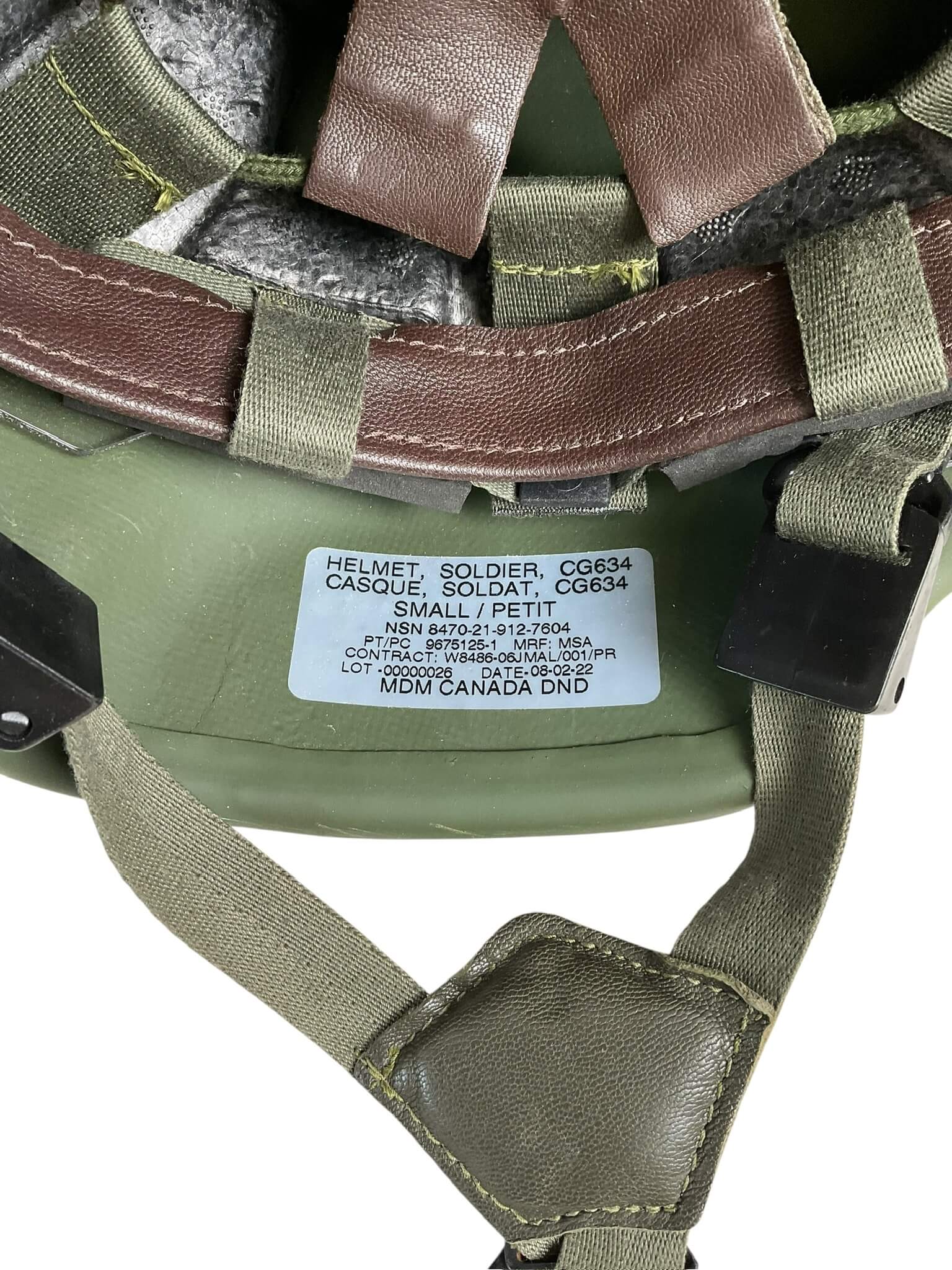 The Canadian Forces CG634 Helmet, size Small, is a military-grade safety gear used by the Canadian Armed Forces. Key features include a robust Kevlar shell for ballistic protection, a comfortable liner for fit adjustment, and a four-point chinstrap. Made for small-sized head circumference and noted for its durable quality.
