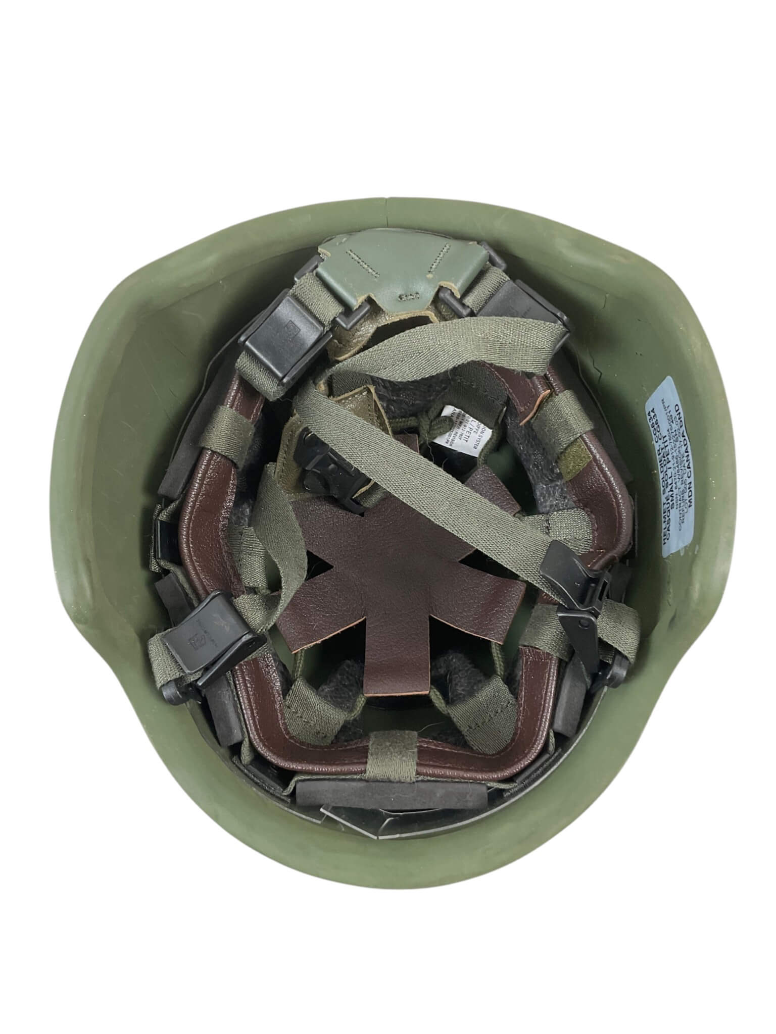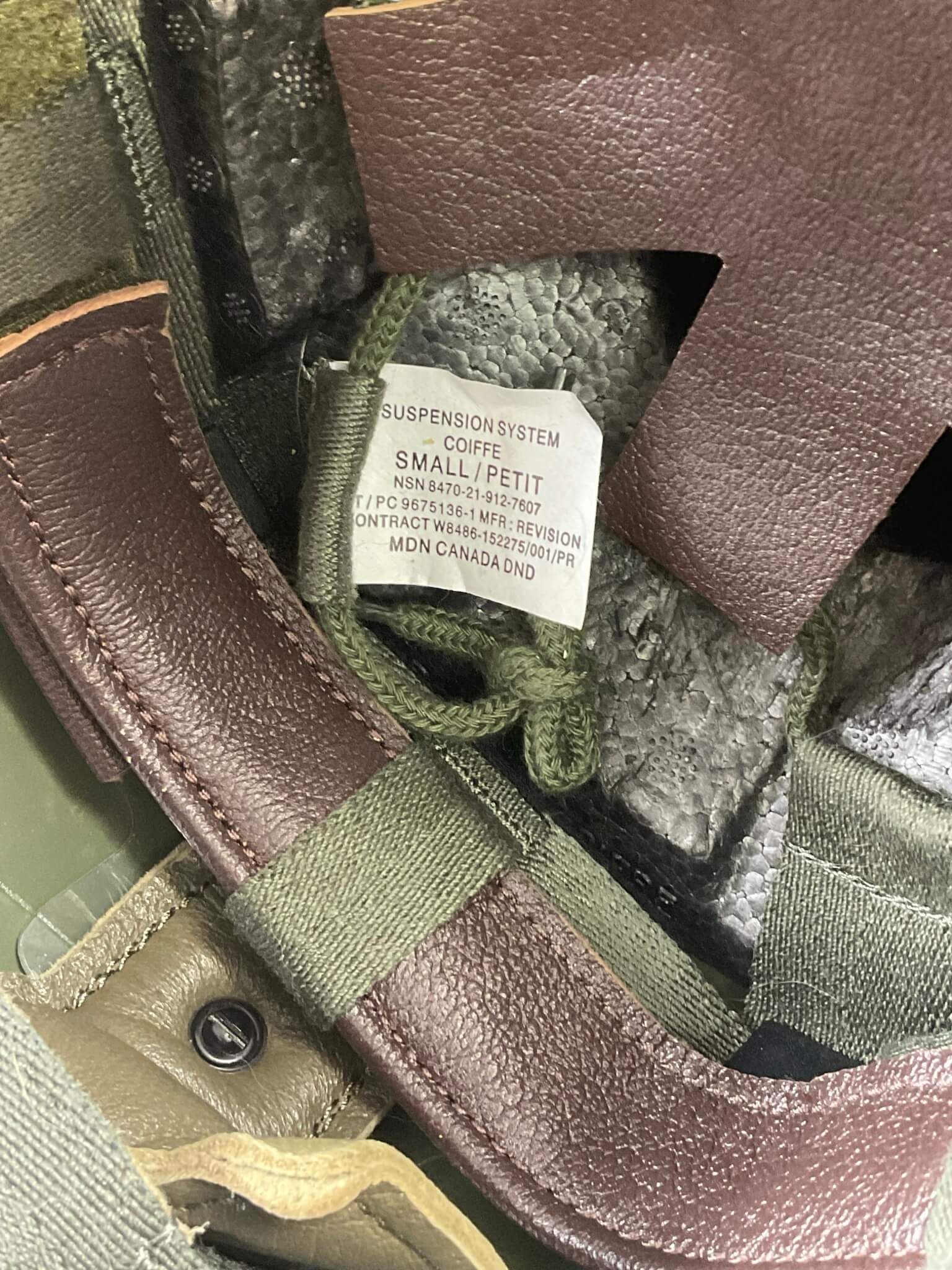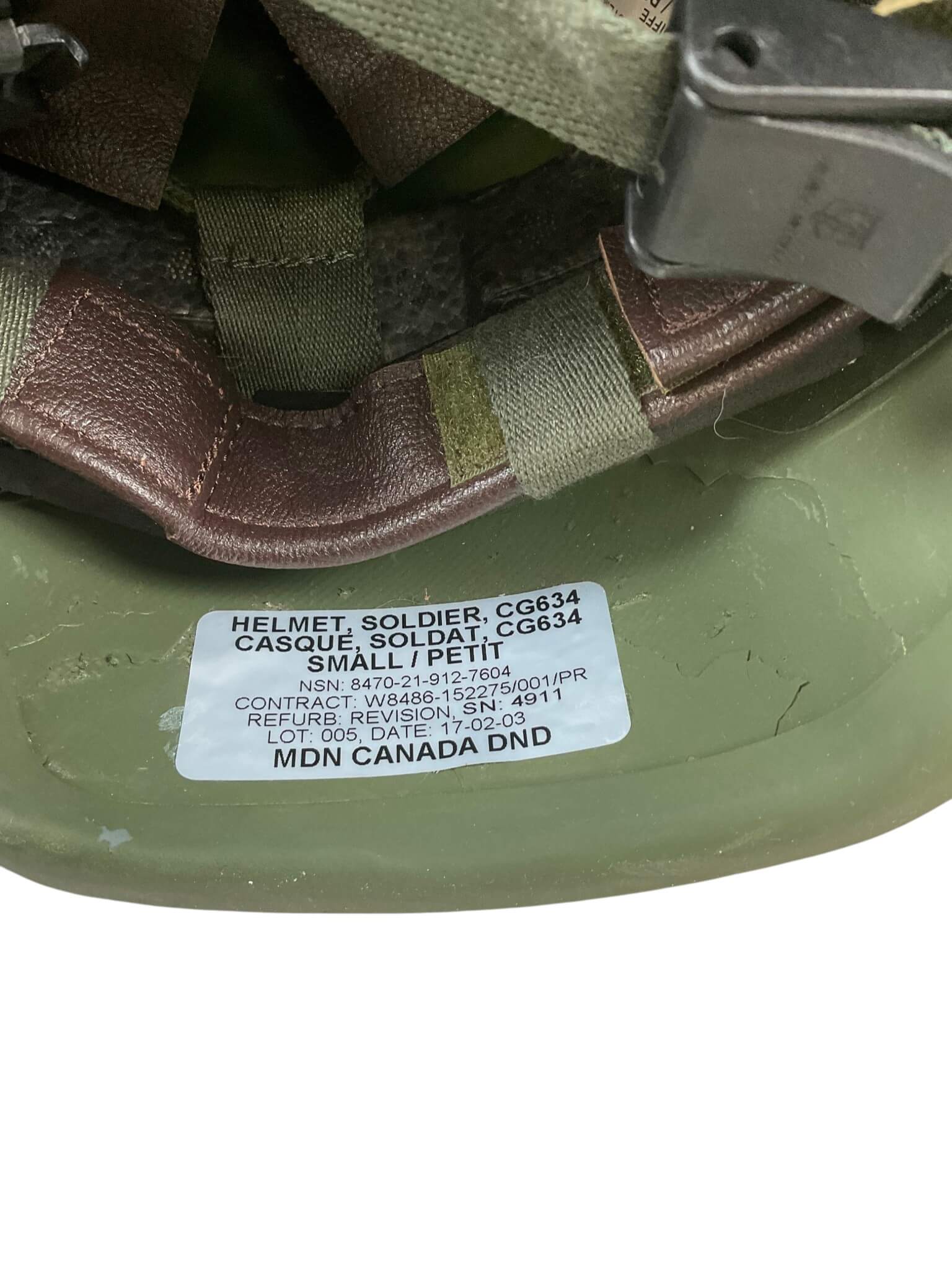 The Canadian Forces CG634 Helmet, Size Small, is a standard-issue ballistic helmet used by the Canadian military. Introduced in the late 1990s, the CG634 replaced older helmet models, offering enhanced protection and comfort for service personnel. Constructed from advanced aramid fiber materials, the helmet is designed to provide ballistic and impact resistance. The exterior features a matte, non-reflective finish, typically in olive drab or compatible camouflage patterns. Internally, the helmet incorporates a padded suspension system and adjustable chin strap to improve fit and stability during use. The CG634 accommodate various accessories, including night vision mounts and communication gear, through dedicated attachment points. This item represents a key development in Canadian military headgear, reflecting evolving standards for soldier safety and operational effectiveness. Size small is intended for individuals with a smaller head circumference, ensuring an appropriate and secure fit. The CG634 remains in operational use by the Canadian Armed Forces.