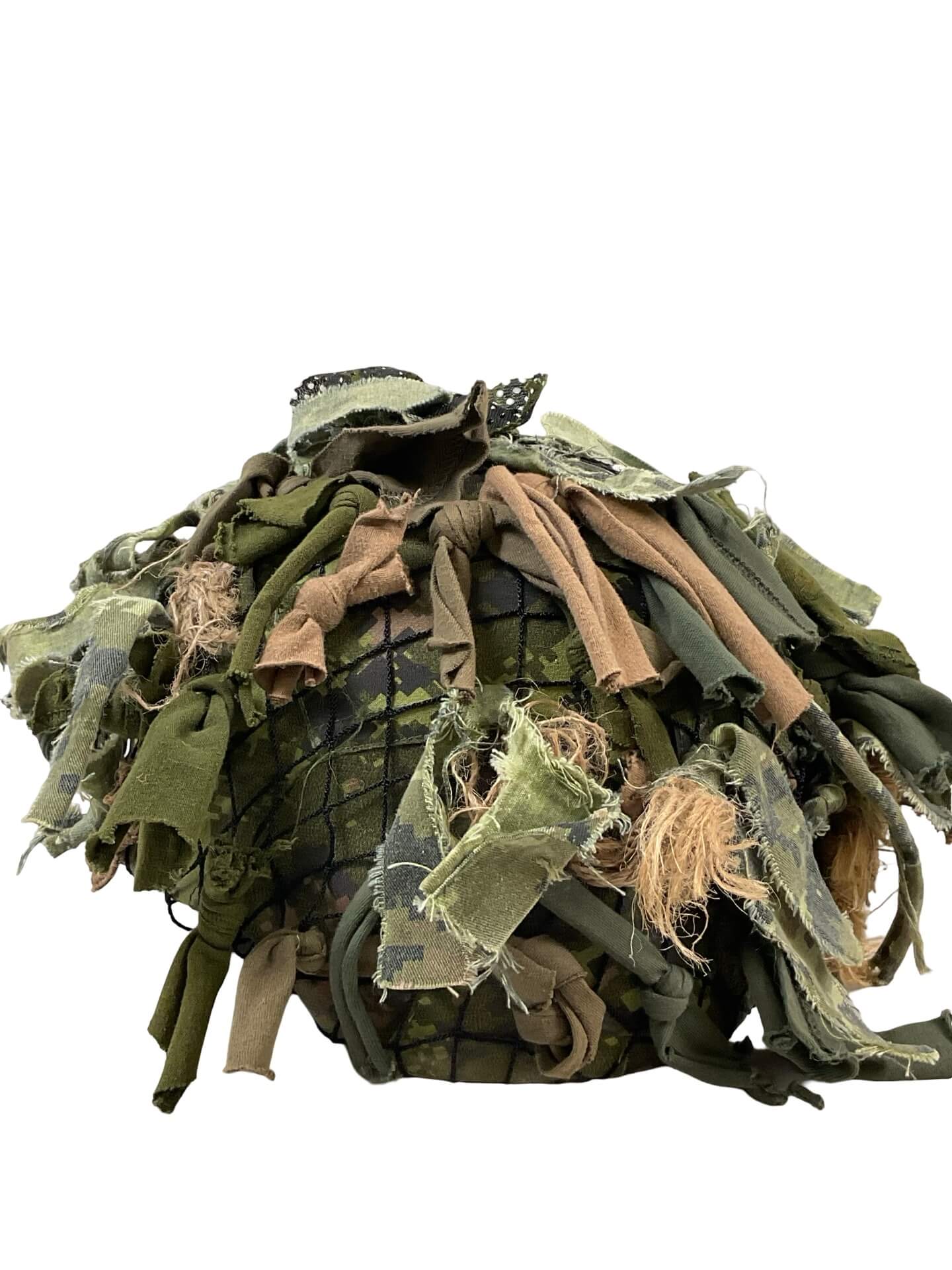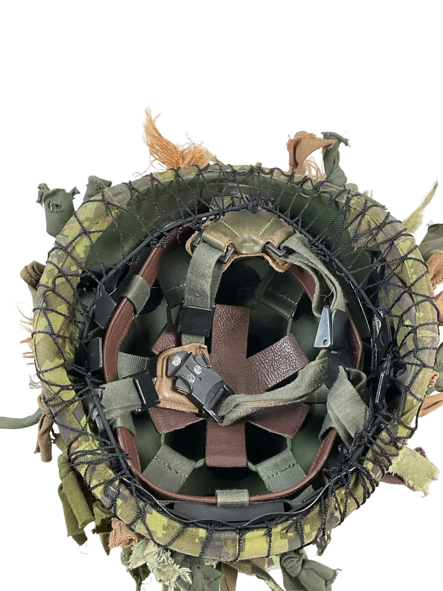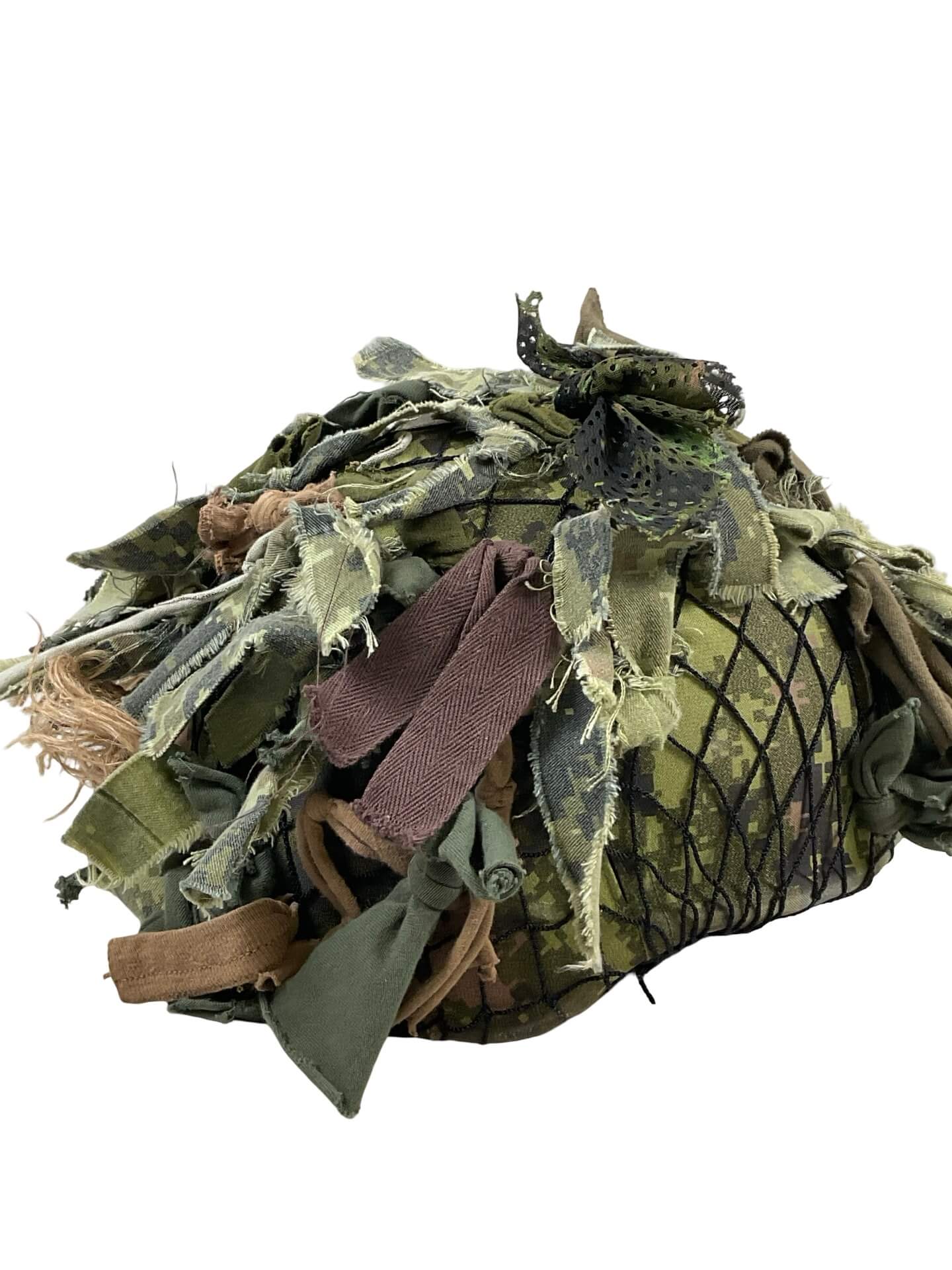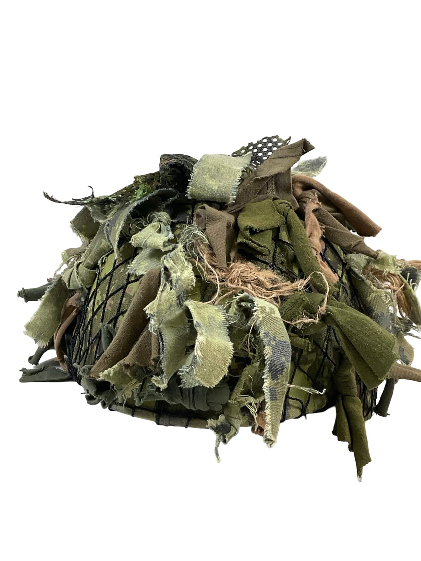 The Canadian Forces CG634 Helmet is a standard-issue combat helmet adopted by the Canadian military in the late 1990s to replace the previous steel model. This example is a size Medium and is provided with its operational CADPAT (Canadian Disruptive Pattern) camouflage fabric cover, which is designed to reduce visibility in a variety of terrain common throughout Canada and in deployed environments. Also included is the original scrim net, used for attaching additional camouflage materials or foliage to enhance concealment. The CG634 is constructed from advanced composite materials, offering improved ballistic protection and comfort compared to earlier designs. The helmet features adjustable internal padding and a secure chin strap system. Widely used by Canadian Forces personnel in Afghanistan and other theatres, the CG634 with CADPAT cover and scrim net represents current-issue Canadian military headgear. This item is intended for collectors or those with an interest in modern military equipment.