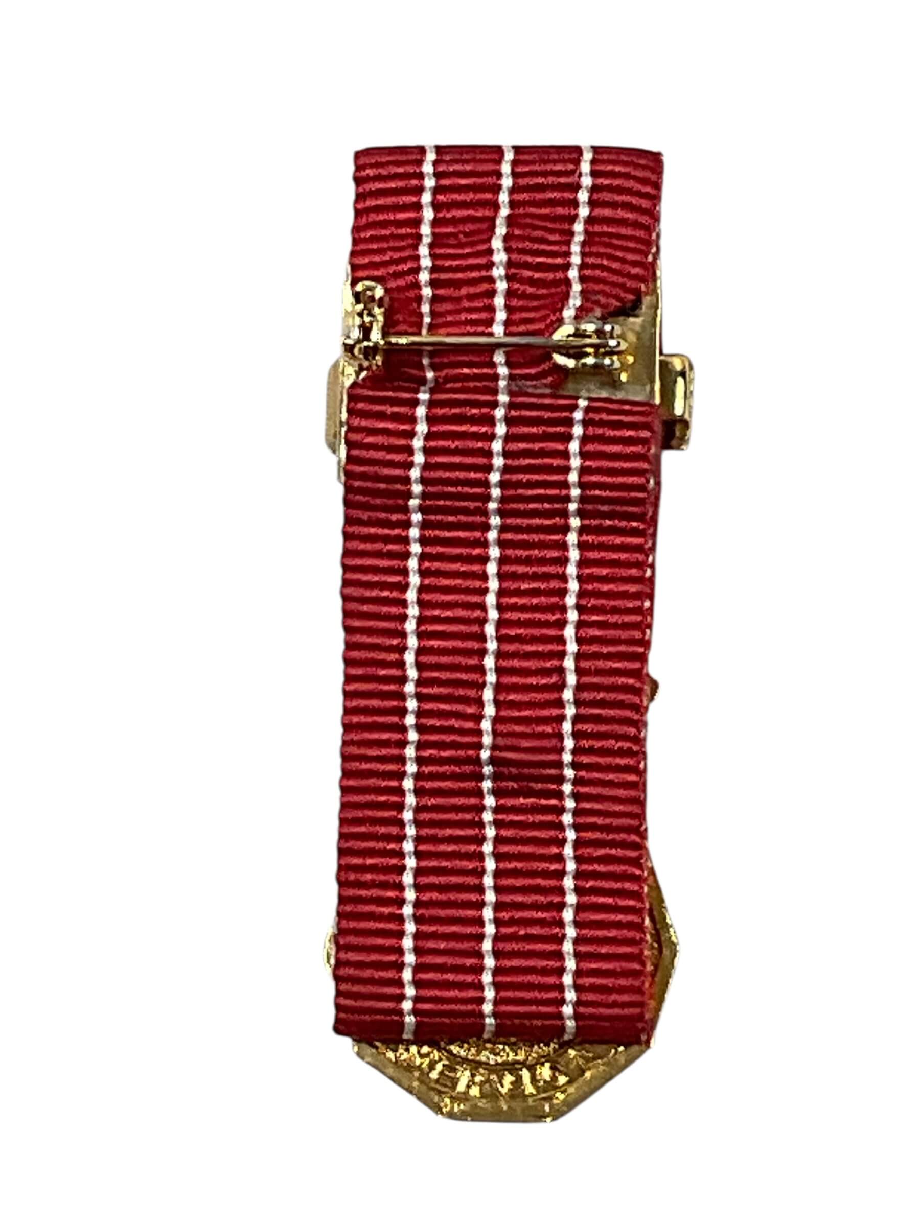 The Canadian Forces Decoration (CD) Miniature Medal with Bar is a small-scale representation of the full-sized Canadian Forces Decoration, awarded to members of the Canadian Forces for twelve years of service. The decoration recognizes both regular and reserve service, with additional service bars denoting ten-year increments beyond the initial qualification. This miniature version is crafted according to official specifications, featuring a maple leaf and crown design on the obverse, surrounded by a laurel wreath. The attached service bar is positioned on the ribbon to indicate extended service. The ribbon, in red with gold edges, reflects the official colors used for this distinction. Miniature medals are typically used for formal events and mess dress uniforms, providing a compact alternative to the full-sized decoration. The Canadian Forces Decoration remains an important recognition of long and meritorious military service within Canada’s Armed Forces.