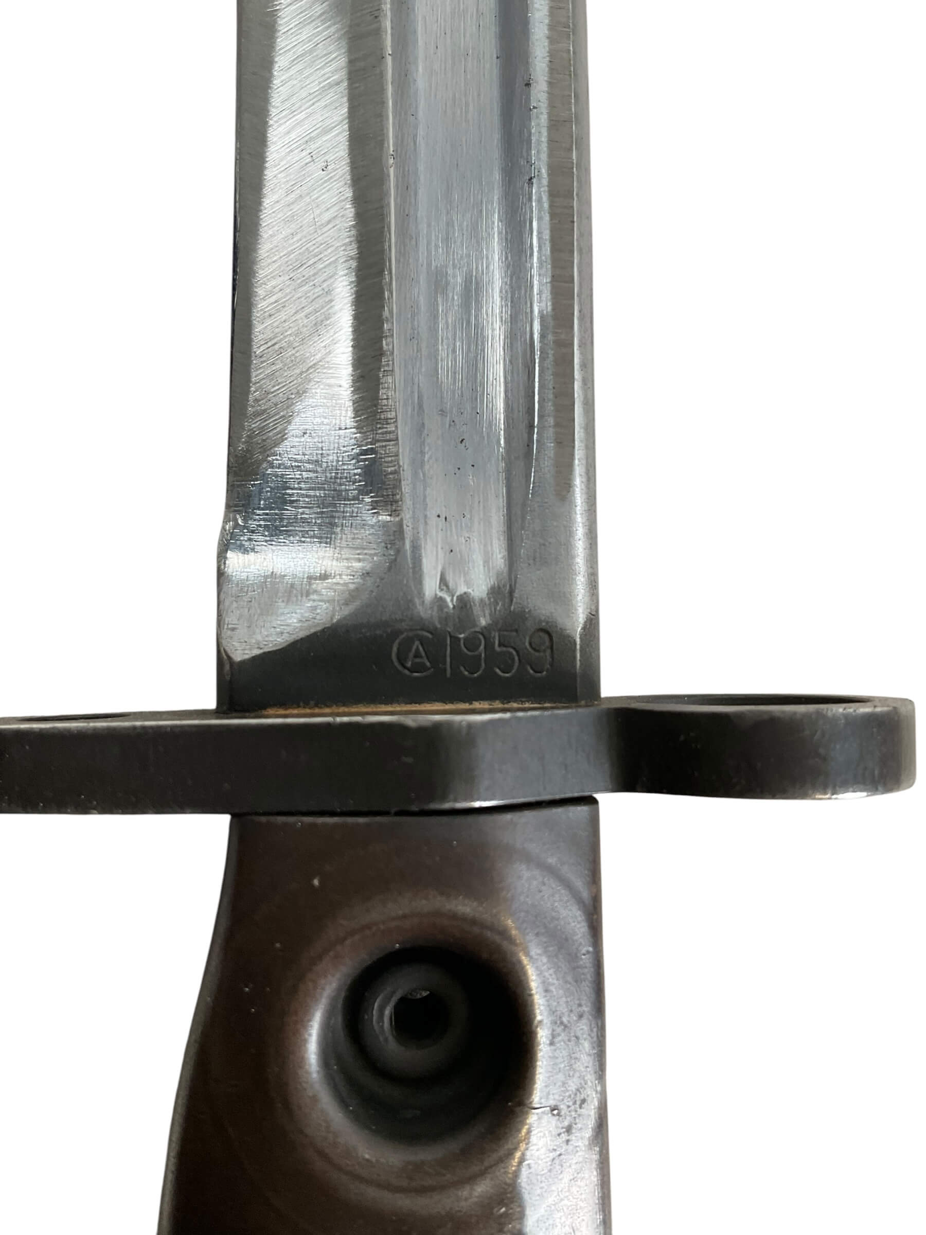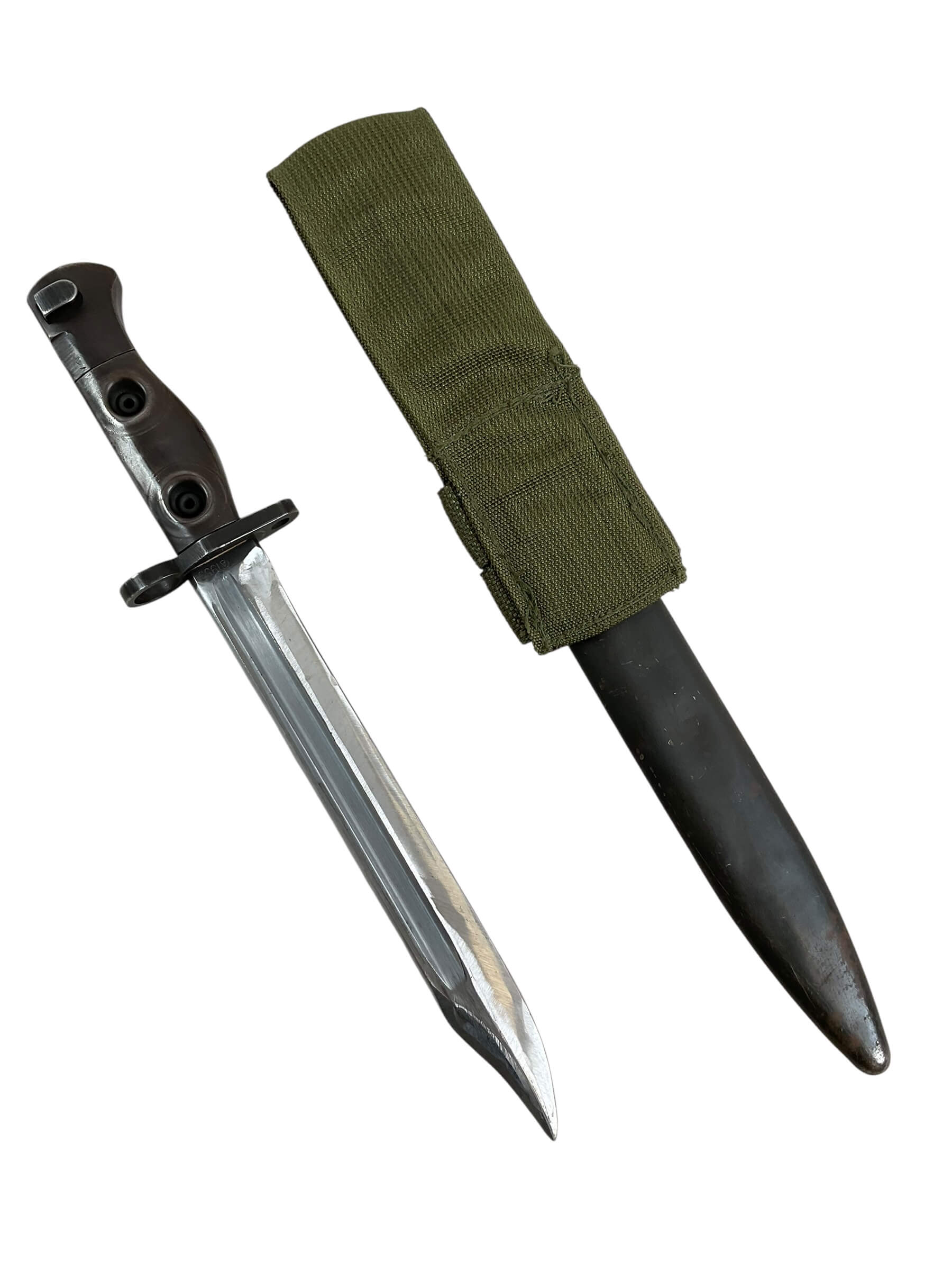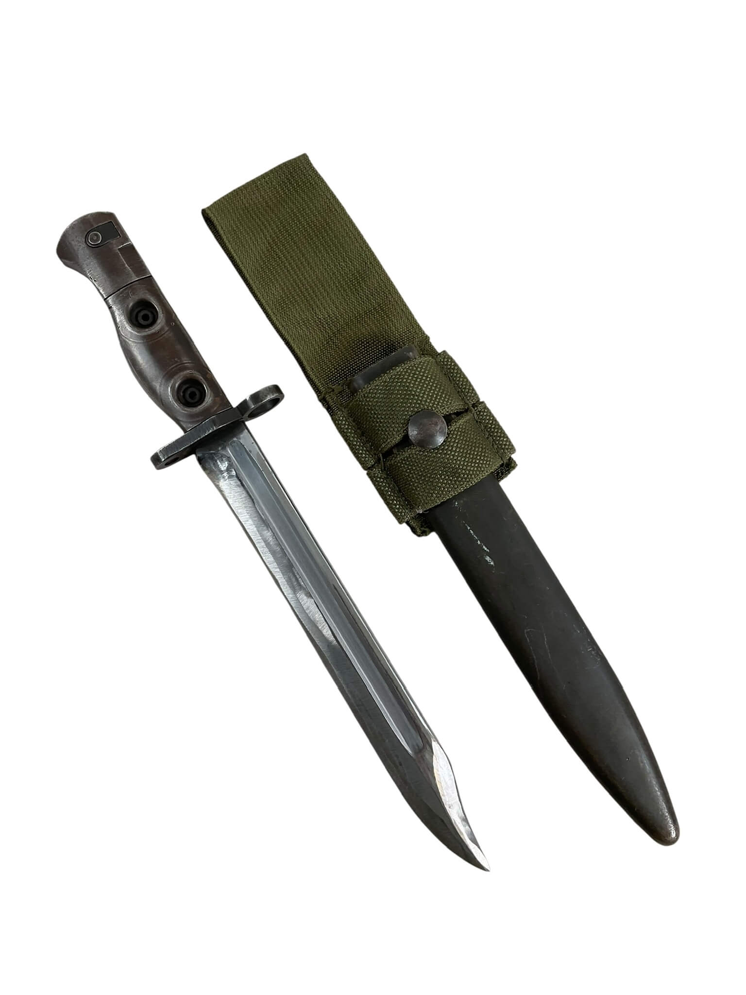 This item is a rare find for collectors and enthusiasts: a Canadian Forces FN C1 Bayonet with a 64 Pattern Frog, sharpened to perfection. This bayonet, utilized by the Canadian army, showcases the robust build and precision engineering reflective of its military origin. The 64 Pattern Frog, a distinct feature, is a type of carrier used to fasten the bayonet to a belt, designed for quick accessibility and ease of use. The blade has been expertly sharpened, enhancing its functionality and maintaining its integrity. The steel construction ensures durability, while the handle design provides a secure grip for handling. This piece serves as a remarkable representation of Canadian military history and an excellent addition to any collection. Its authenticity and quality make it a valuable asset for collectors around the world.